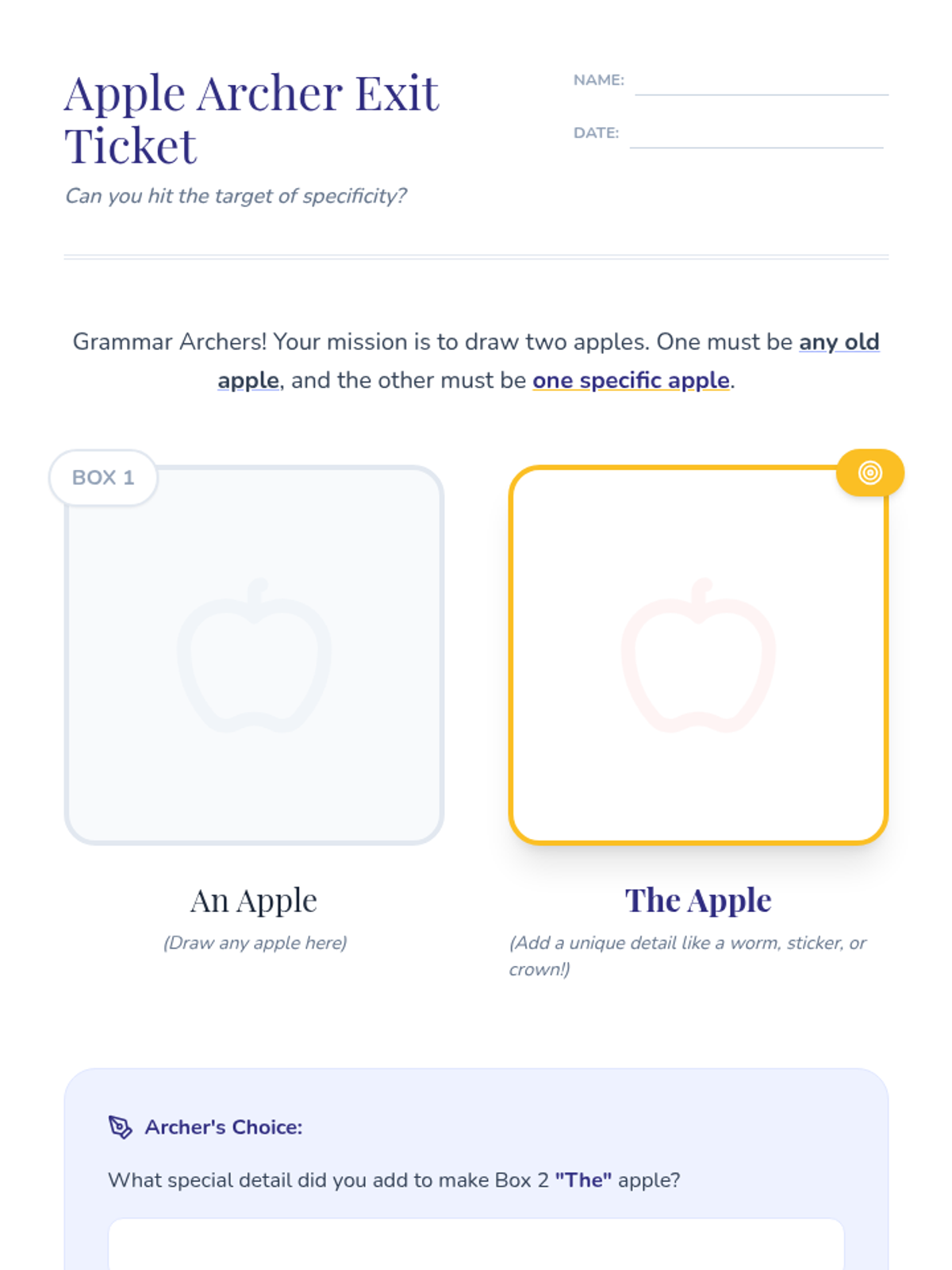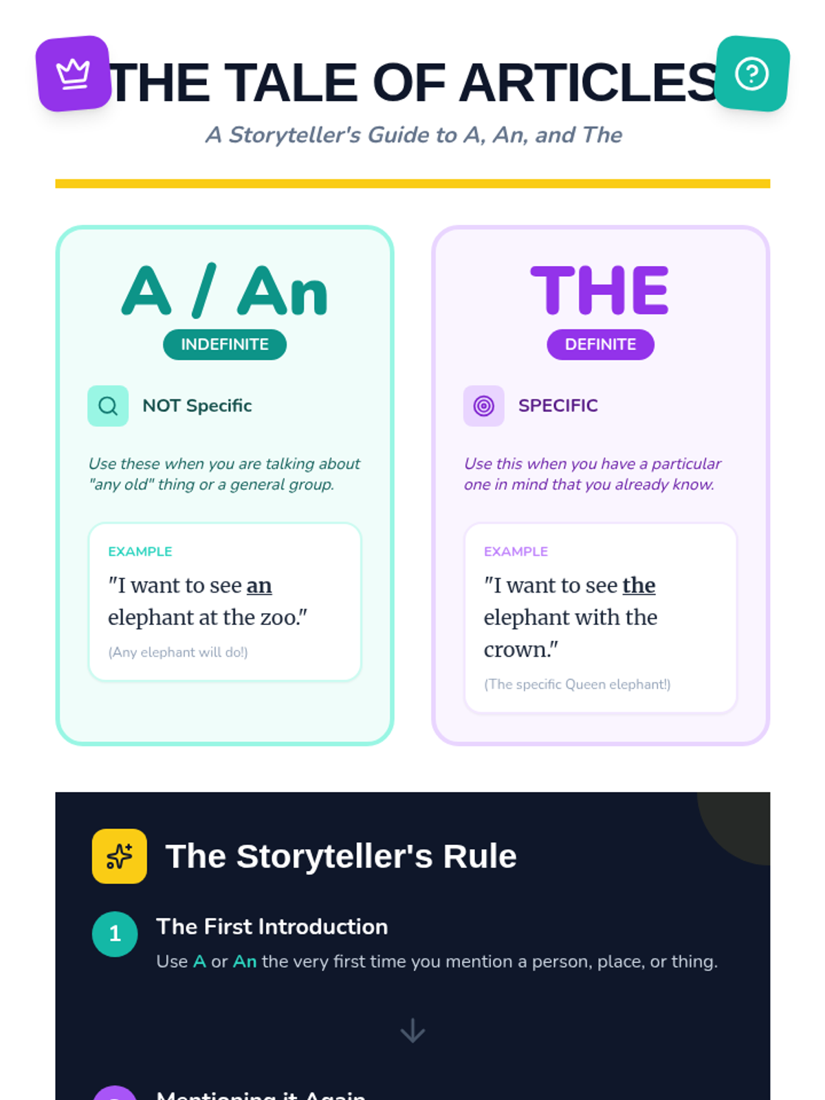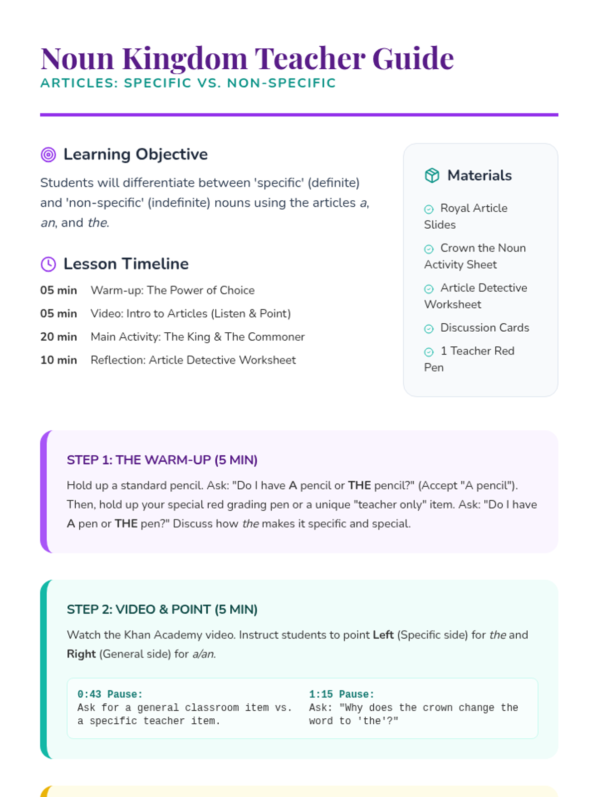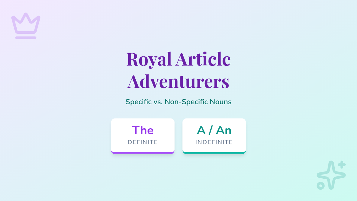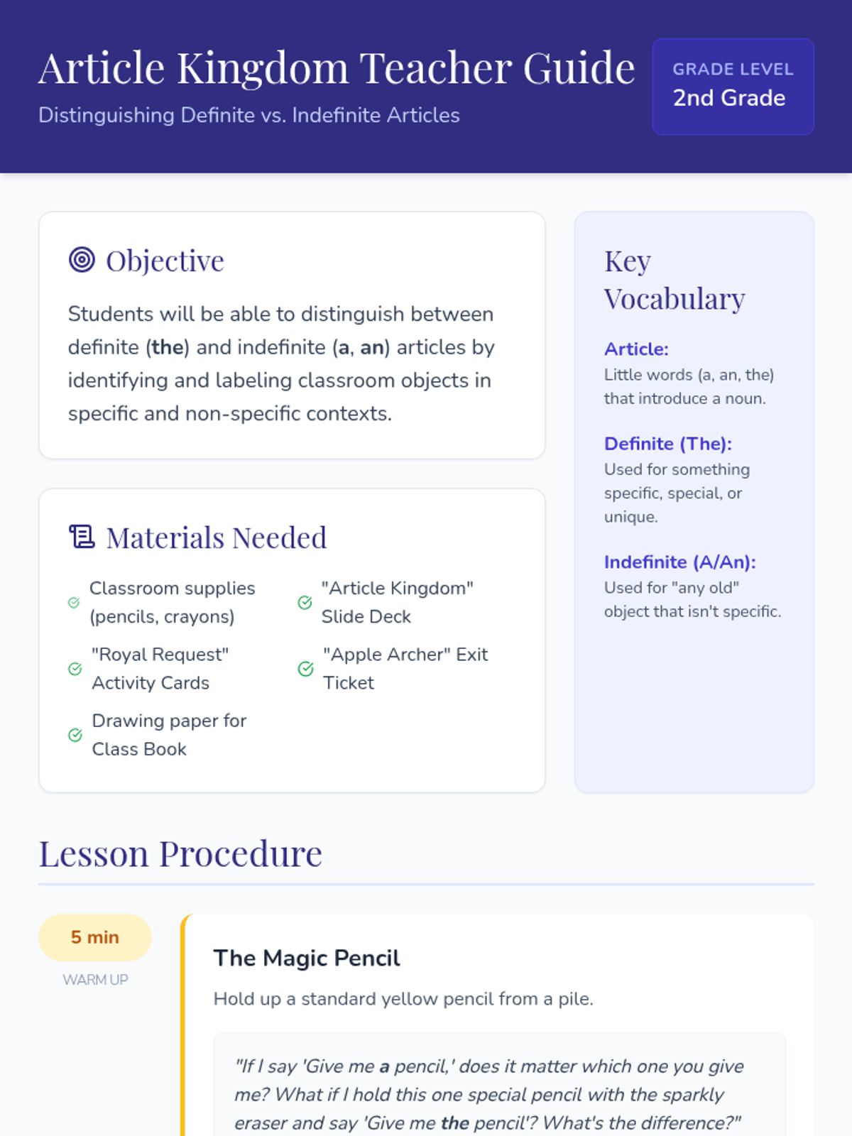 A comprehensive 2nd-grade lesson on articles (a, an, the), teaching students to distinguish between specific (definite) and non-specific (indefinite) nouns through a royal-themed lens.