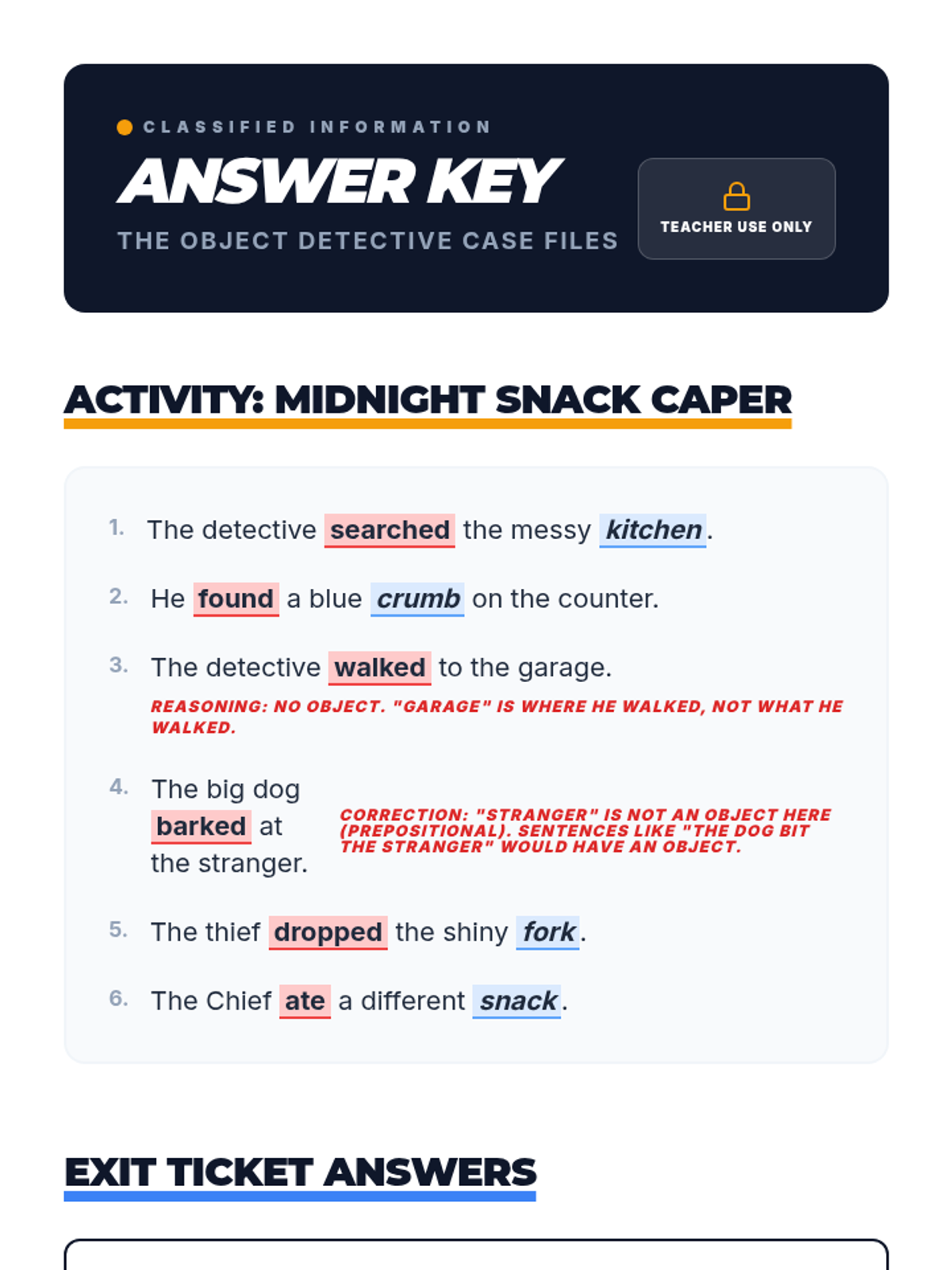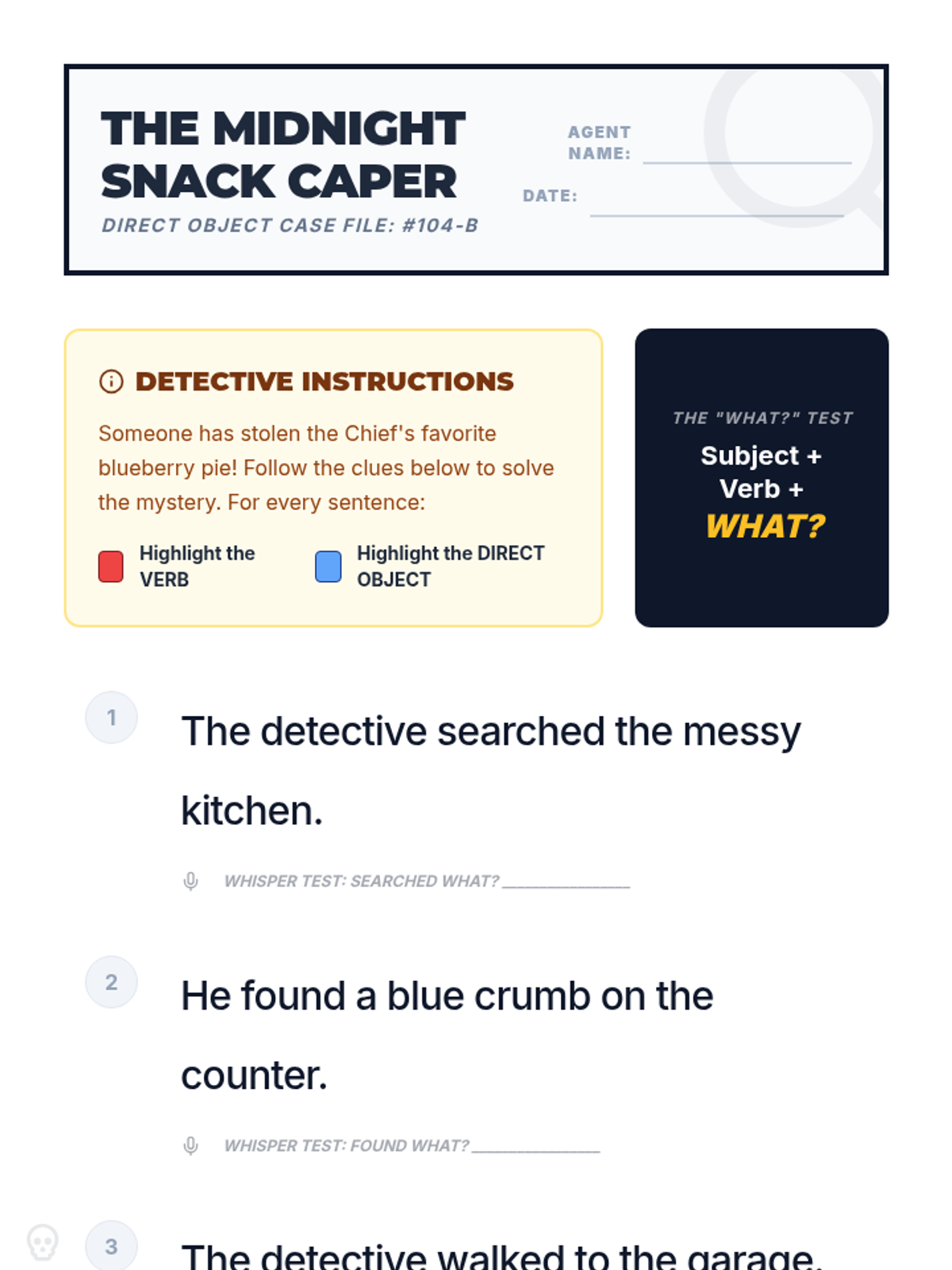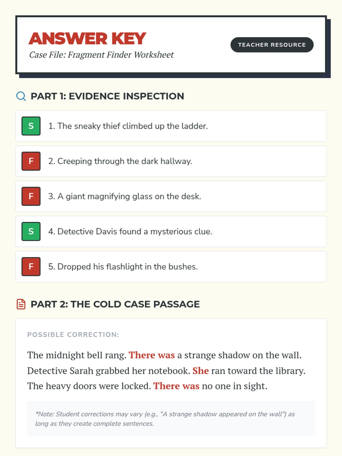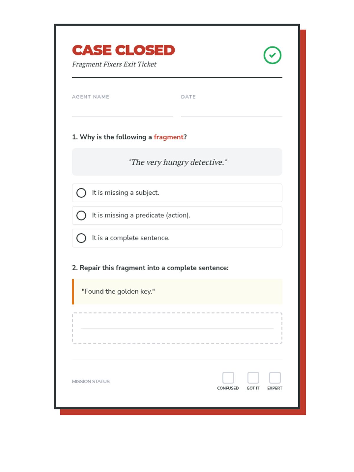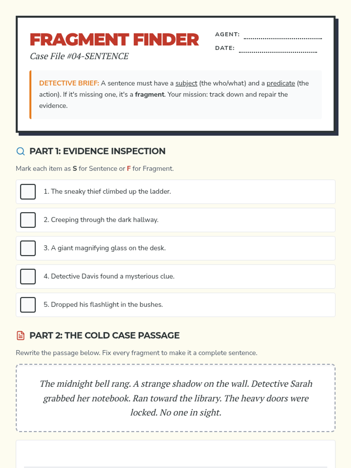 A lesson focused on identifying and repairing sentence fragments through detective-themed activities, designed for independent 4th-grade work.