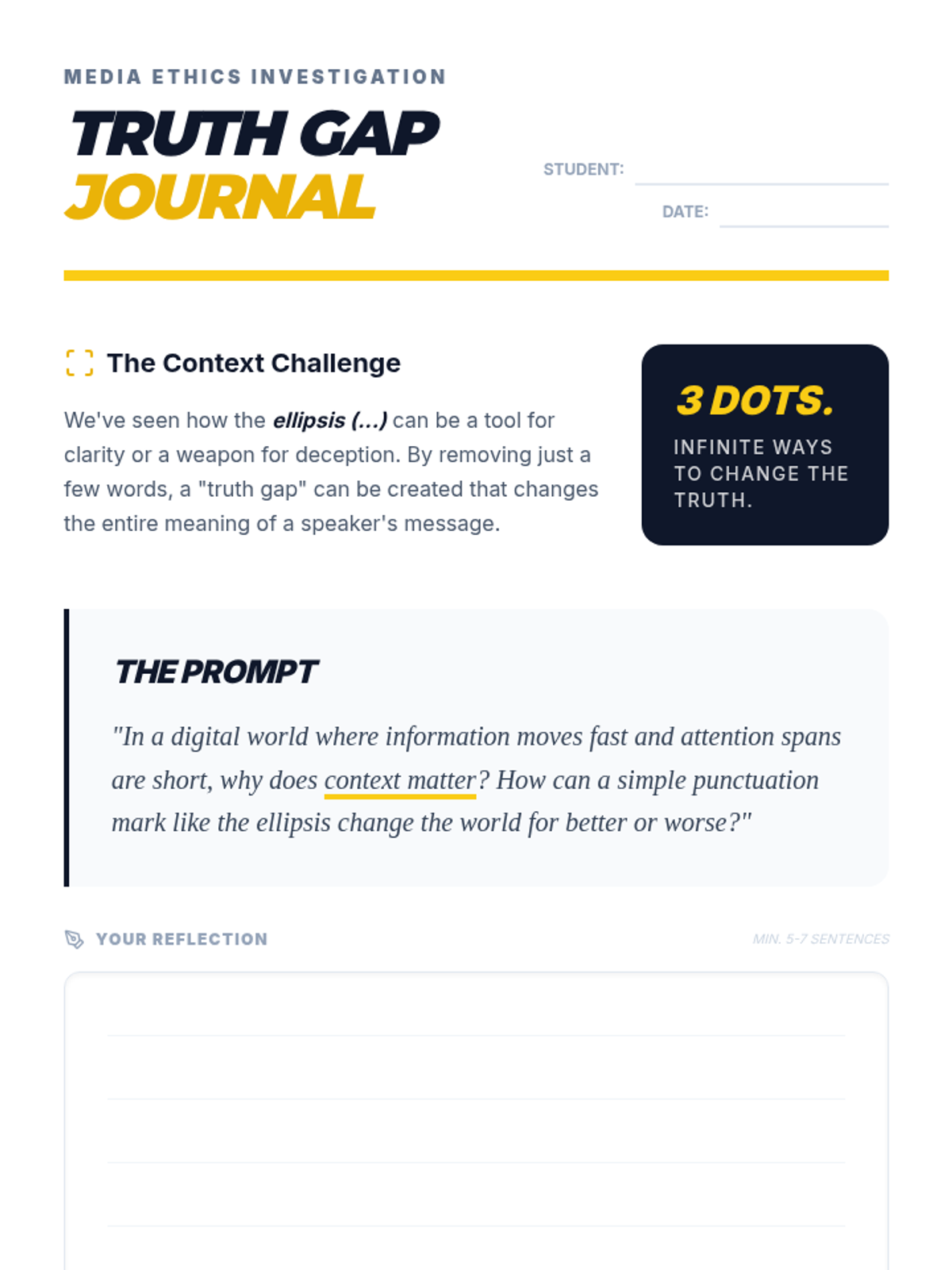 Students explore the ethics of punctuation, specifically how ellipses can be used to omit information and alter the truth in media and quotes.