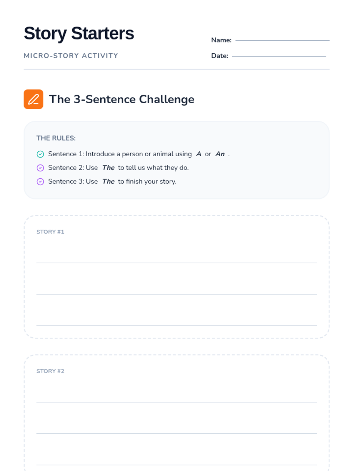 A grammar lesson for 3rd graders focused on using definite and indefinite articles (a, an, the) to introduce and track nouns in narrative writing. Students will analyze the 'introductory rule' through a Khan Academy video and practice writing micro-stories.