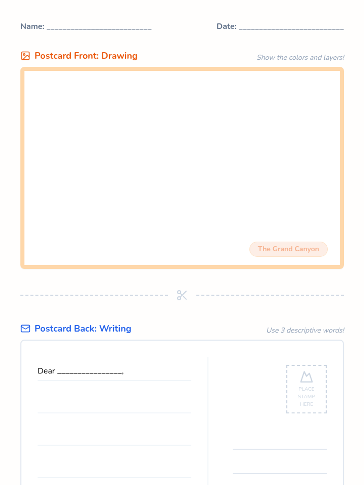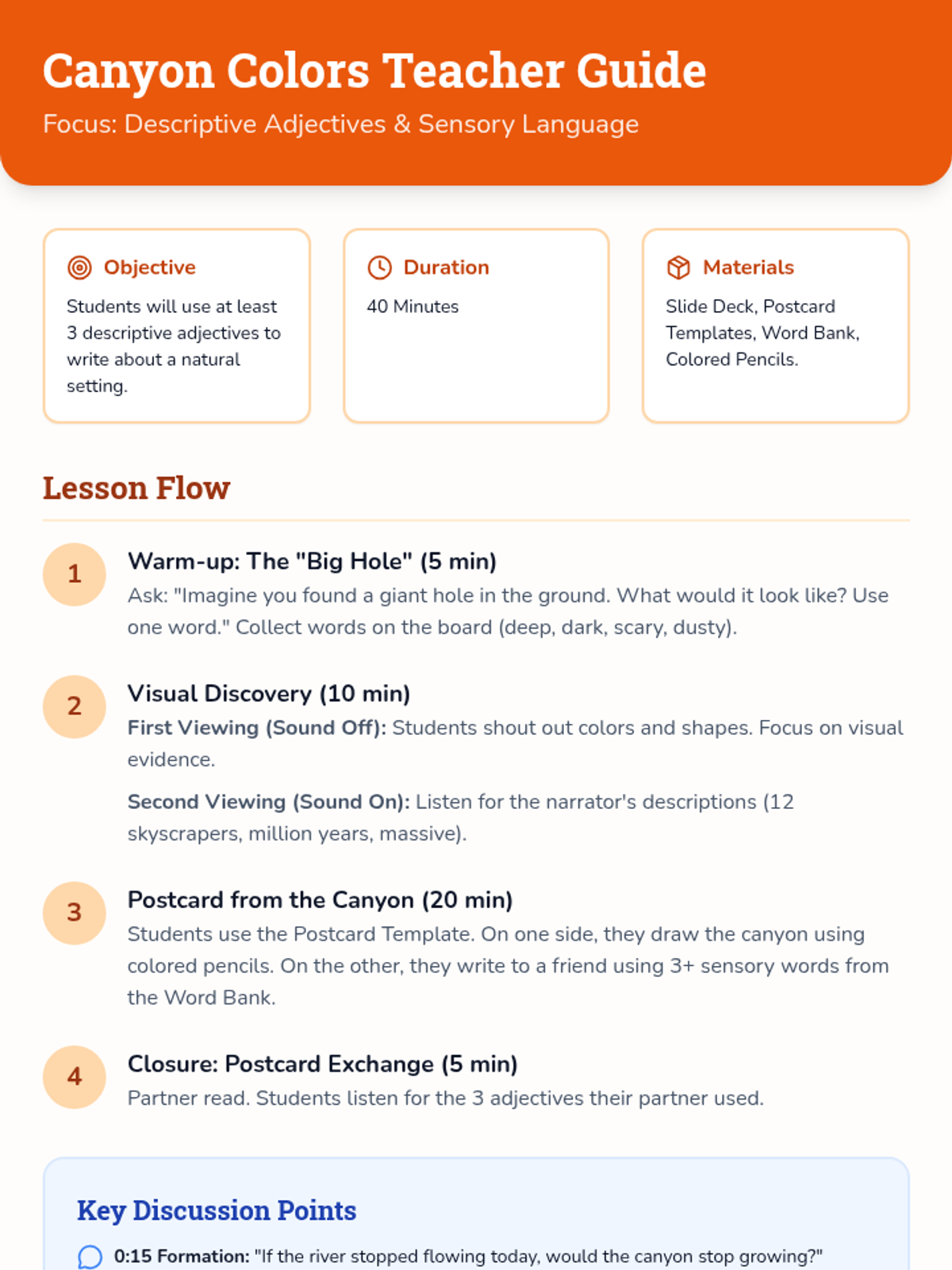 Students explore the majesty of the Grand Canyon through video and descriptive writing, focusing on using sensory adjectives to create a 'postcard from the canyon.'