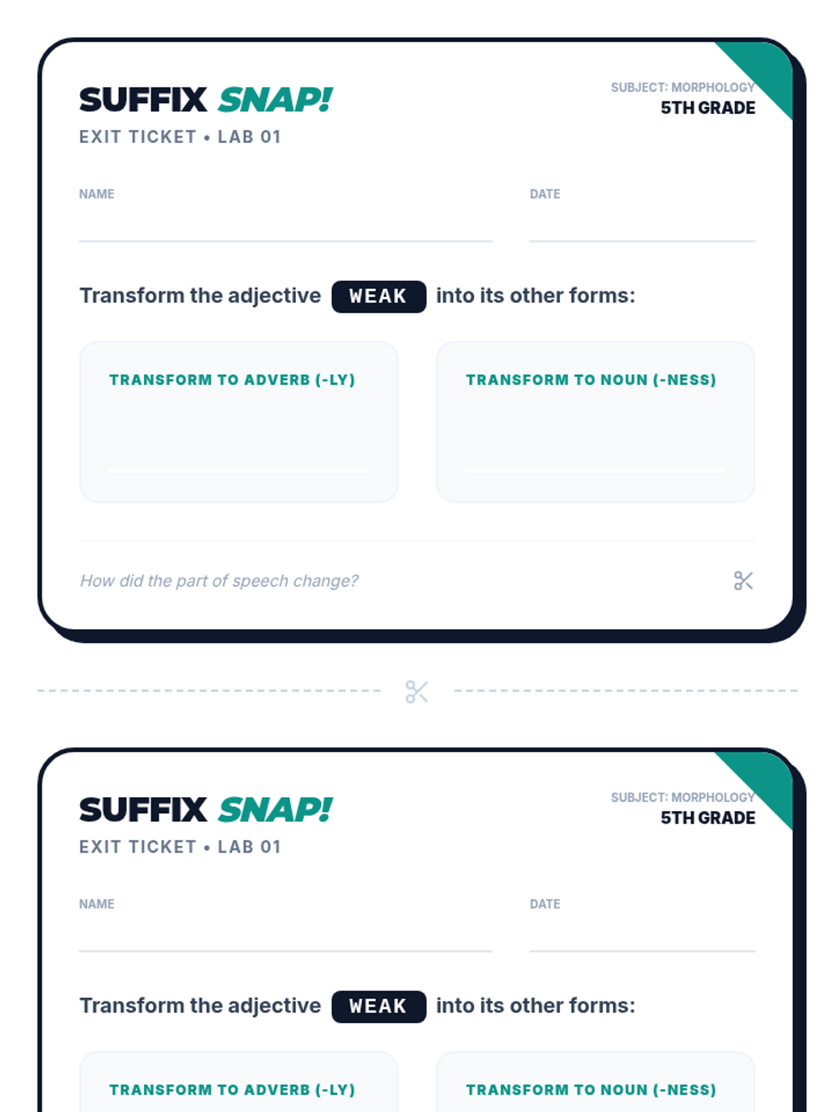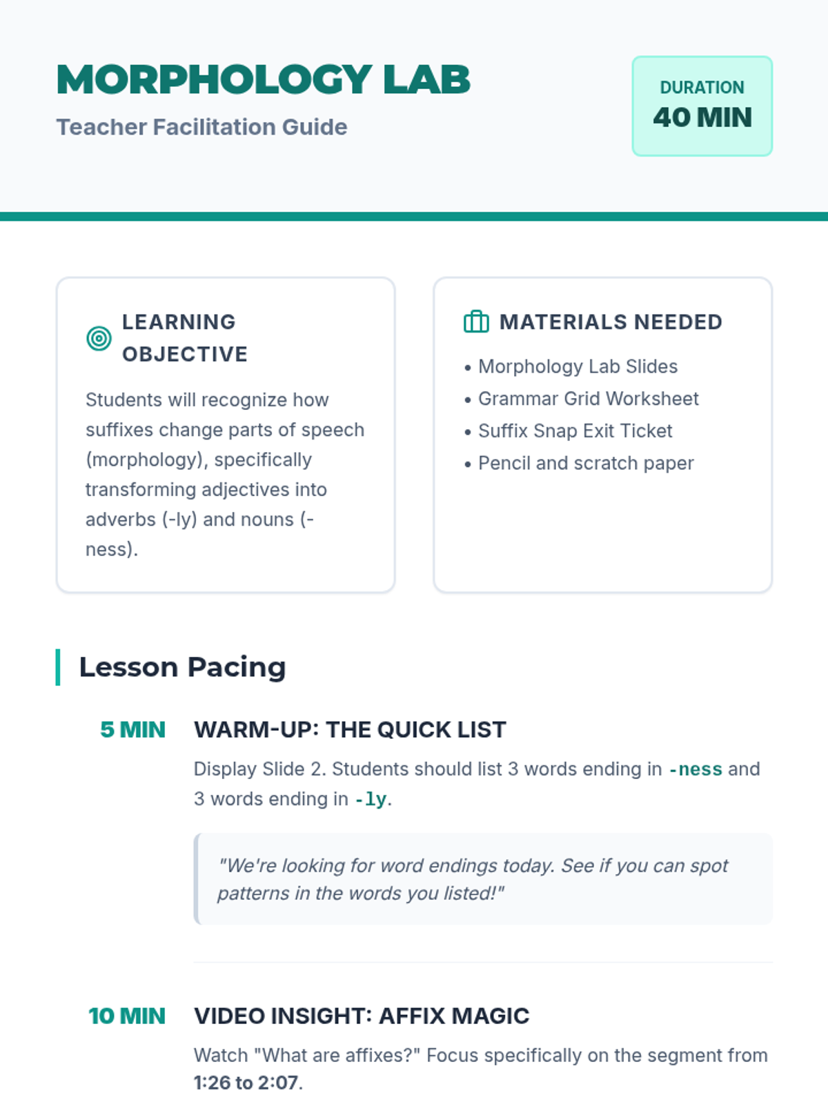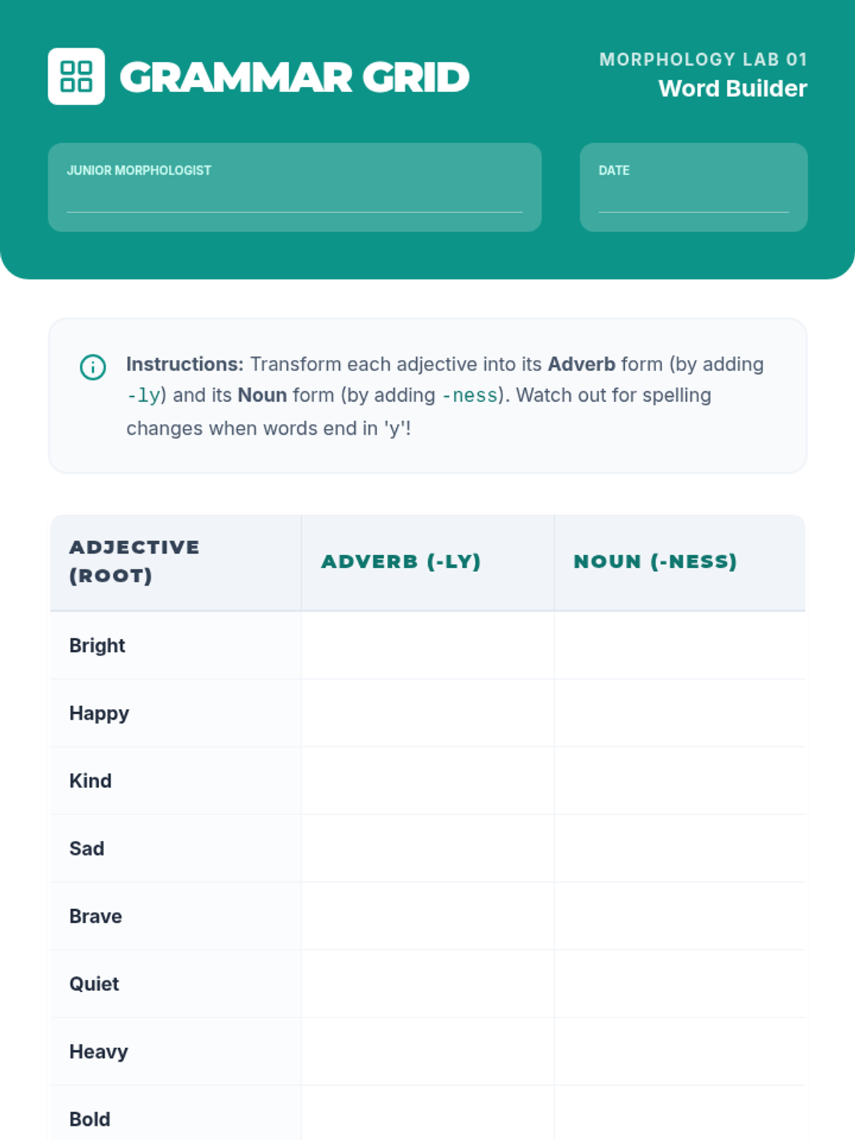 A 5th-grade morphology lesson exploring how the suffixes -ly and -ness transform adjectives into adverbs and nouns. Students will watch a Khan Academy video and practice building words in a 'Grammar Grid' activity.