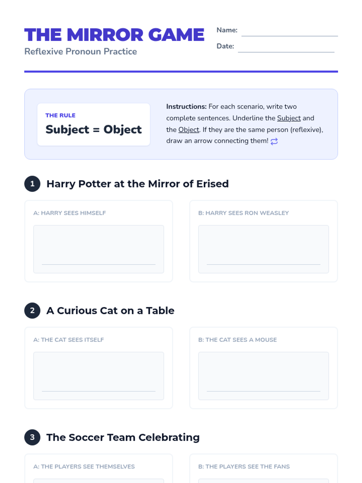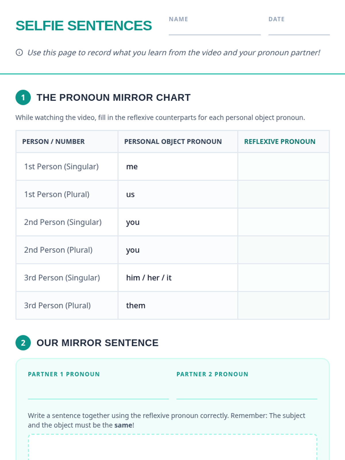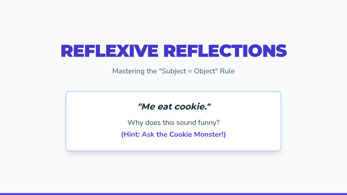 A 6th-grade grammar lesson focused on reflexive pronouns, using the 'Subject = Object' rule and the 'Sub it out' test to ensure correct pronoun usage. Students engage with a 'Mirror Game' activity to visualize when do-ers and do-ees are the same person.