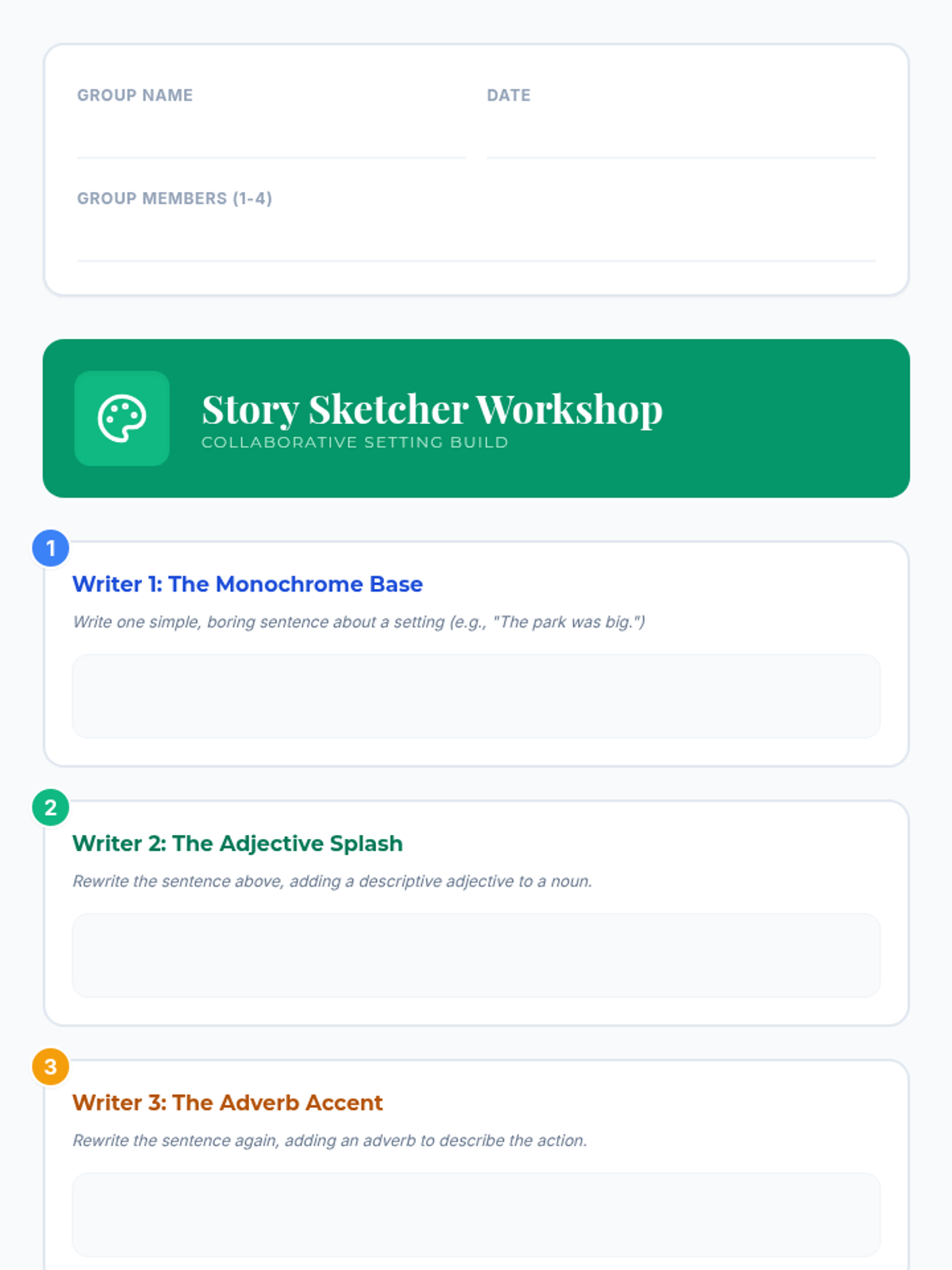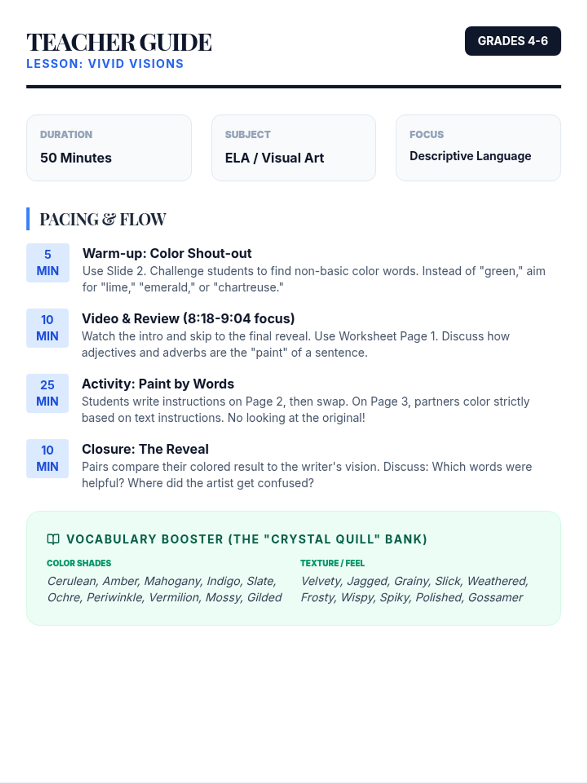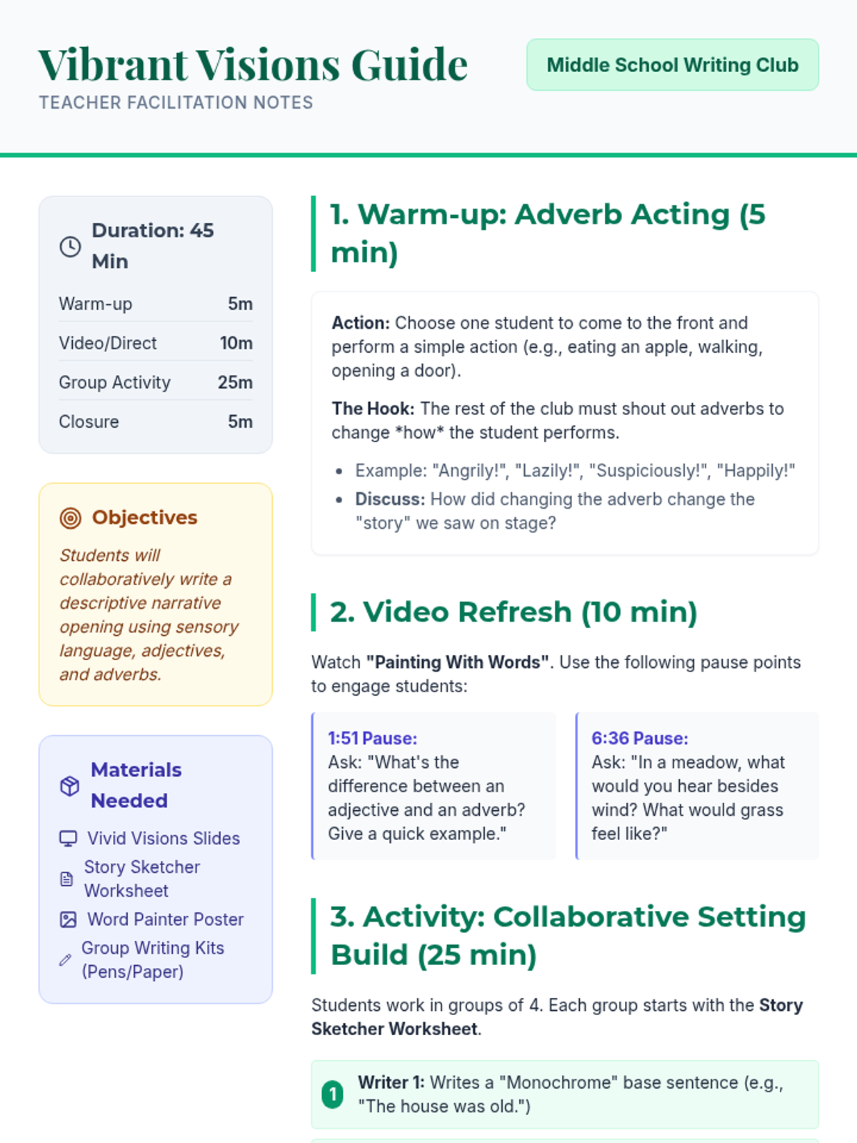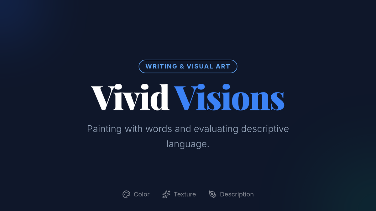 A creative writing lesson for middle schoolers focused on using adjectives, adverbs, and sensory details to build a collaborative narrative opening. Inspired by the 'Painting with Words' concept, students transition from 'monochrome' sentences to 'vibrant' scenes.