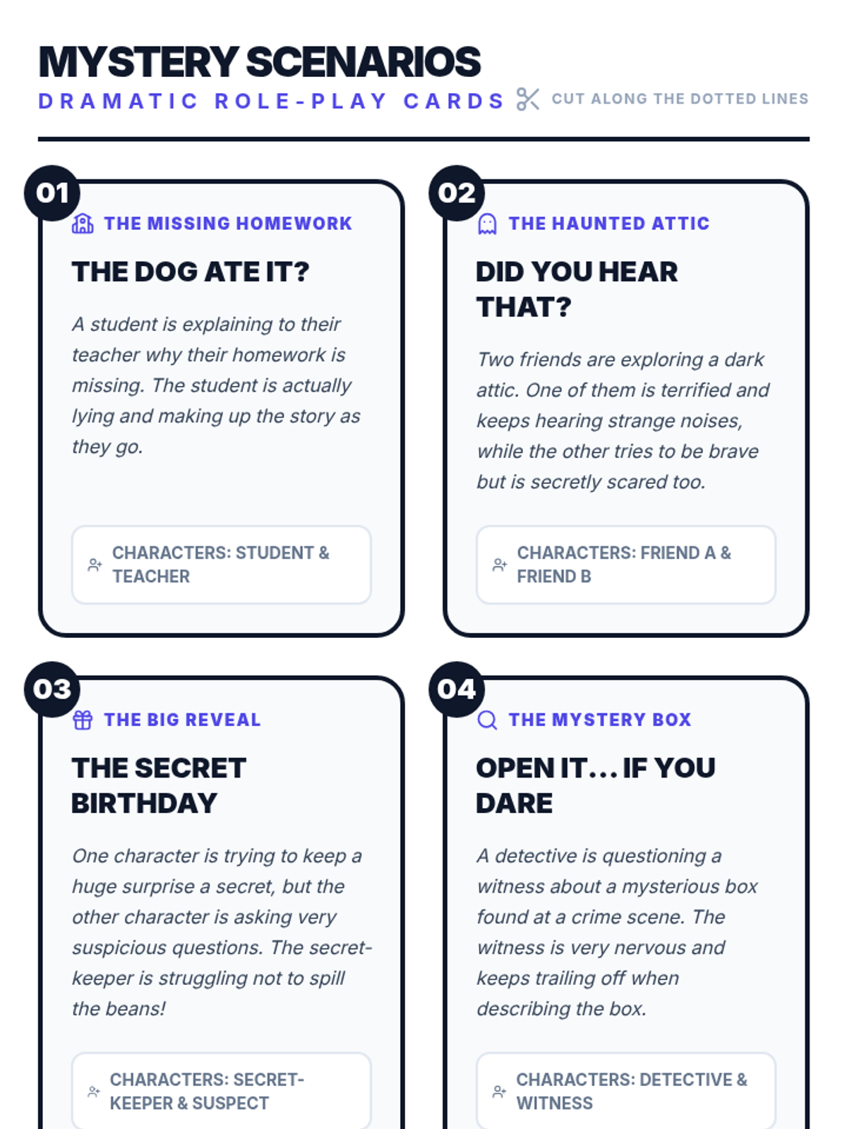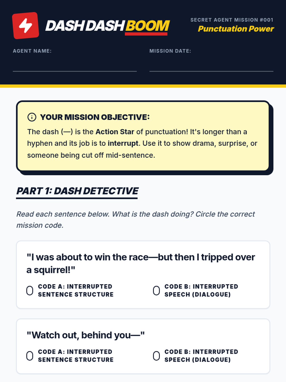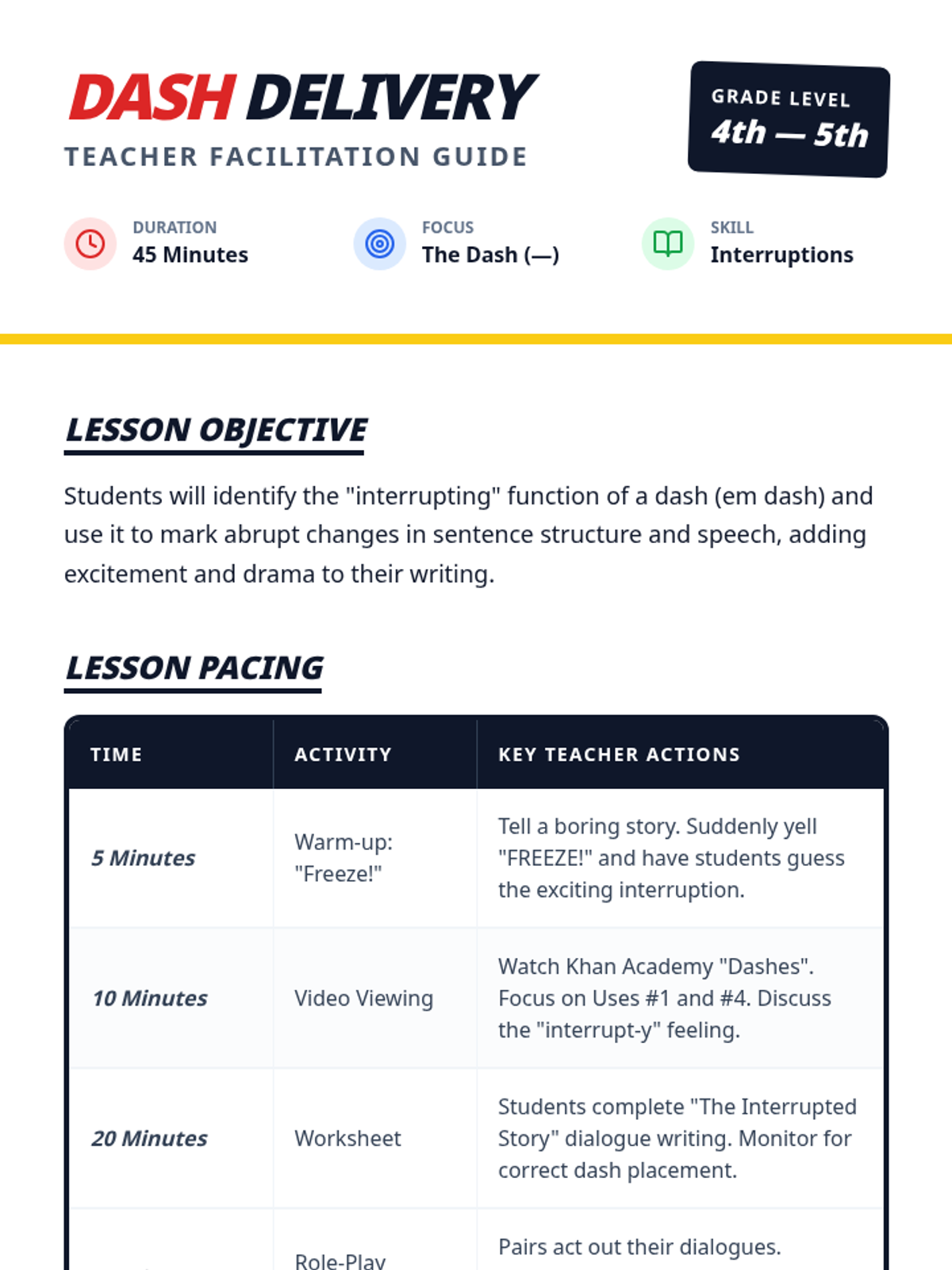 Students learn how to use the em dash as a tool for interruption in both sentence structure and dialogue, focusing on adding drama and excitement to their writing. The lesson includes a presentation with a Khan Academy video, a dialogue-writing worksheet, and interactive role-play scenarios.