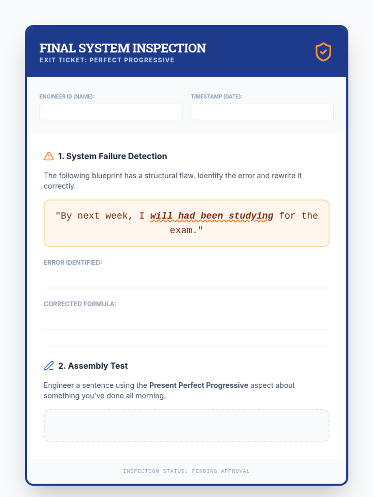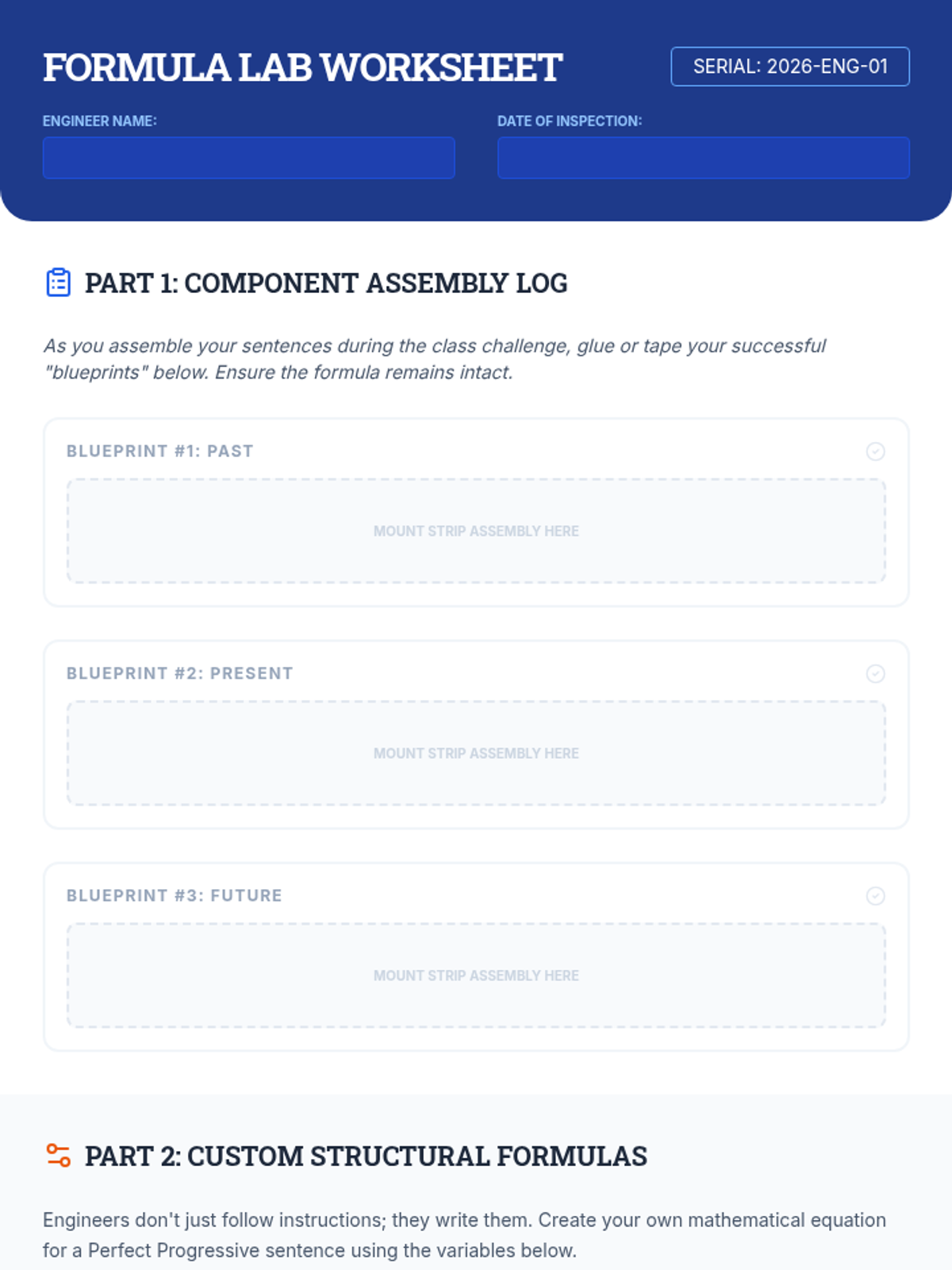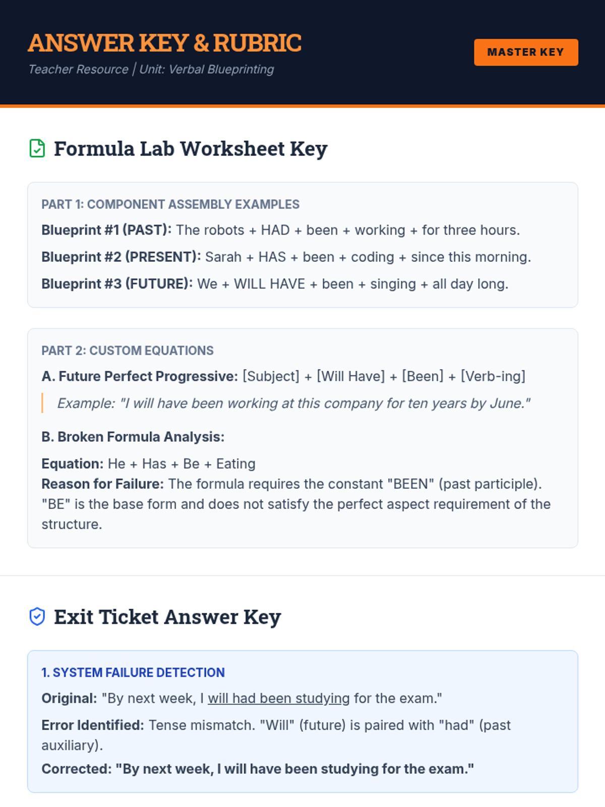 A technical, 'Sentence Engineering' approach to the perfect progressive aspect. Students use physical formulas and mathematical structures to build complex verb phrases across past, present, and future tenses.