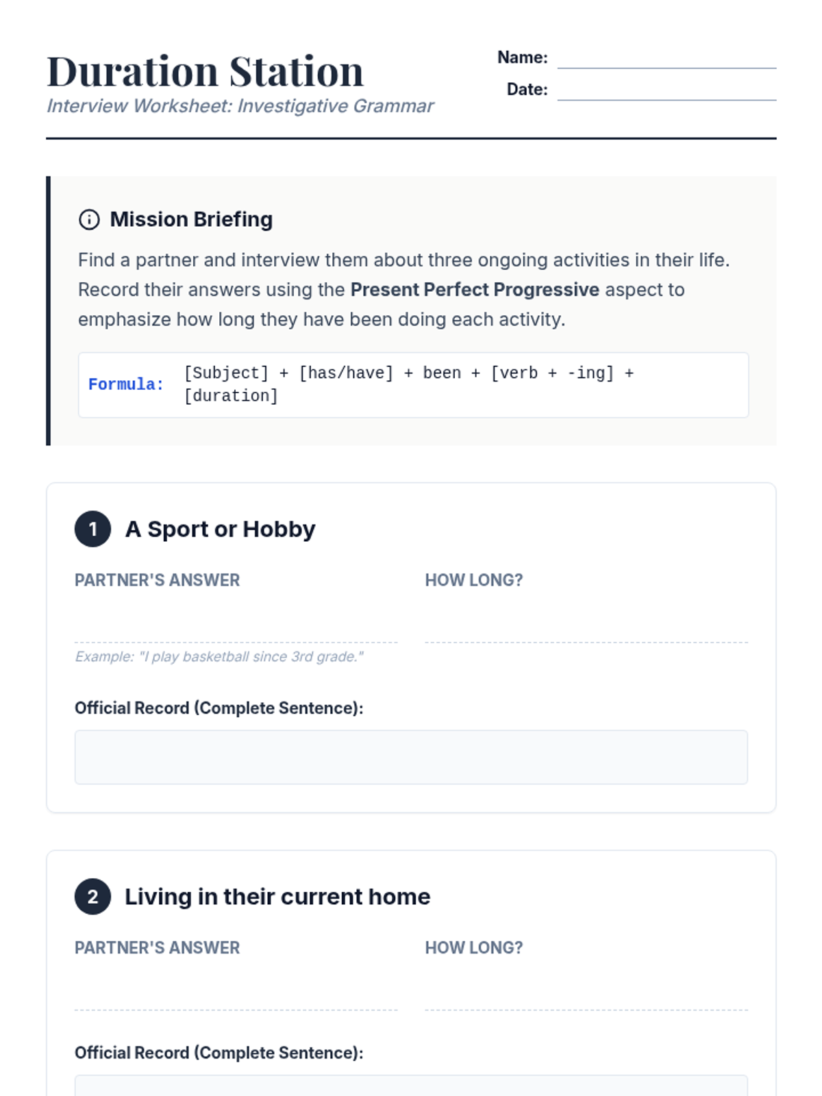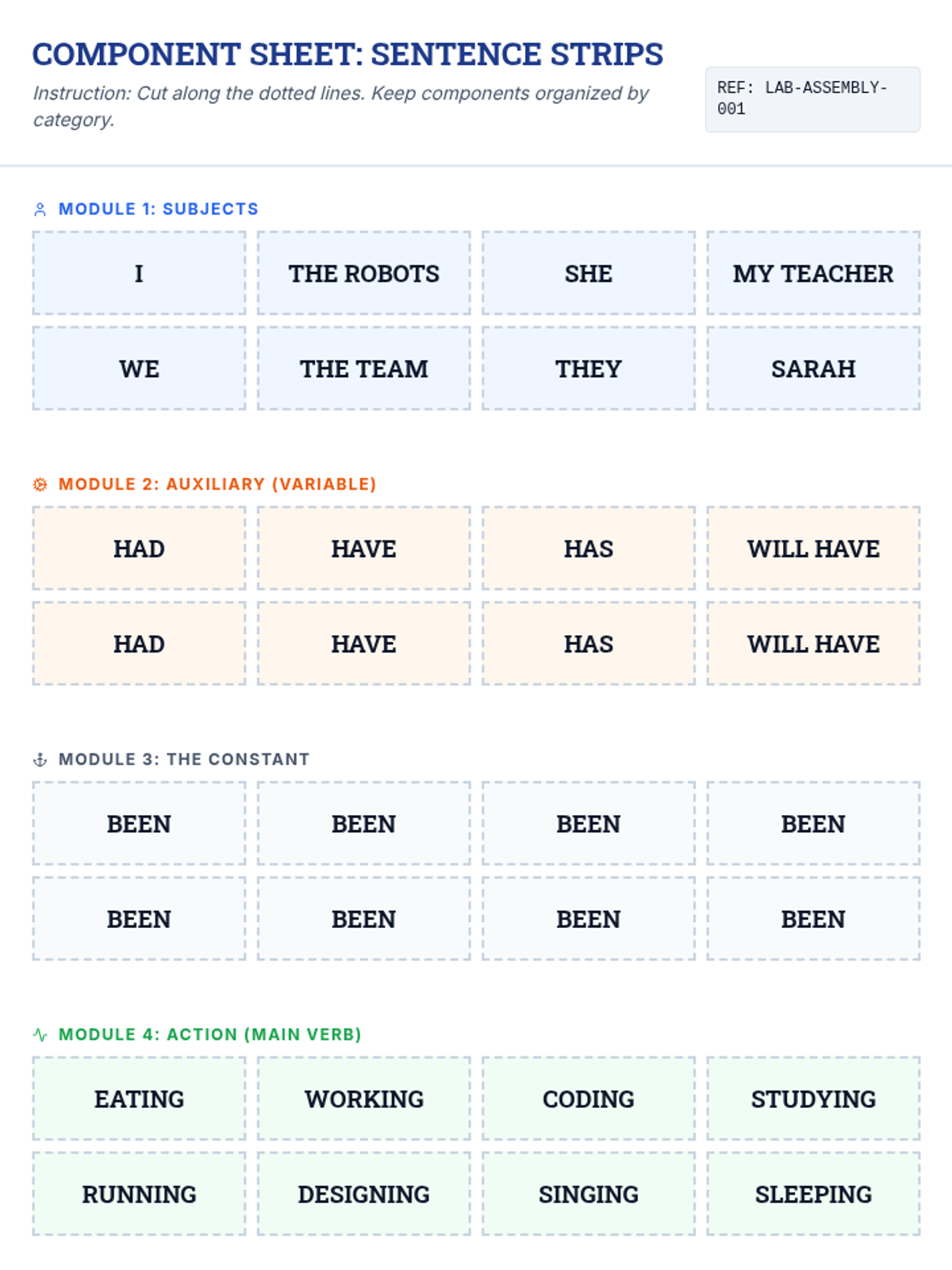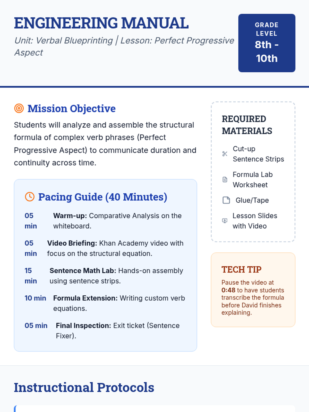 A technical, 'Sentence Engineering' approach to the perfect progressive aspect. Students use physical formulas and mathematical structures to build complex verb phrases across past, present, and future tenses.