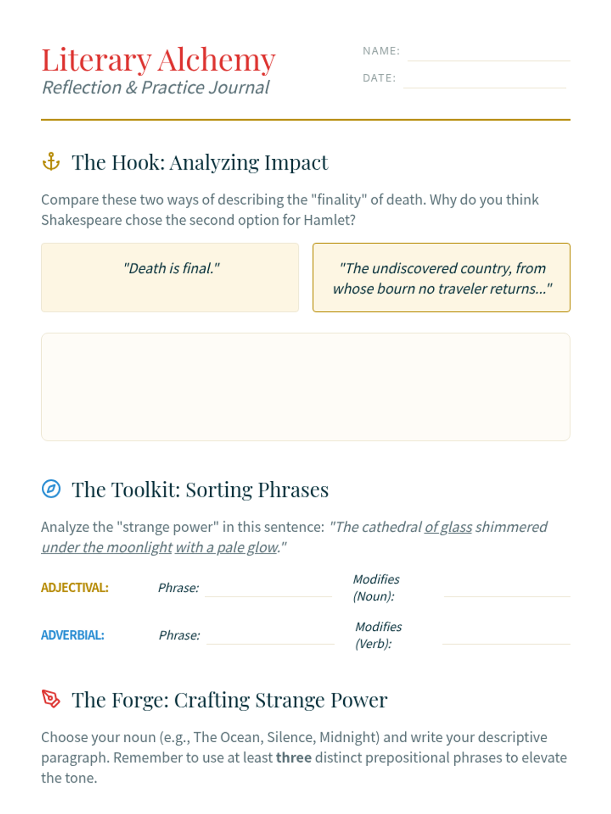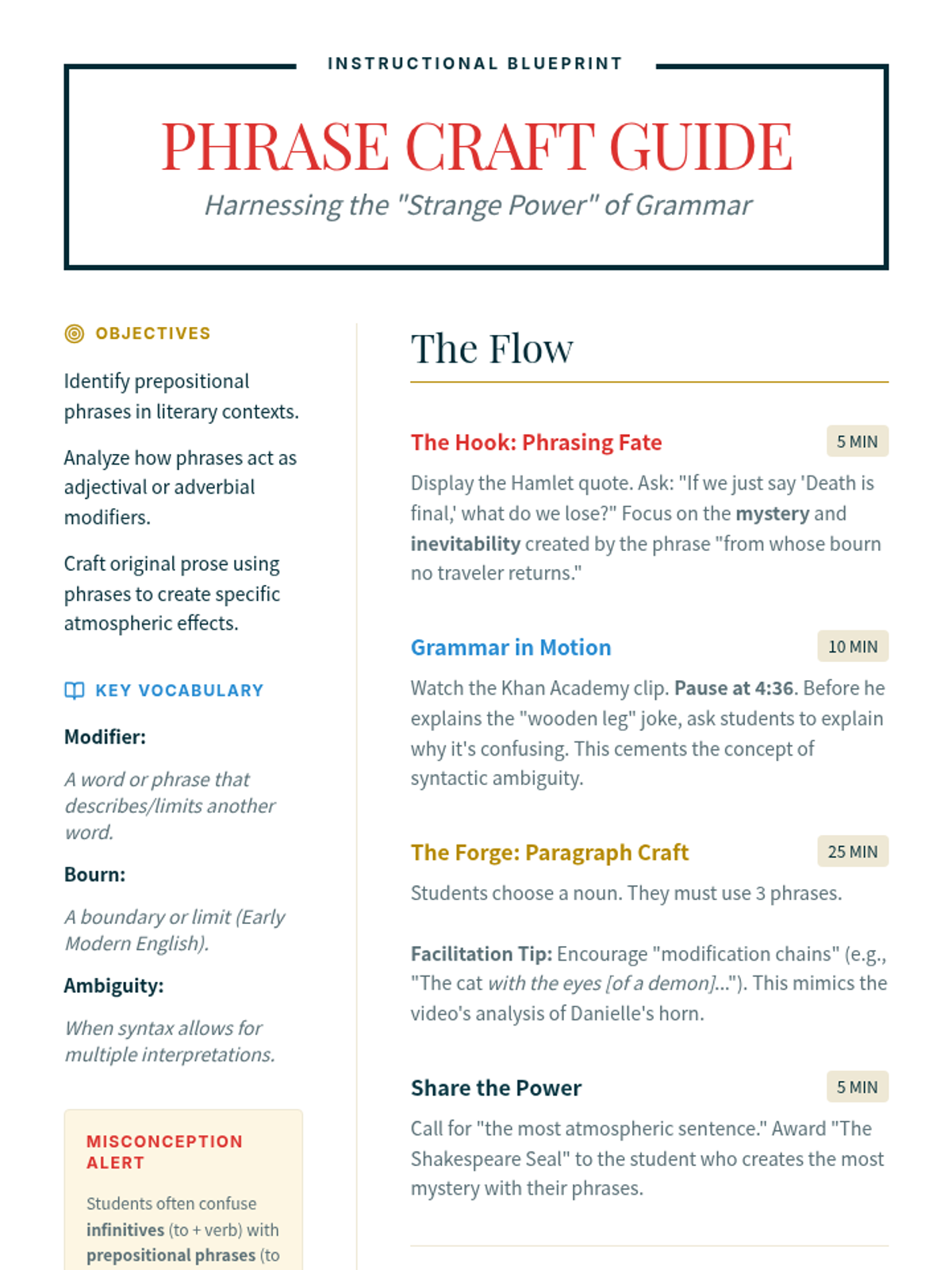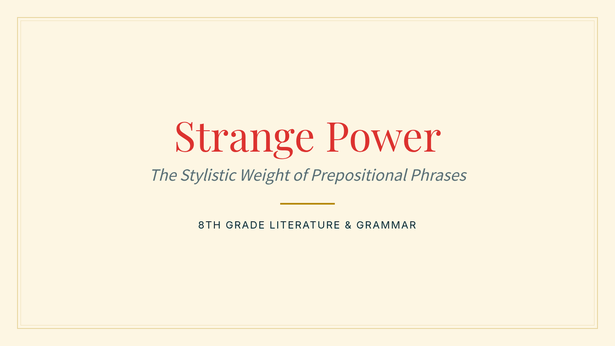 In this lesson, 8th-grade students analyze how prepositional phrases function as stylistic tools in literature, using Shakespeare's 'Hamlet' as a core example to understand how grammar creates 'strange power' and atmosphere.