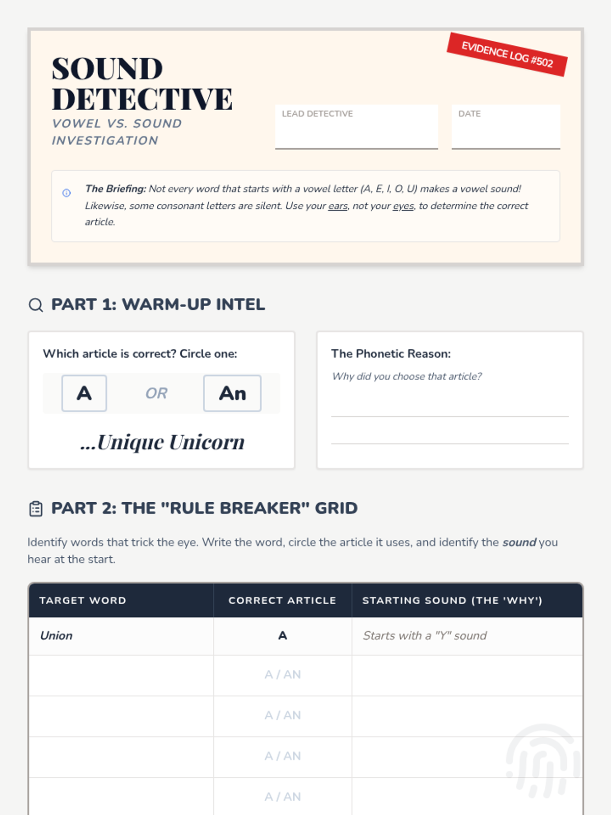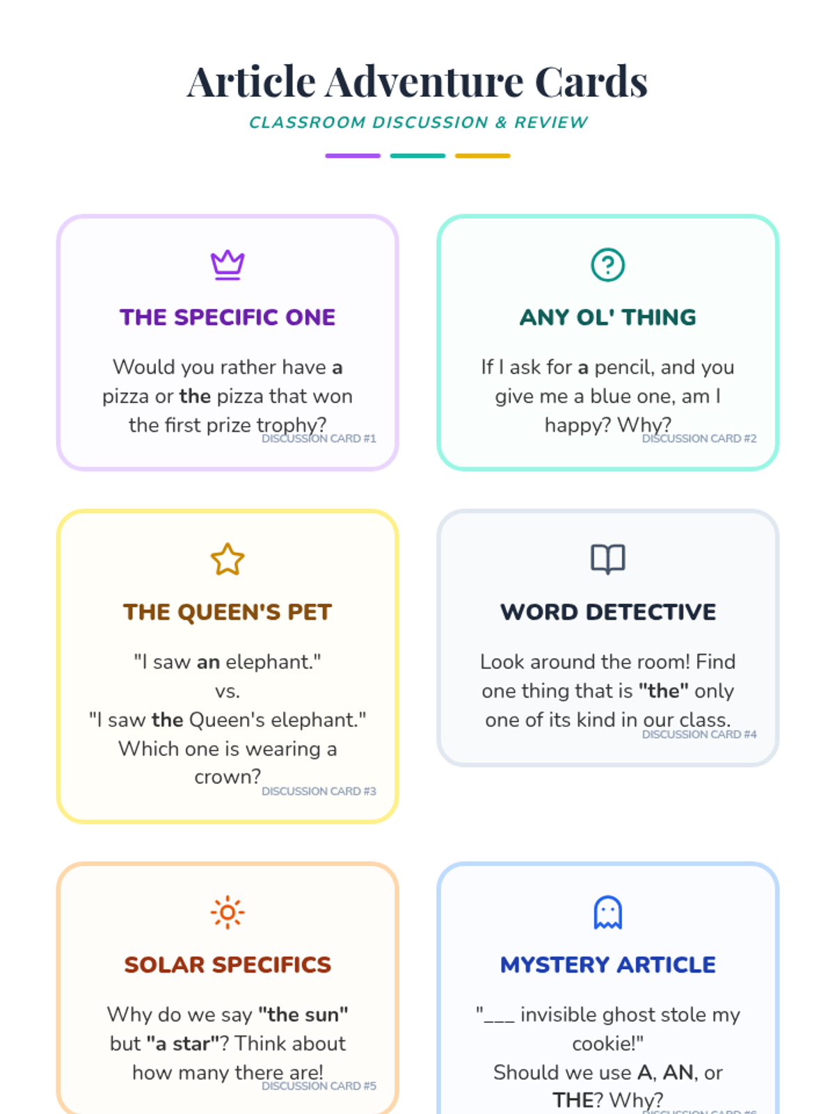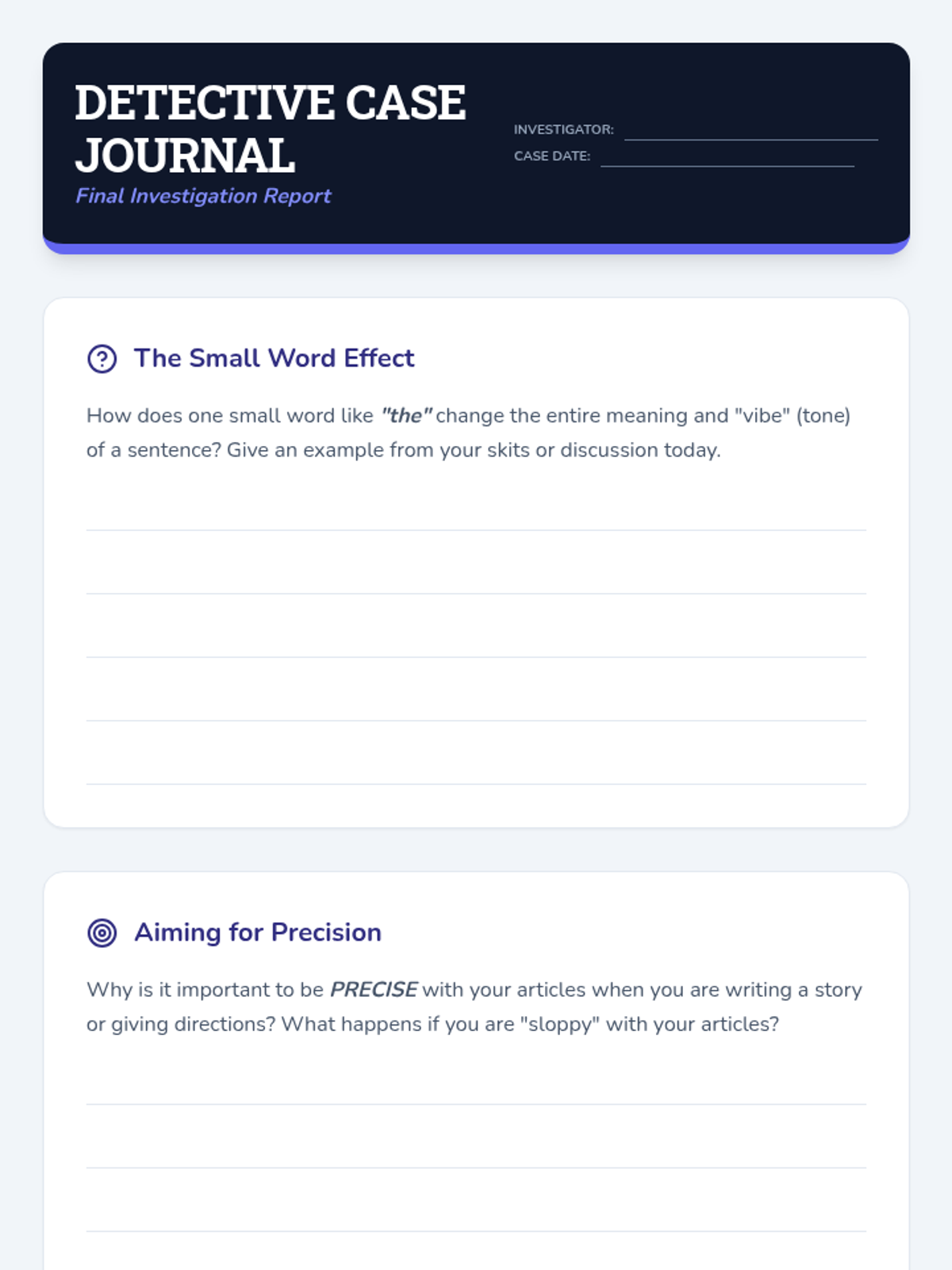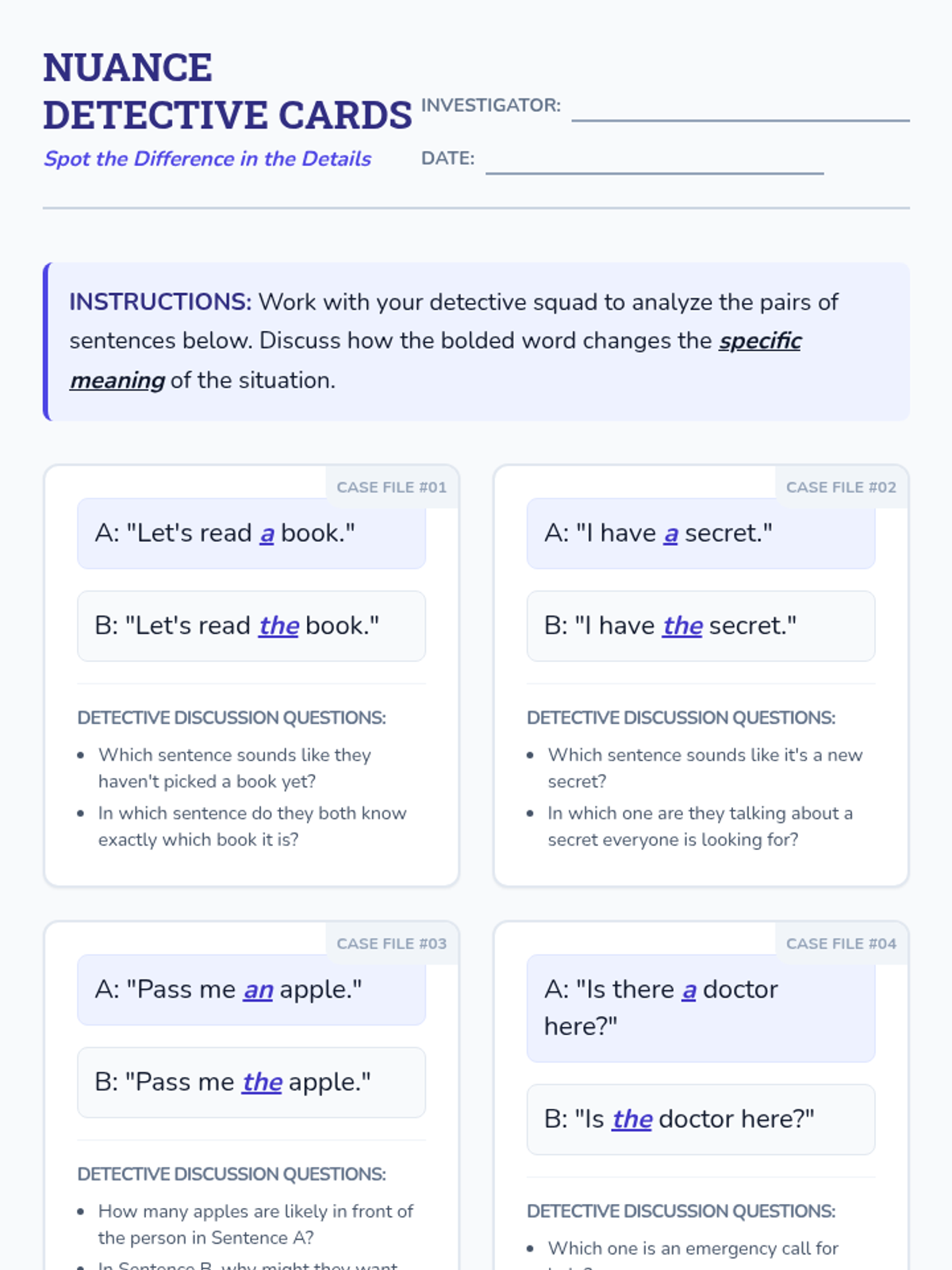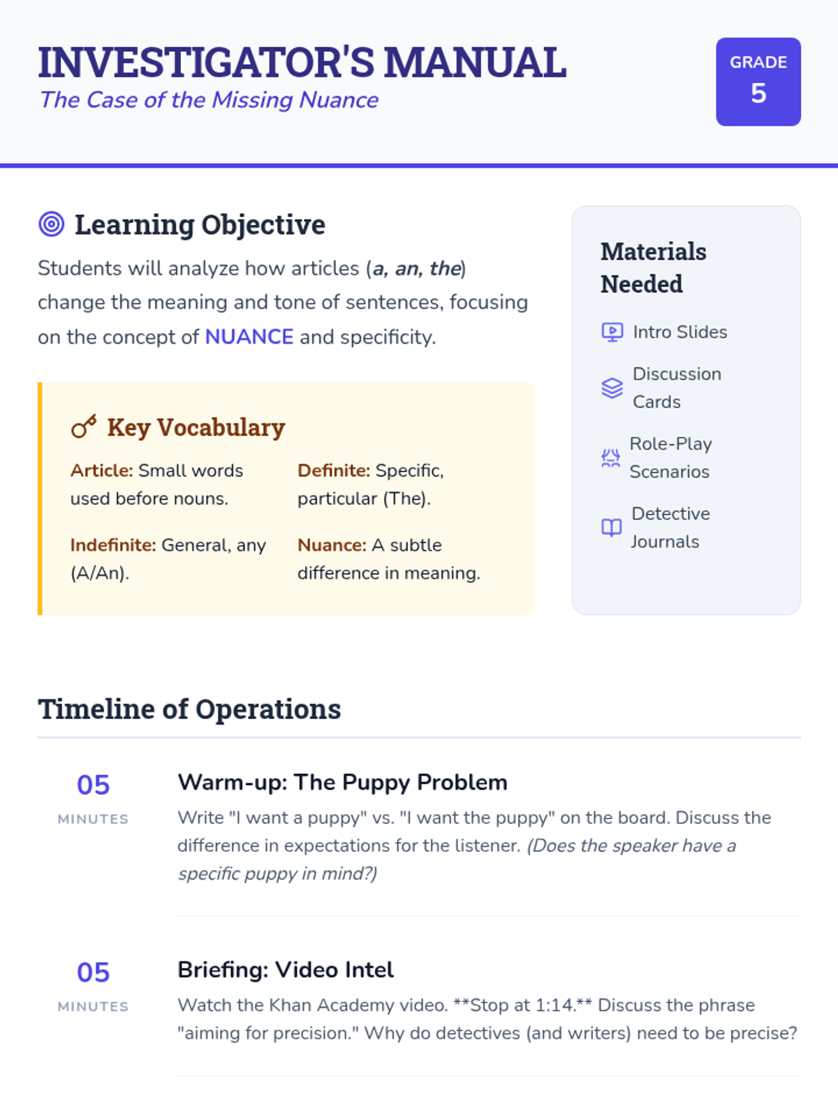 A lesson where 5th-grade students act as detectives to uncover how small articles like 'a', 'an', and 'the' fundamentally change the meaning, specificity, and tone of language.