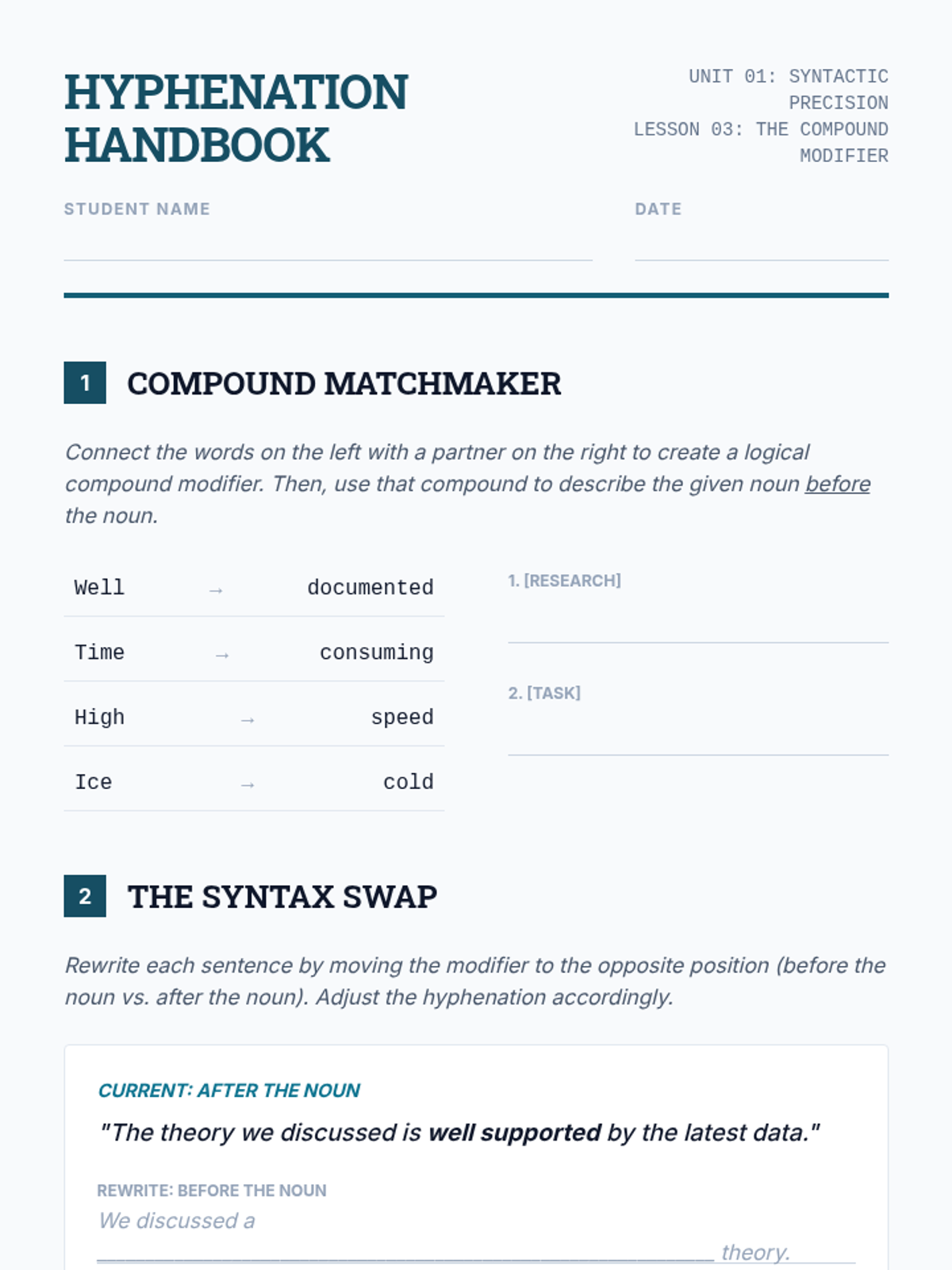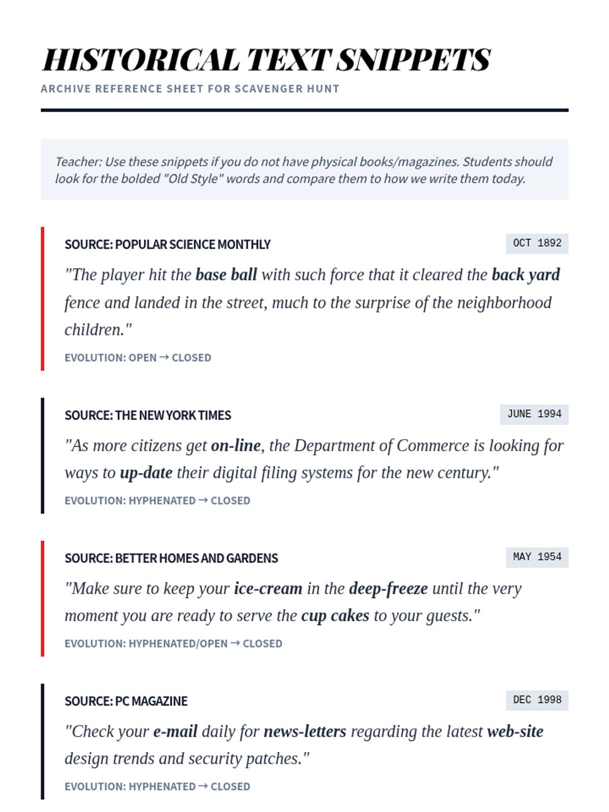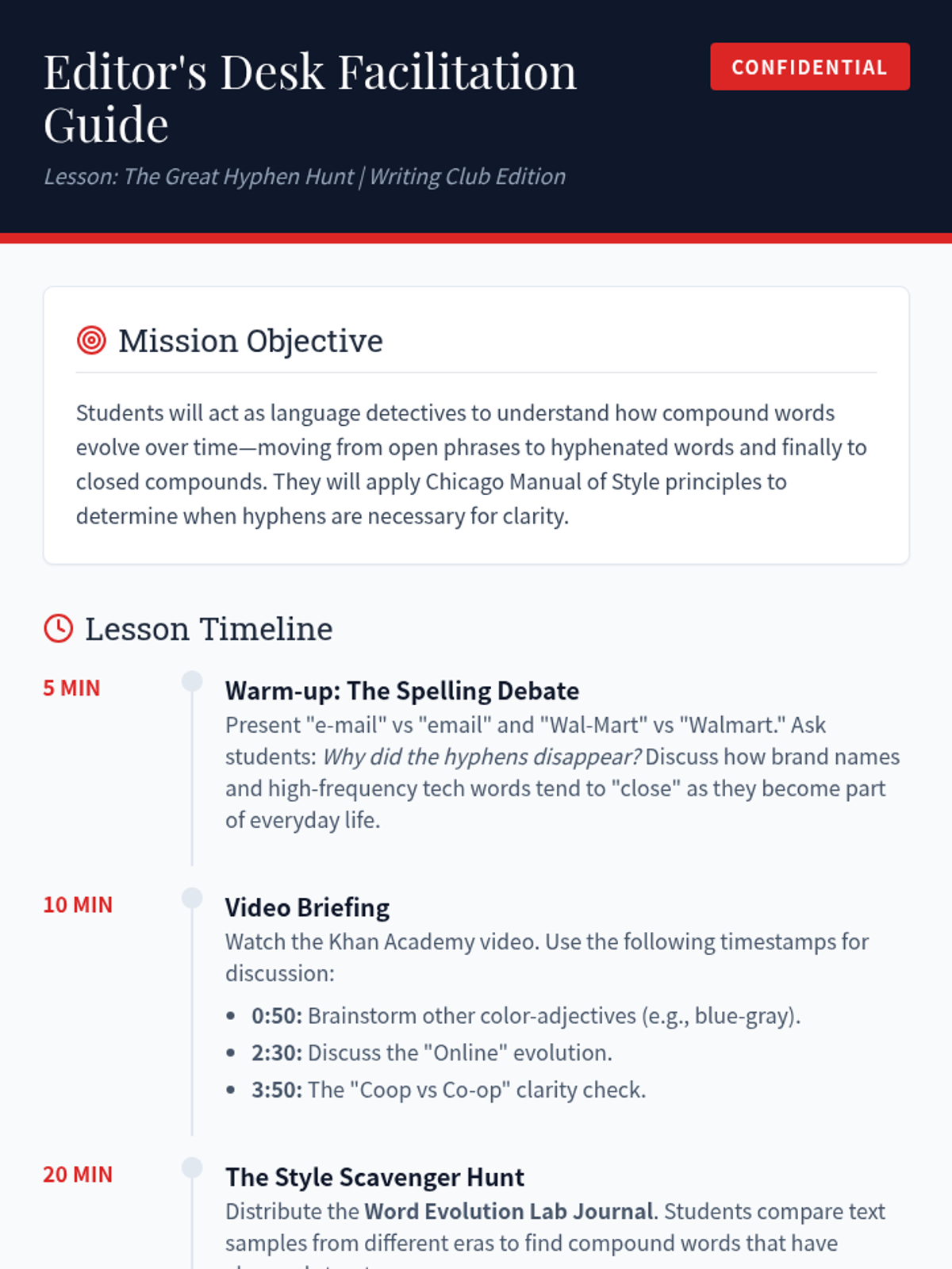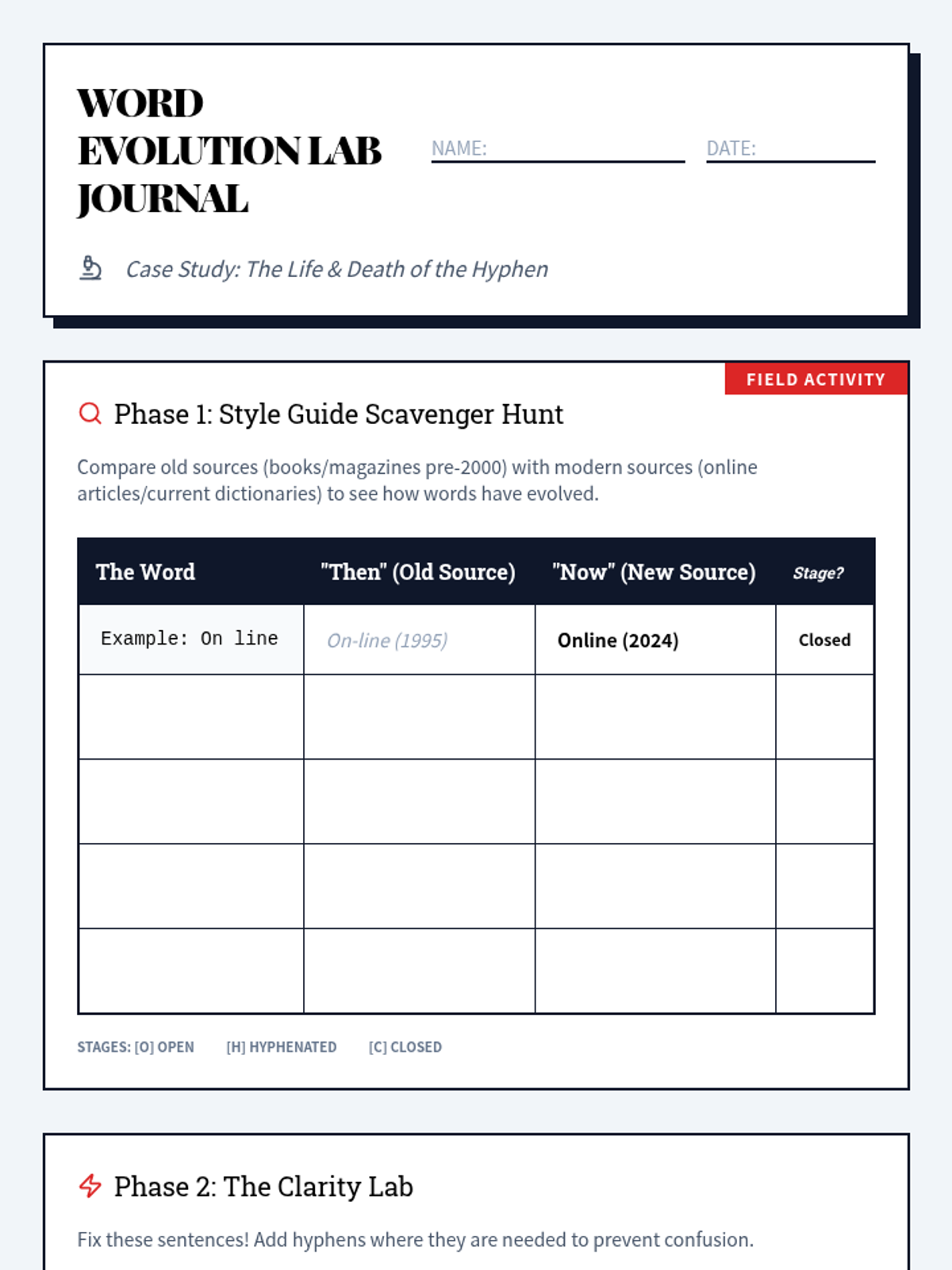 A creative lesson for Writing Club focused on the evolution of compound words and the stylistic rules of hyphenation, featuring a 'Then vs. Now' scavenger hunt.