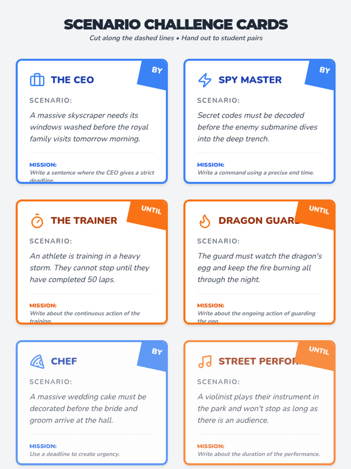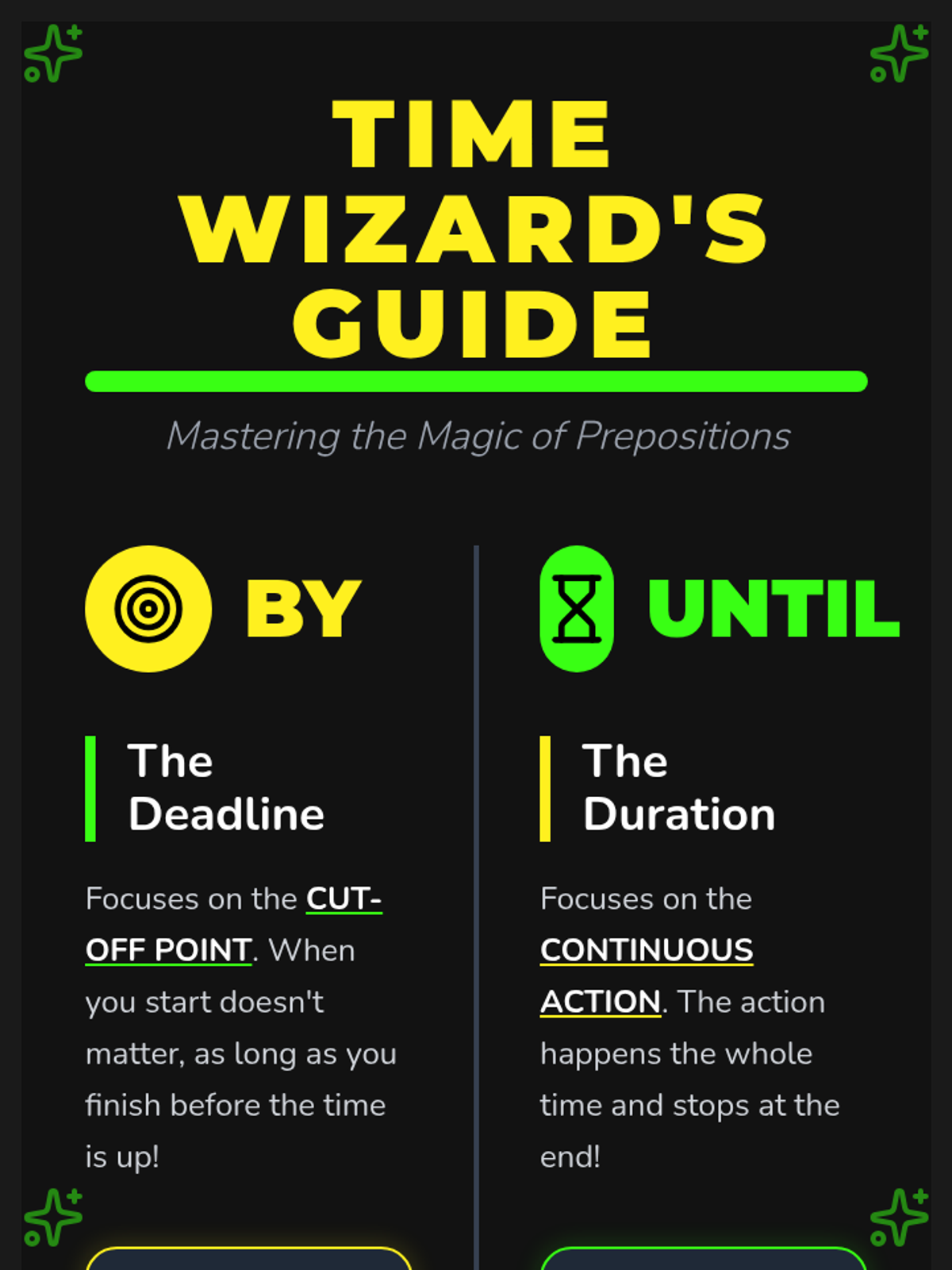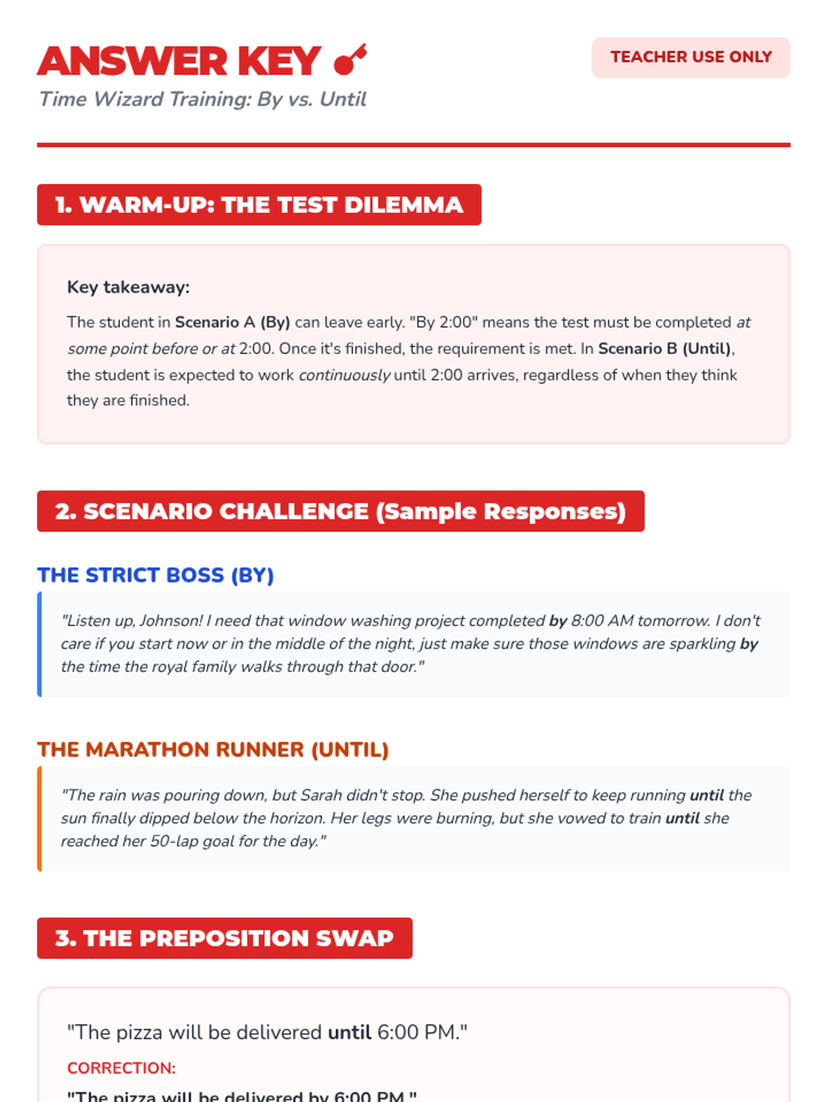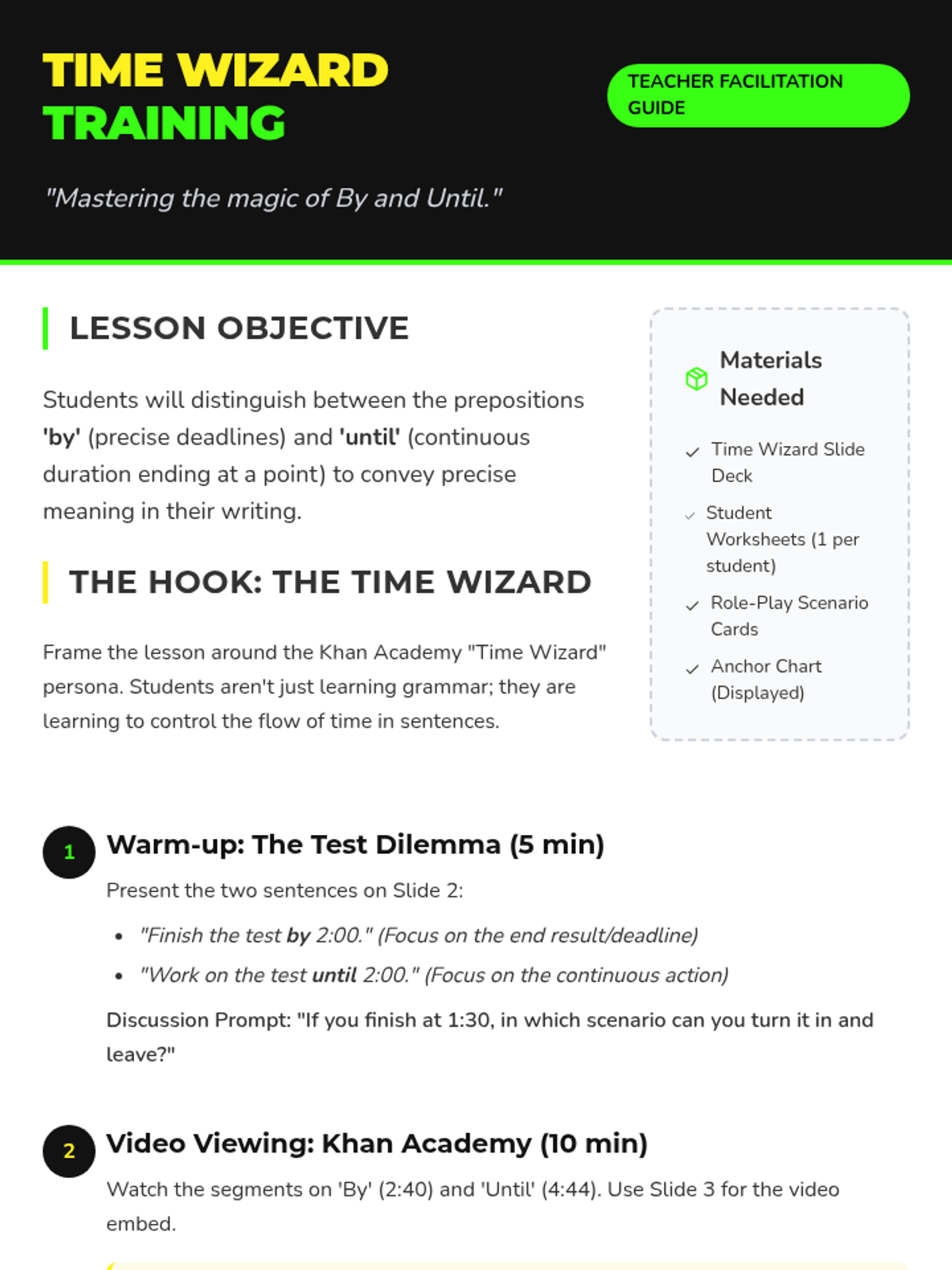 A whimsical, grammar-focused lesson that helps 6th graders master the nuanced difference between 'by' and 'until' through the persona of 'Time Wizards'. students will explore deadlines versus durations using a 'Strict Boss' and a 'Marathon Runner' as character archetypes.