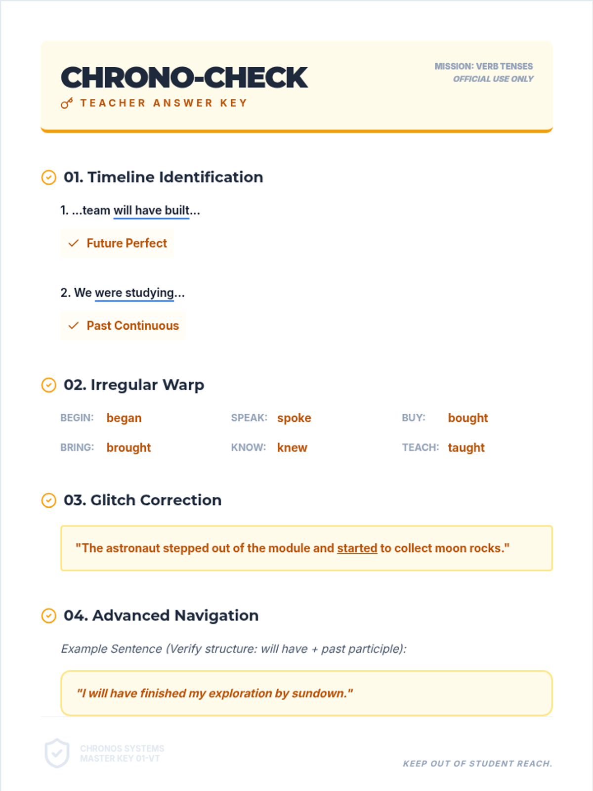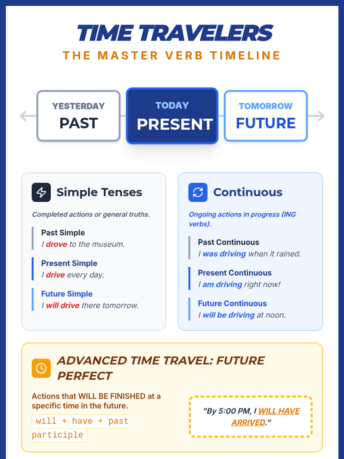 A comprehensive lesson on verb tenses including simple, continuous, and future perfect forms, with a focus on irregular verbs and correcting tense shifts. Students explore 'time travel' through language.
