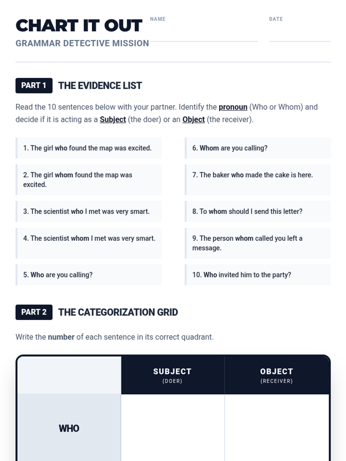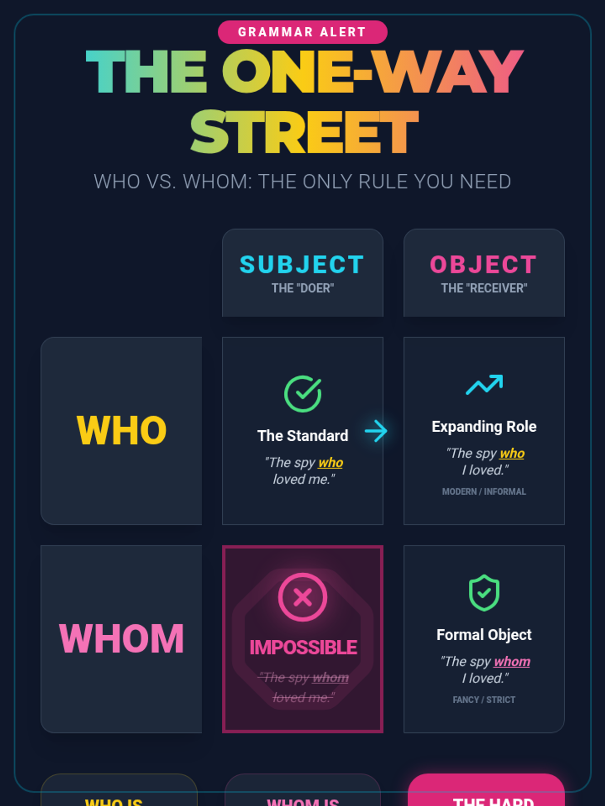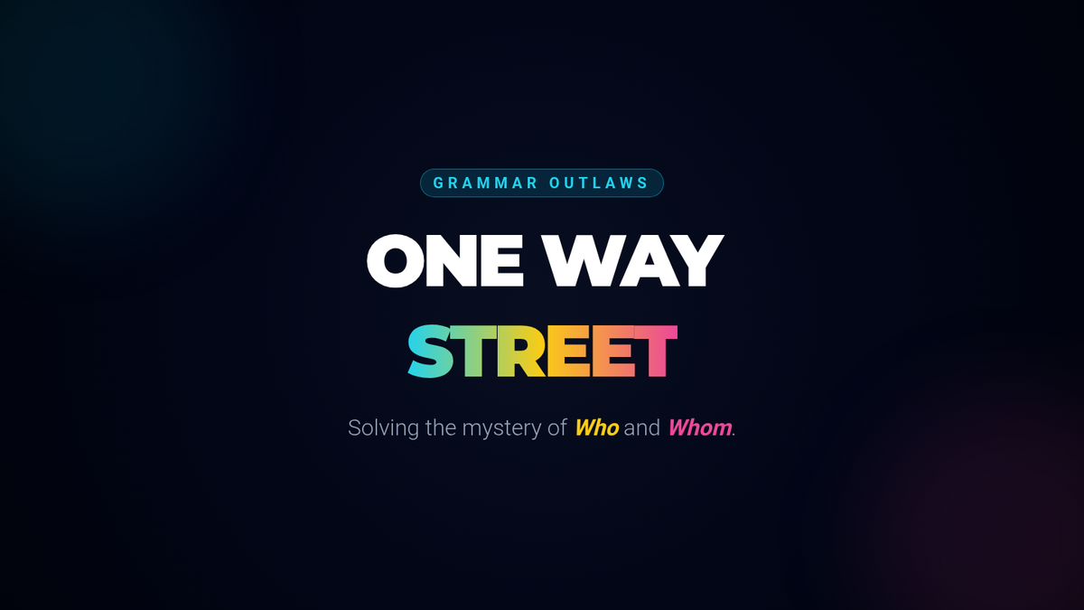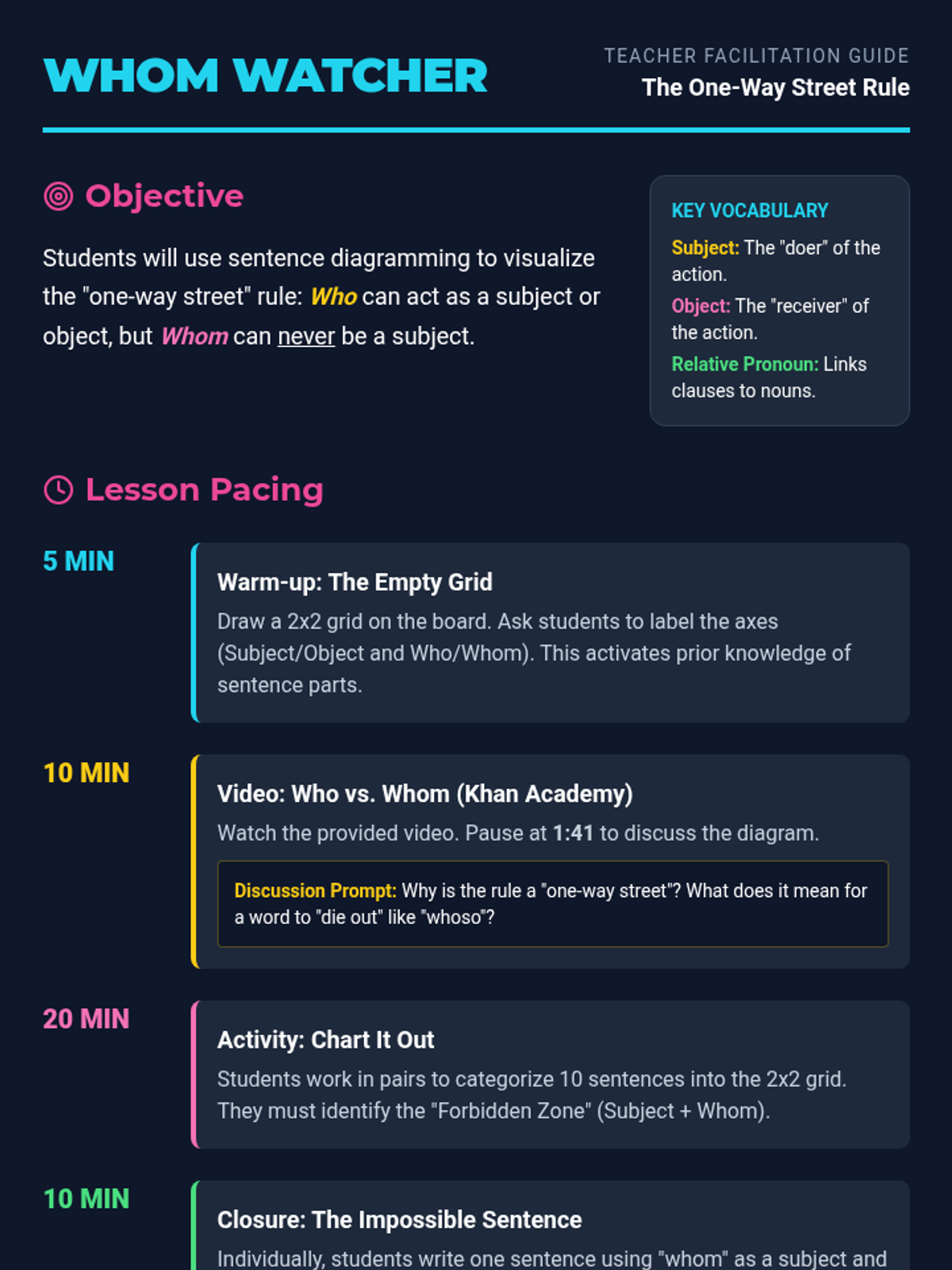 Students explore the 'One-Way Street' rule of grammar, learning that while 'who' is expanding its role, 'whom' can never be a subject. The lesson features a Khan Academy video, a 2x2 diagramming activity, and the creation of 'impossible' sentences.