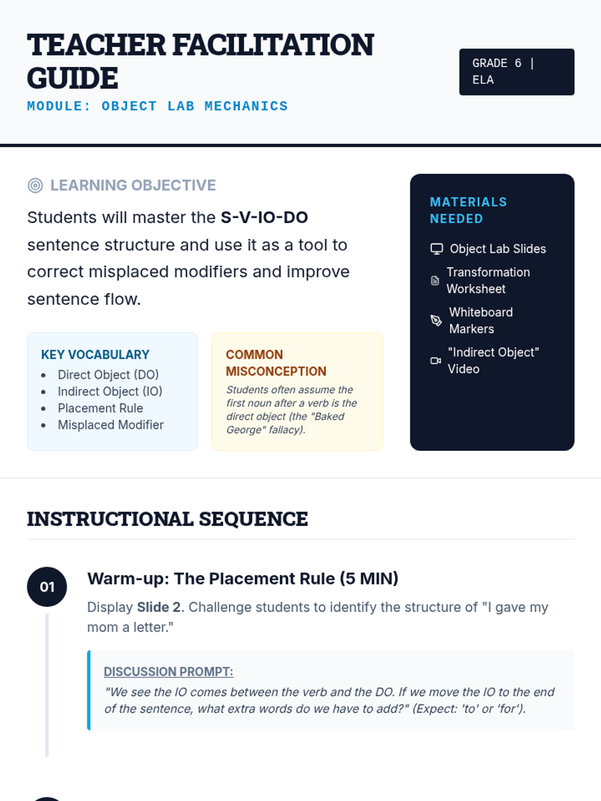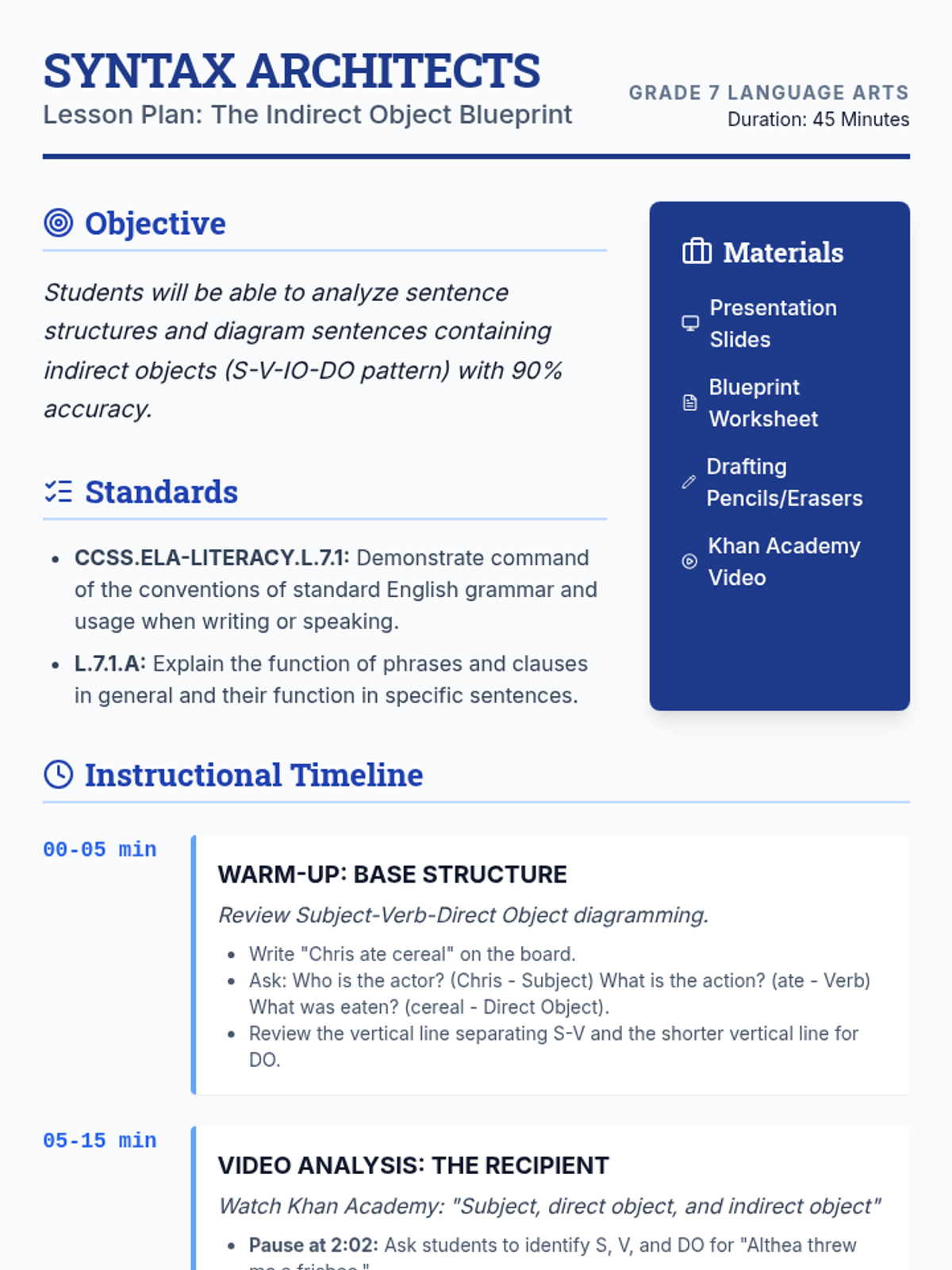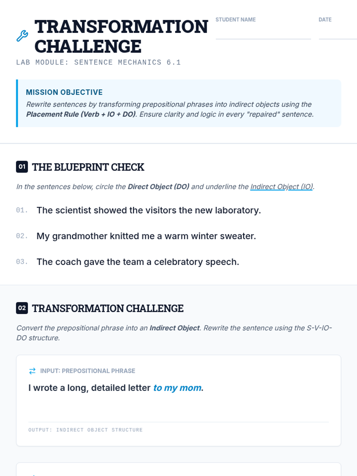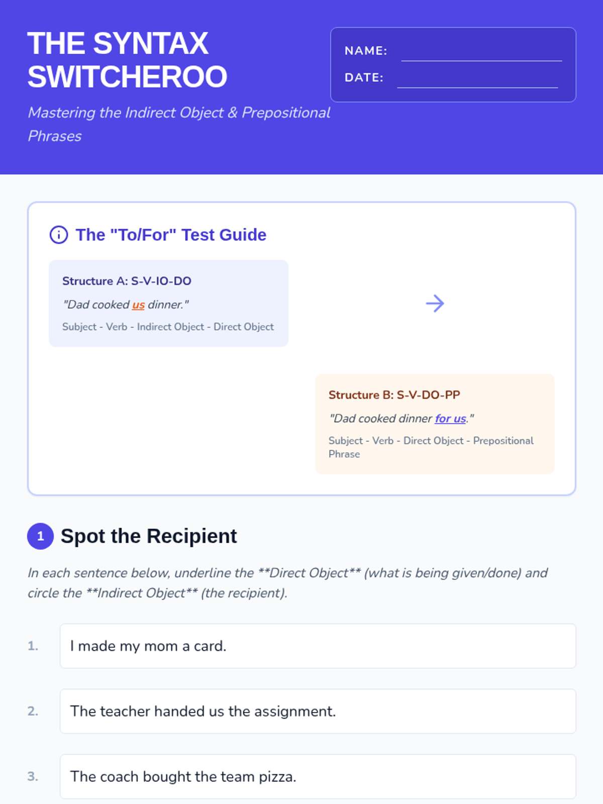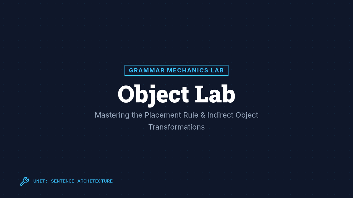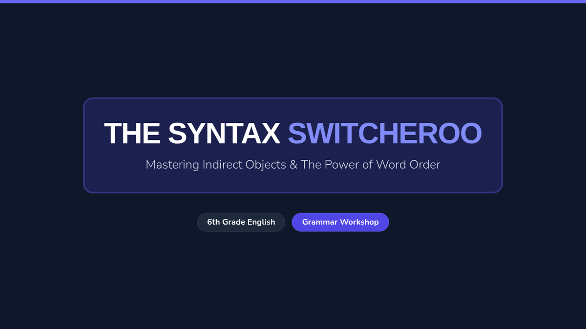 A lesson focused on the mechanics of indirect objects and sentence structure. Students will master the placement rule (S-V-IO-DO) and learn to transform prepositional phrases into indirect objects while avoiding misplaced modifiers.