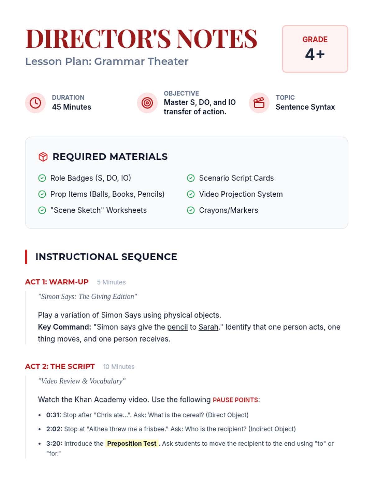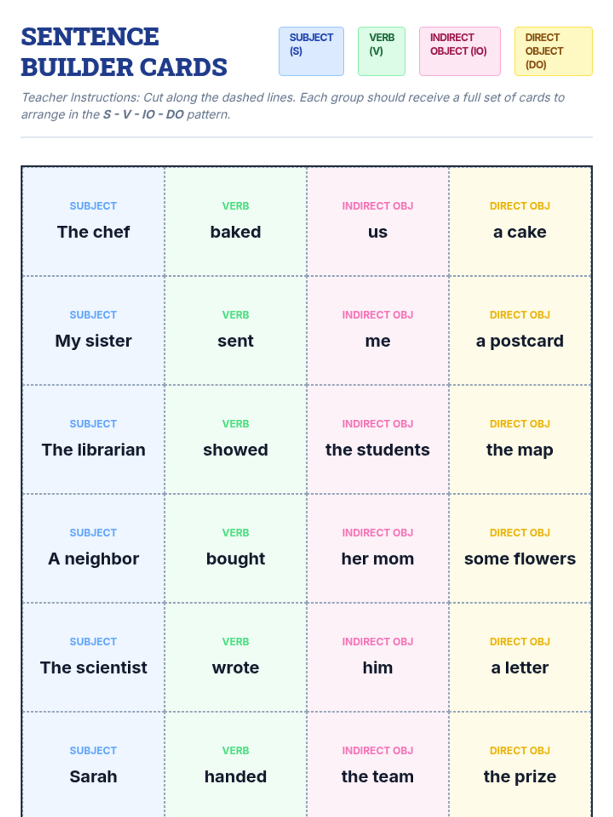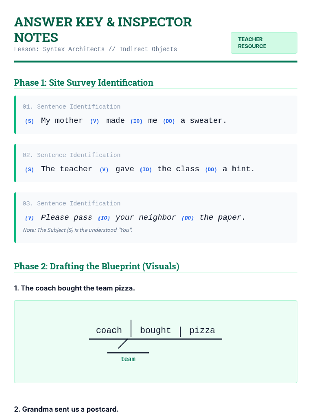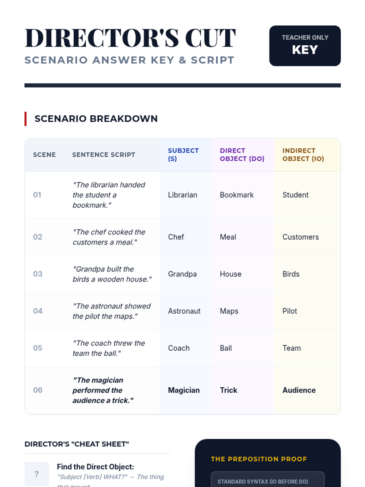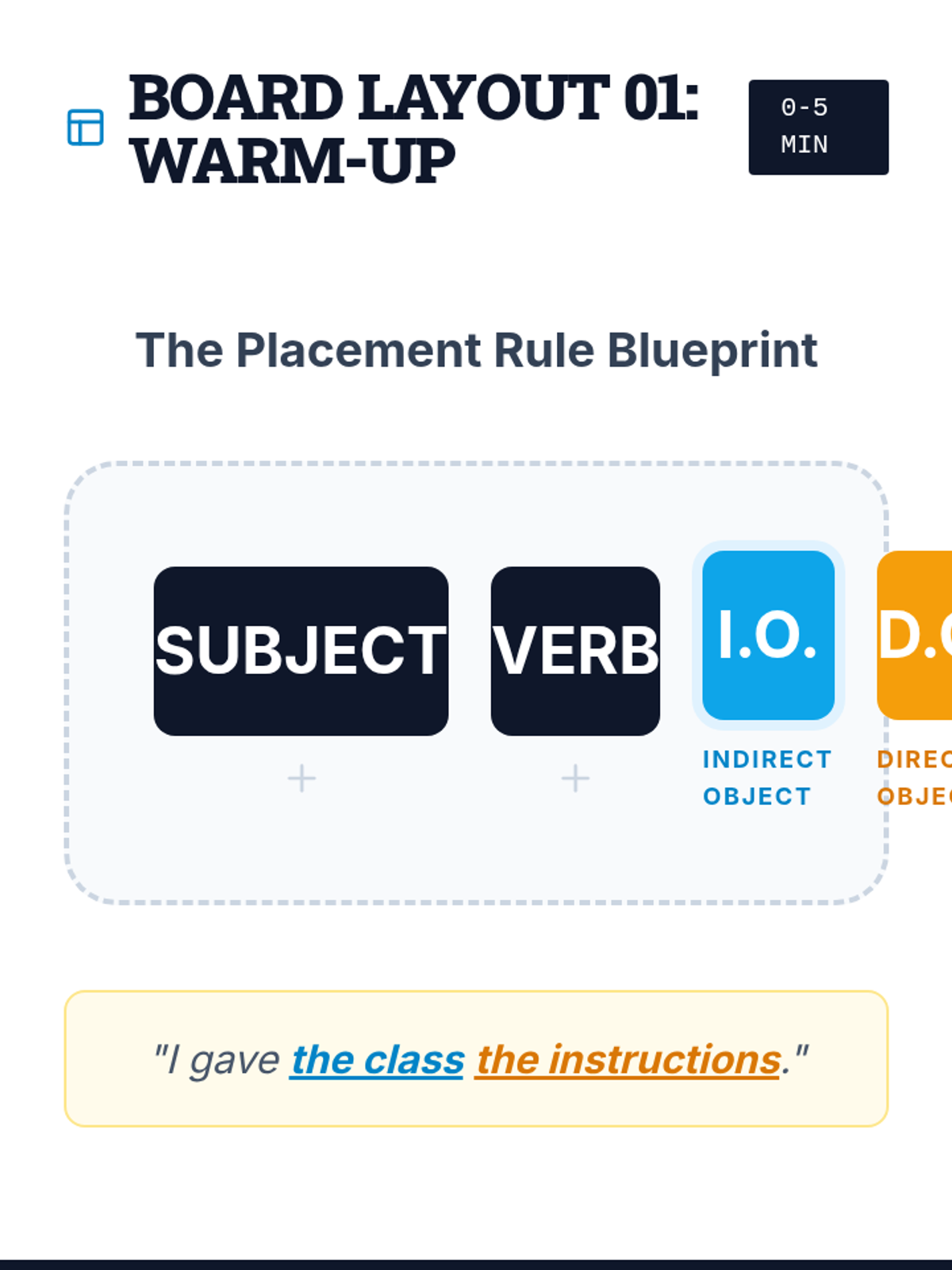A lesson focused on the mechanics of indirect objects and sentence structure. Students will master the placement rule (S-V-IO-DO) and learn to transform prepositional phrases into indirect objects while avoiding misplaced modifiers.