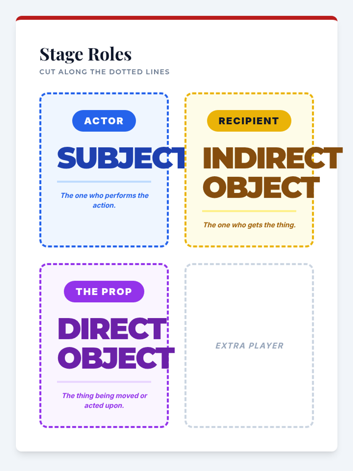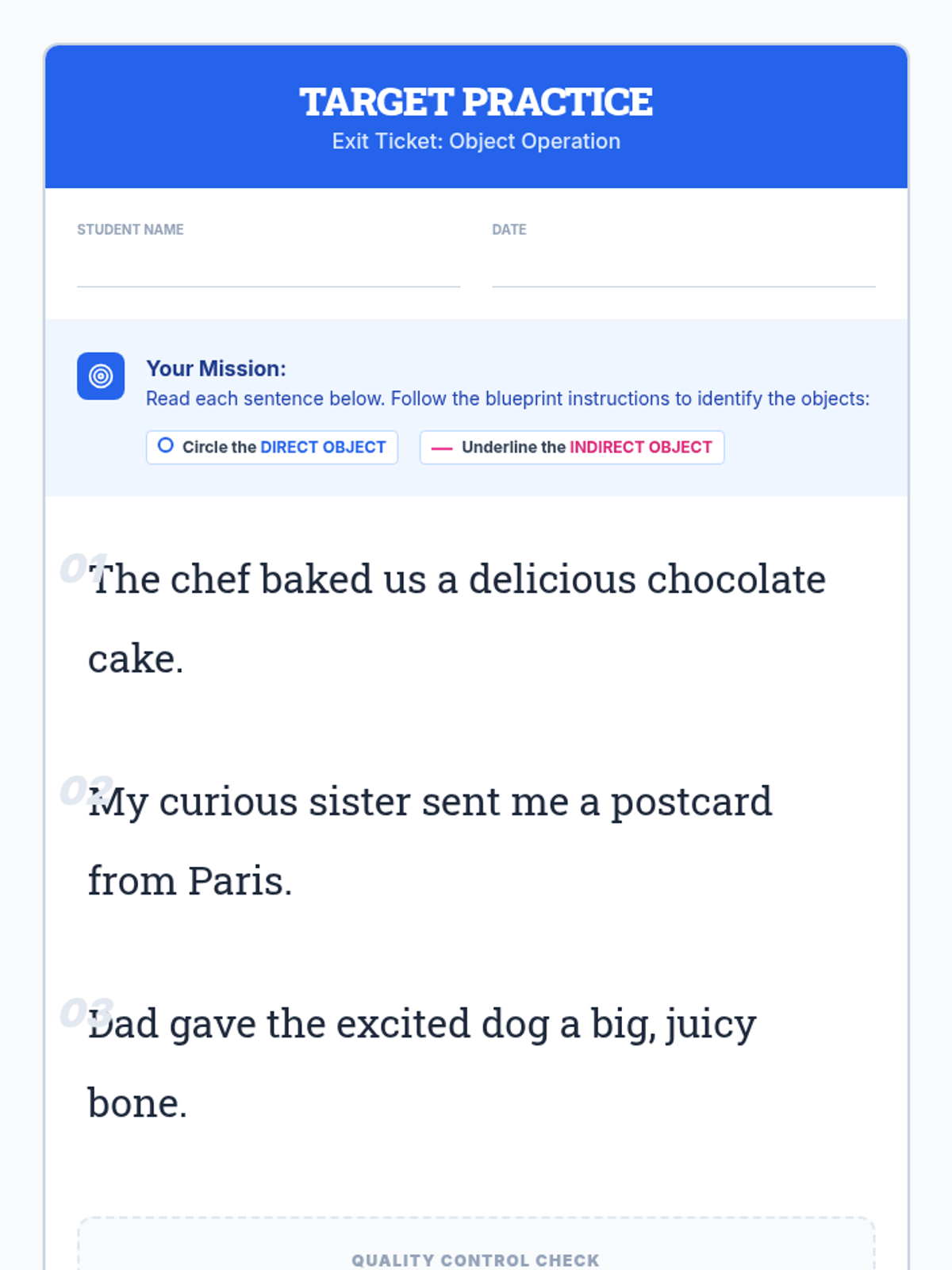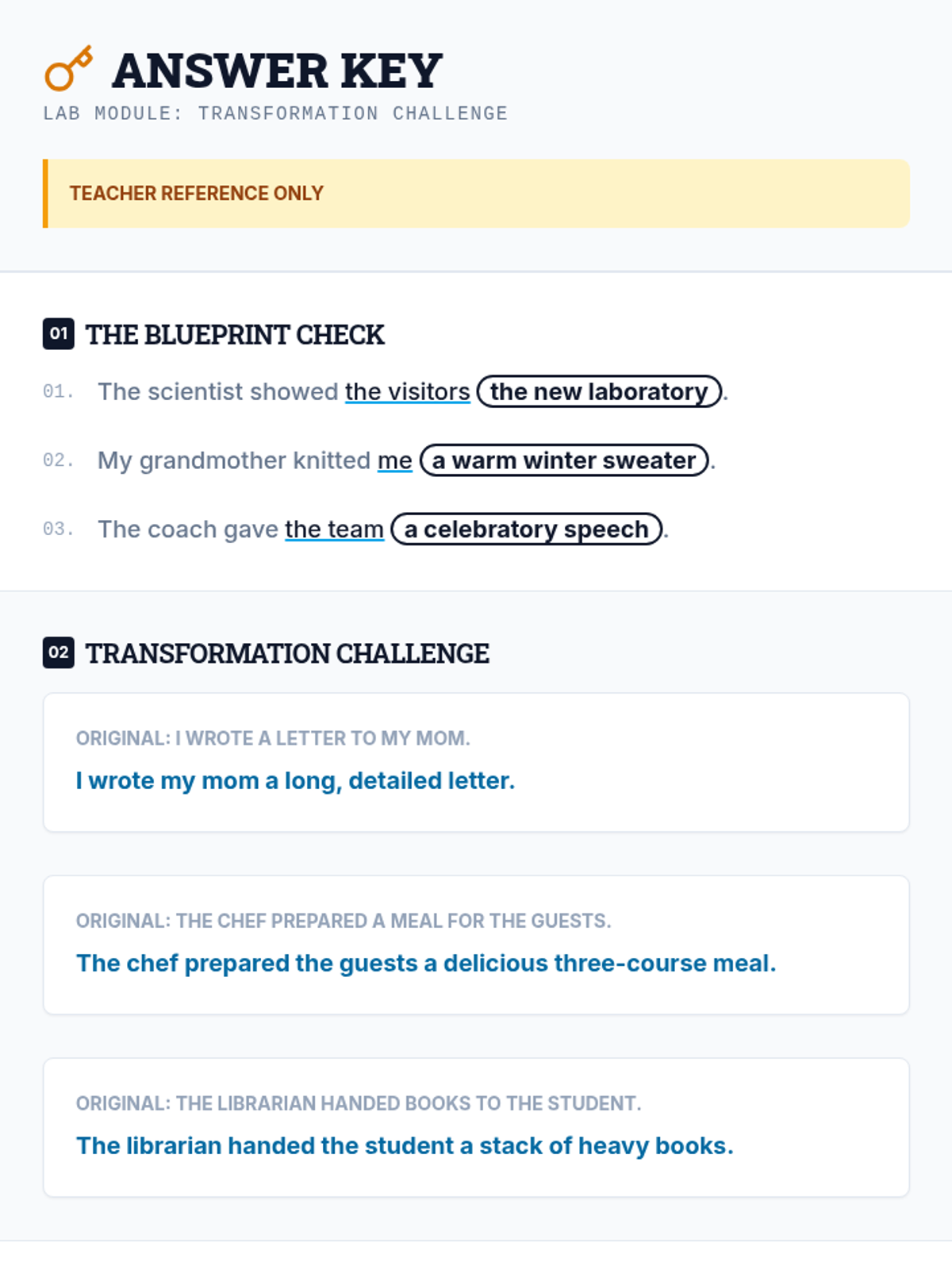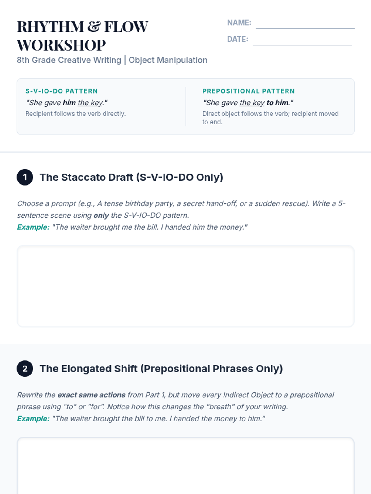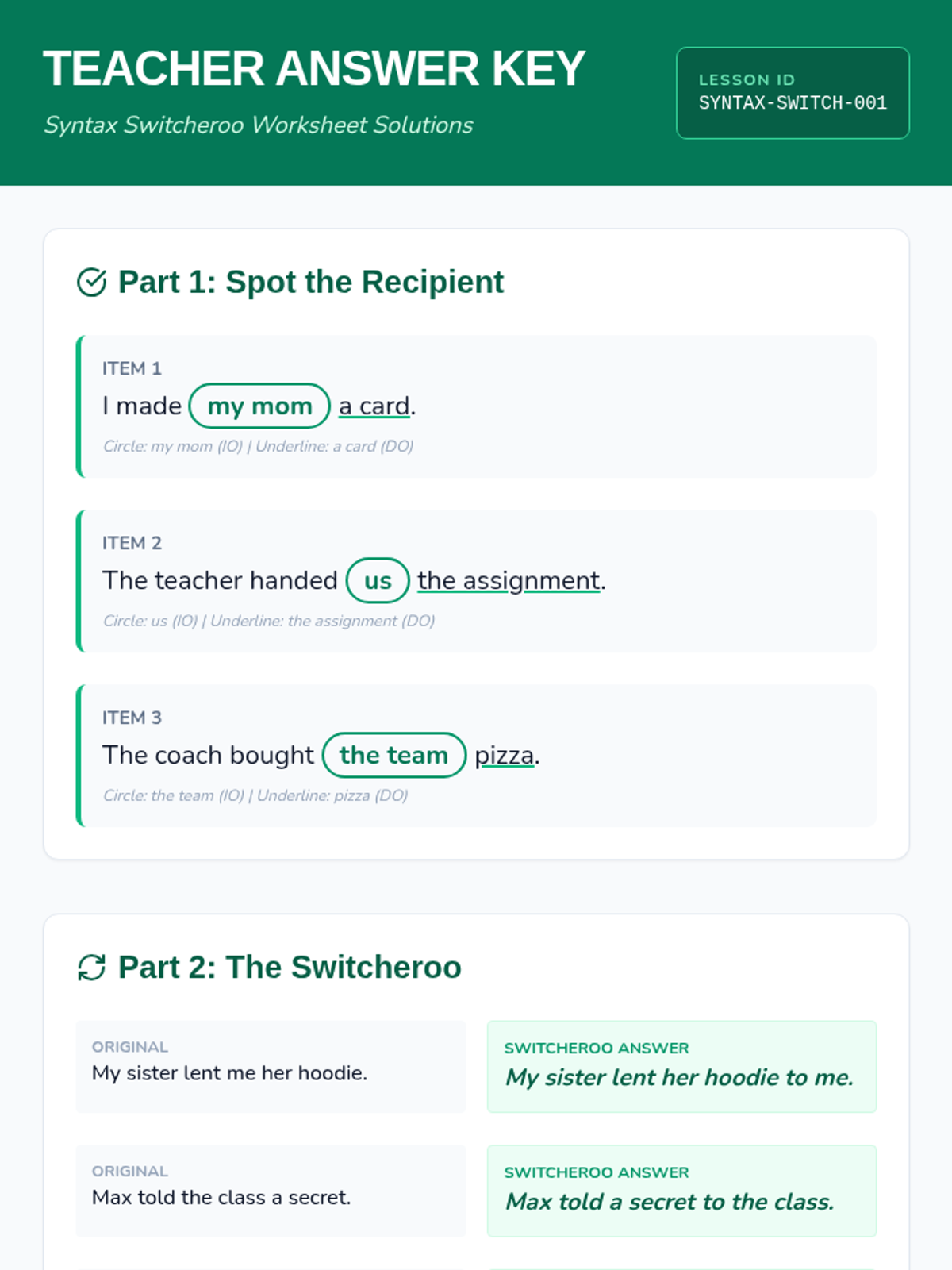 A lesson focused on the mechanics of indirect objects and sentence structure. Students will master the placement rule (S-V-IO-DO) and learn to transform prepositional phrases into indirect objects while avoiding misplaced modifiers.