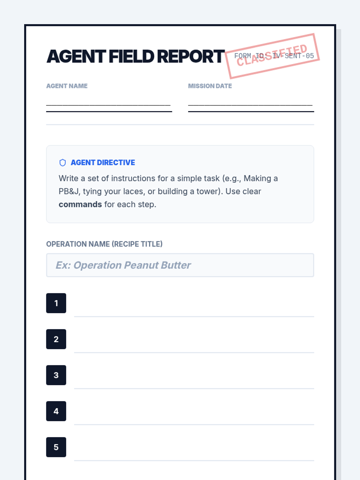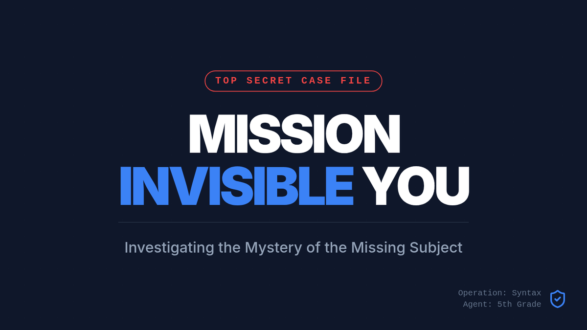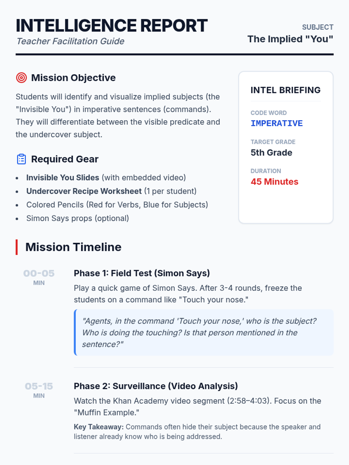 Students will investigate the 'Invisible You' subject in imperative sentences through a Simon Says warm-up, a Khan Academy video, and a creative recipe-writing task. The lesson uses a secret agent theme to make the concept of implied subjects engaging and memorable.
