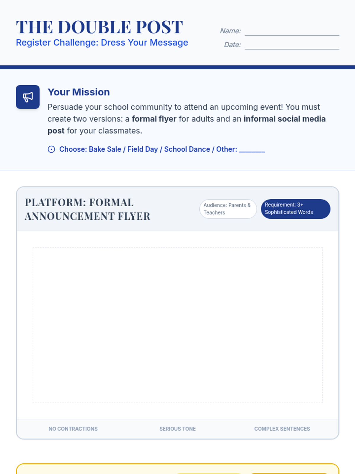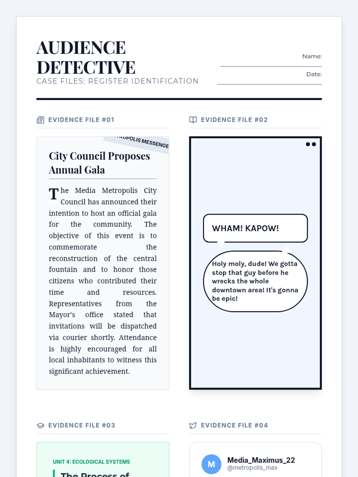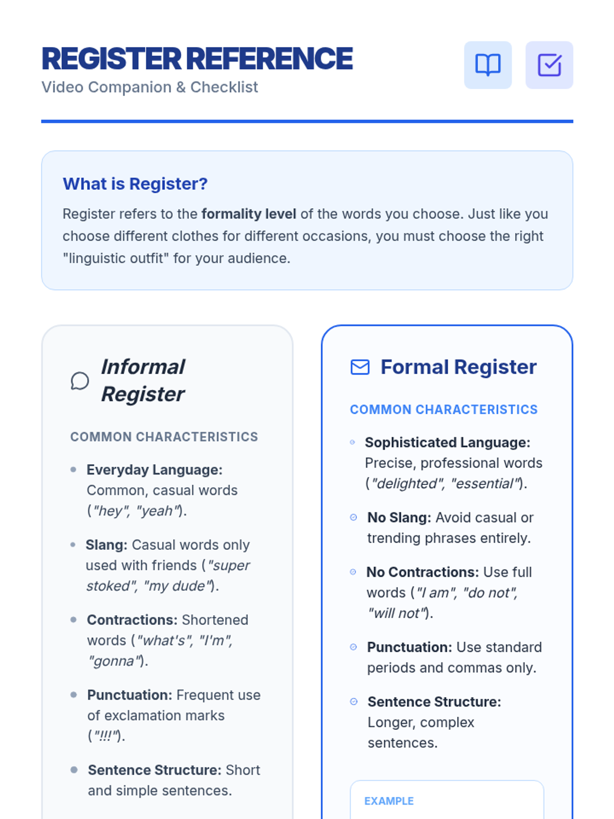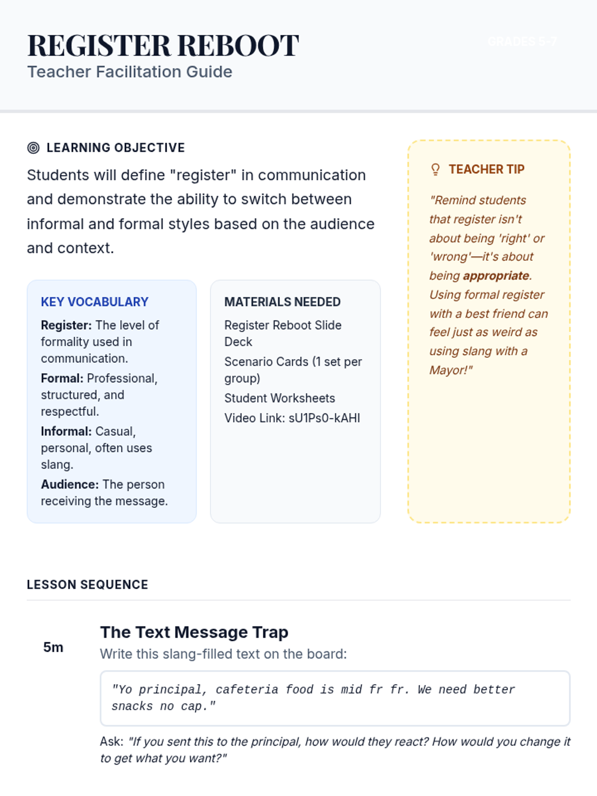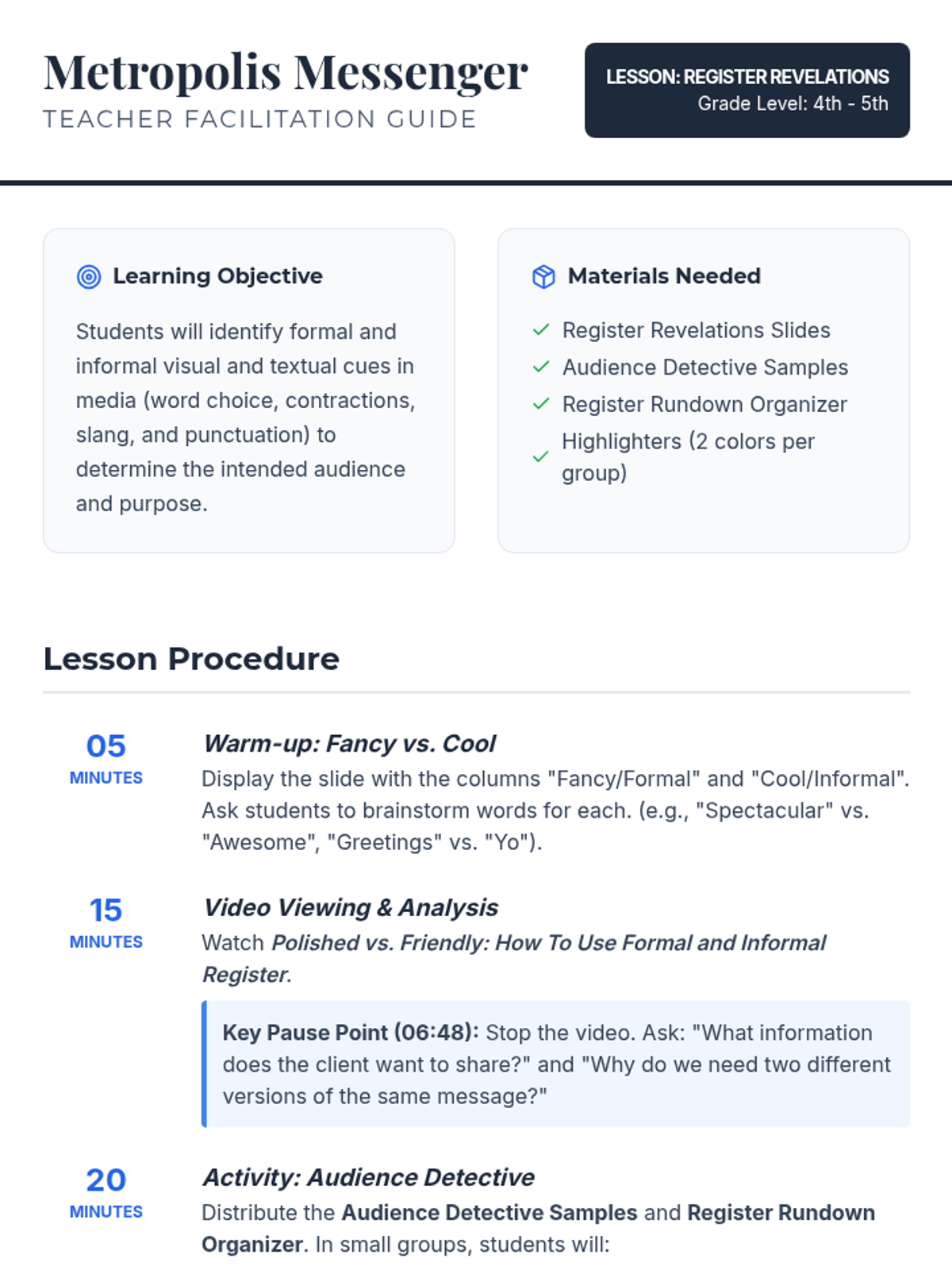 A lesson where students learn to distinguish between formal and informal register by examining word choice, punctuation, and sentence structure in various media formats. includes a video analysis, a collaborative detective activity, and a graphic organizer for evidence collection.