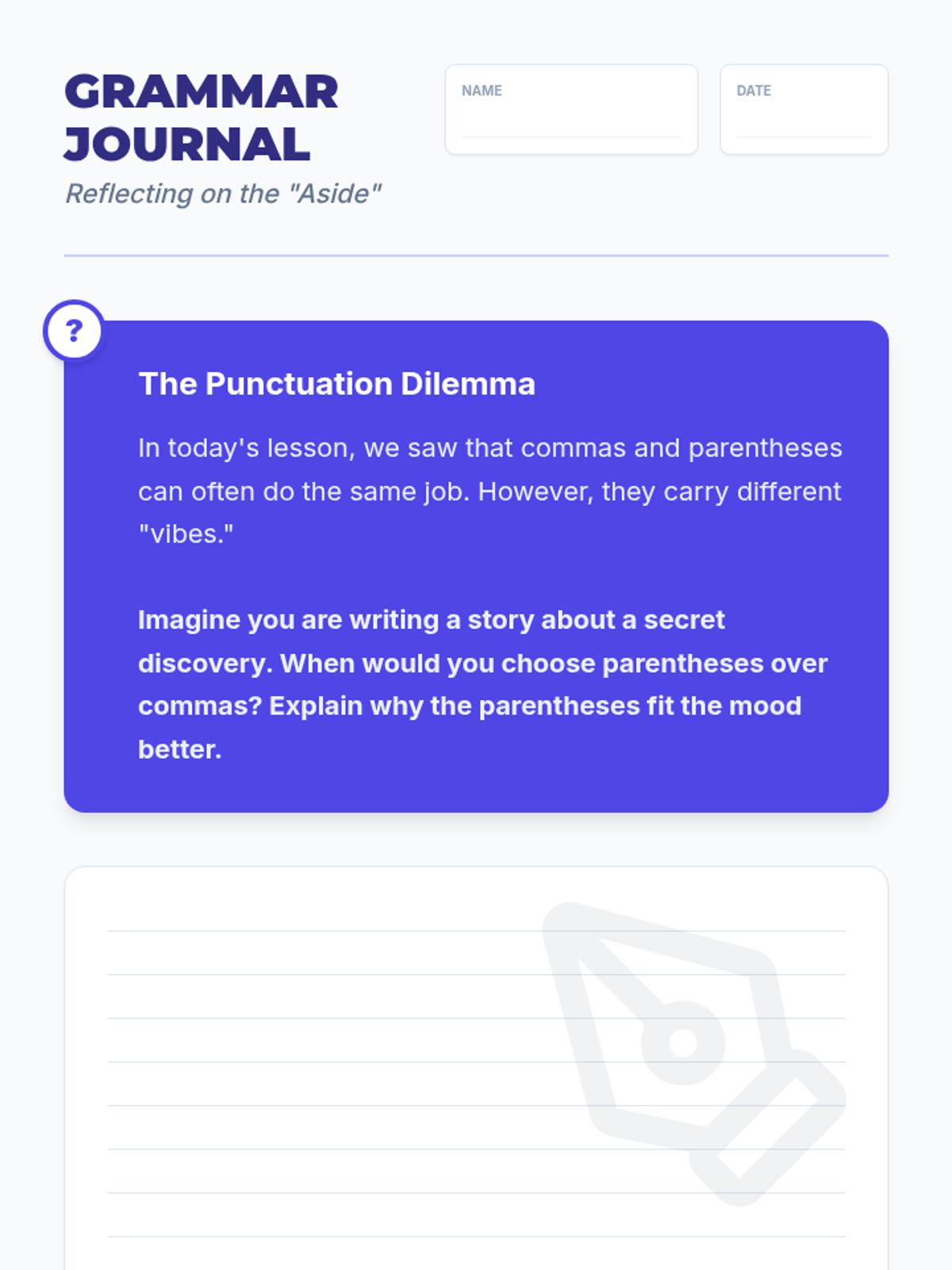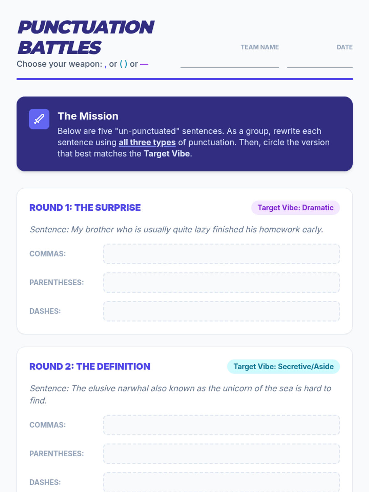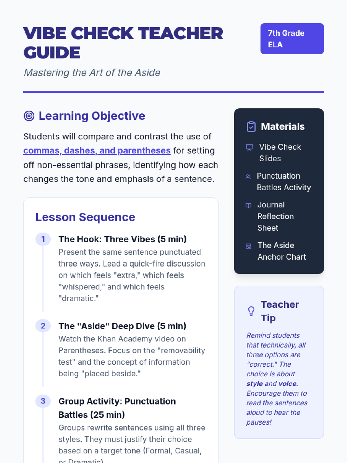 A lesson focusing on the subtle differences in tone and emphasis when using commas, dashes, and parentheses to set off non-essential information. Students explore the 'vibe' of each punctuation mark through a hook activity, a instructional video, and a collaborative 'Punctuation Battles' challenge.