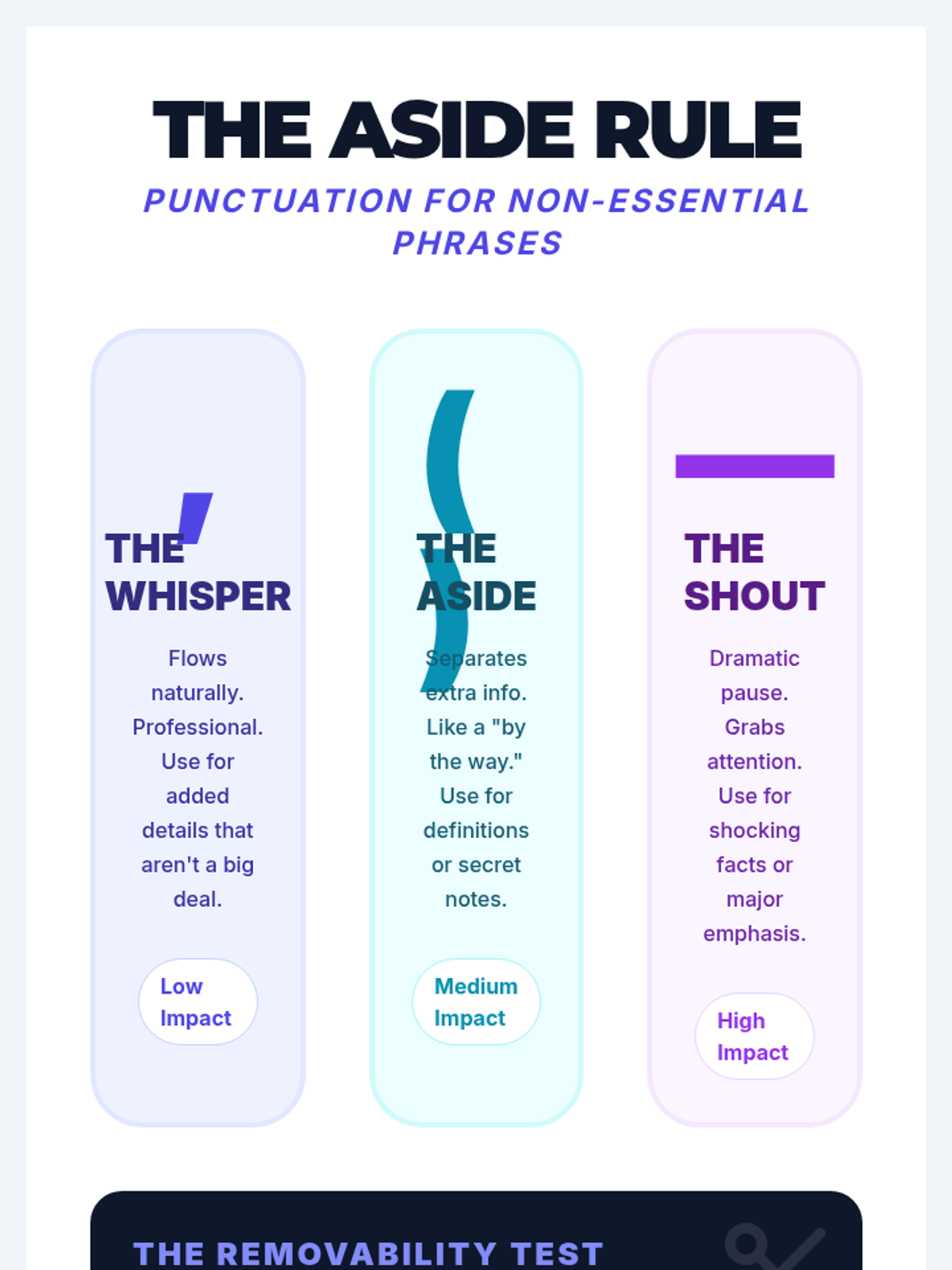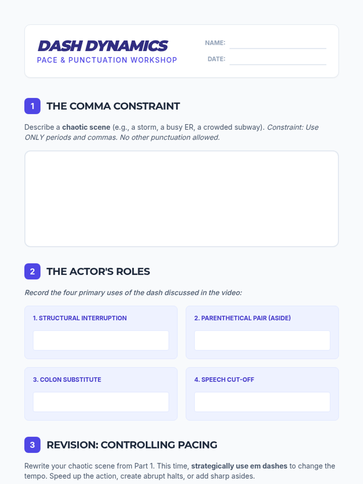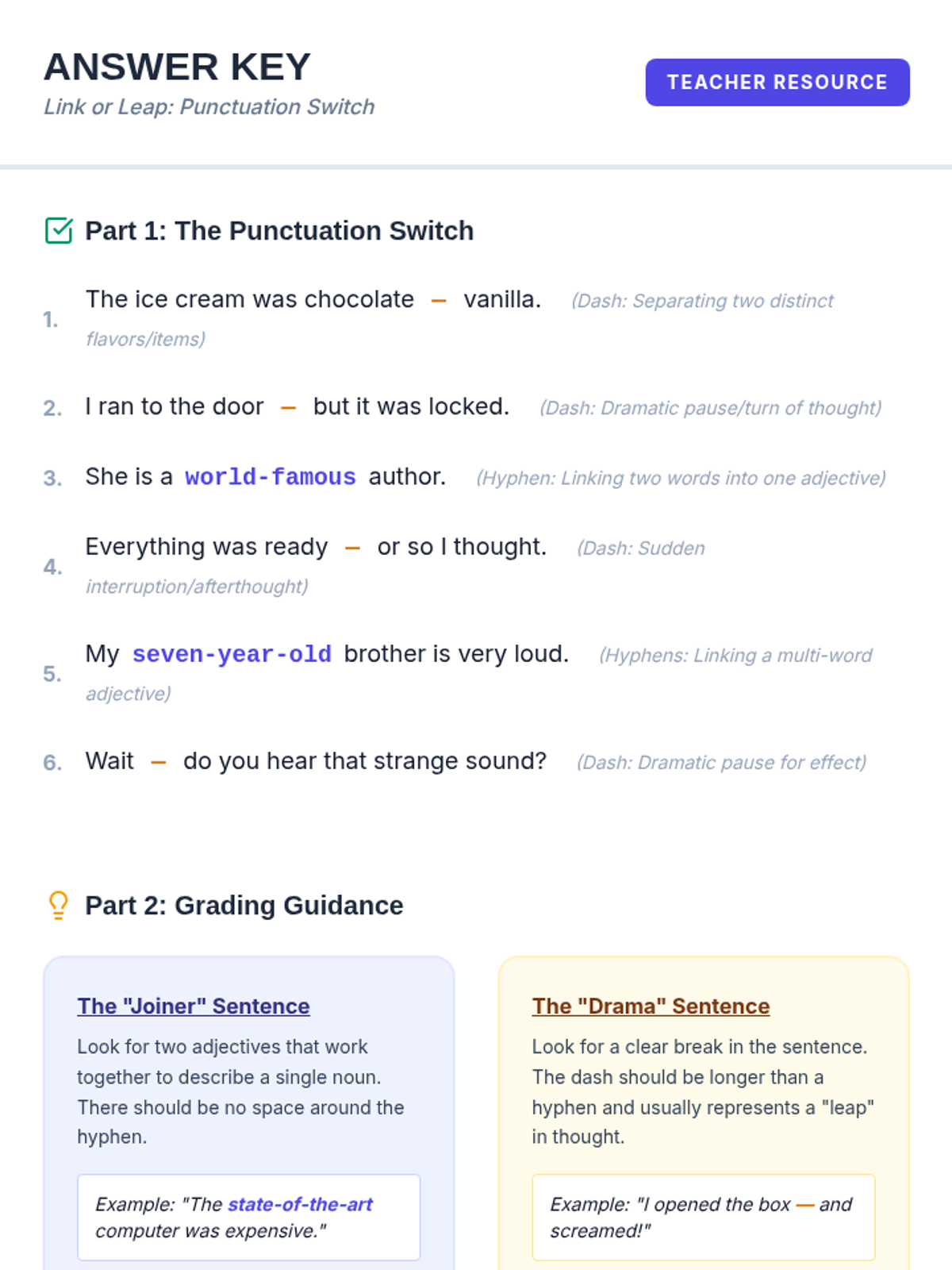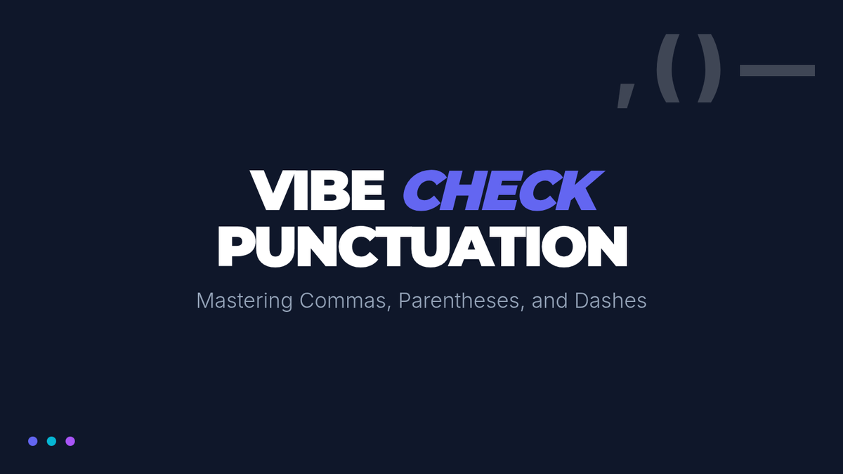 A lesson focusing on the subtle differences in tone and emphasis when using commas, dashes, and parentheses to set off non-essential information. Students explore the 'vibe' of each punctuation mark through a hook activity, a instructional video, and a collaborative 'Punctuation Battles' challenge.