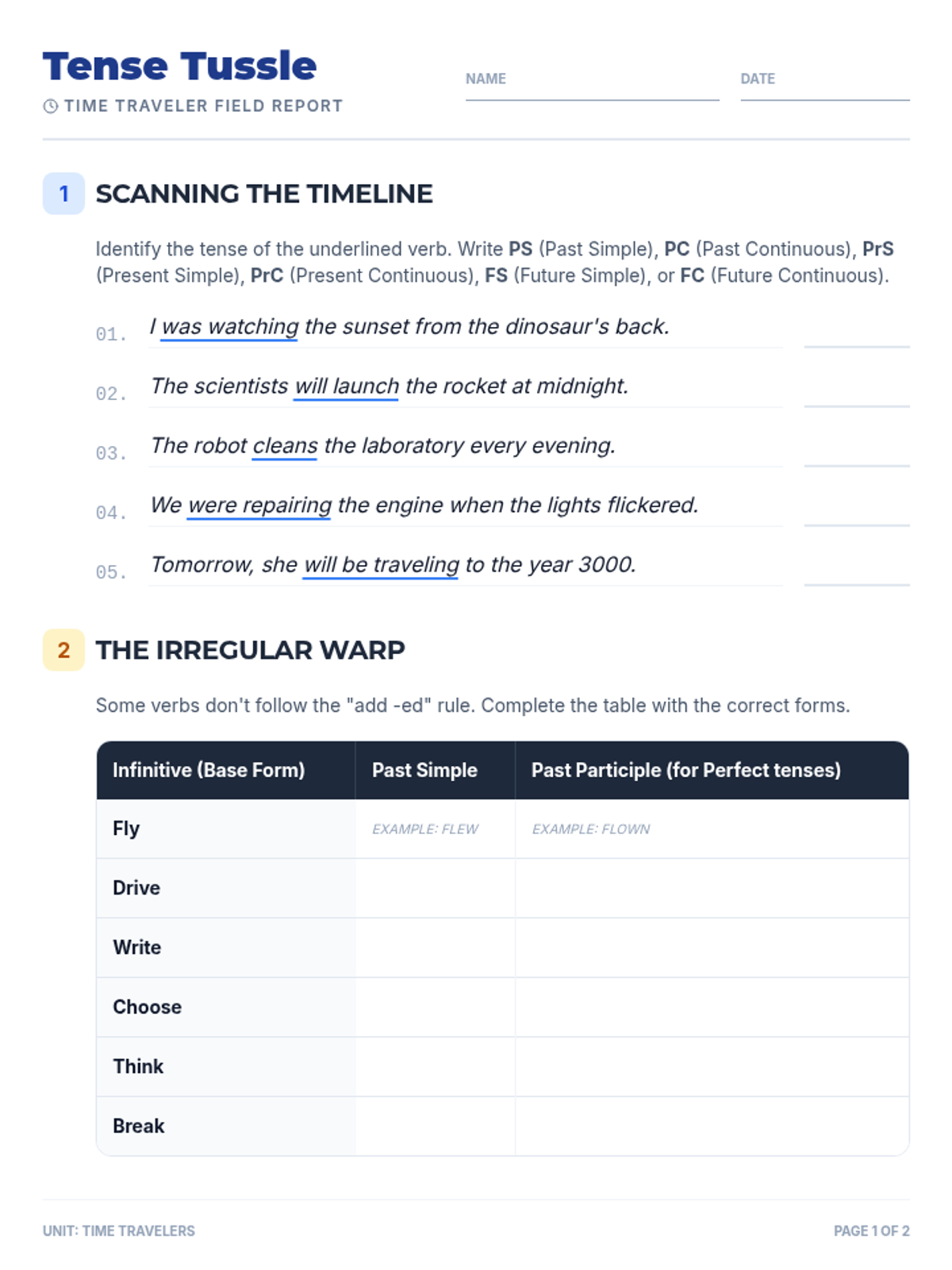 A comprehensive review of all six tenses covered in the unit. Students practice switching between tenses in complex sentences and stories.