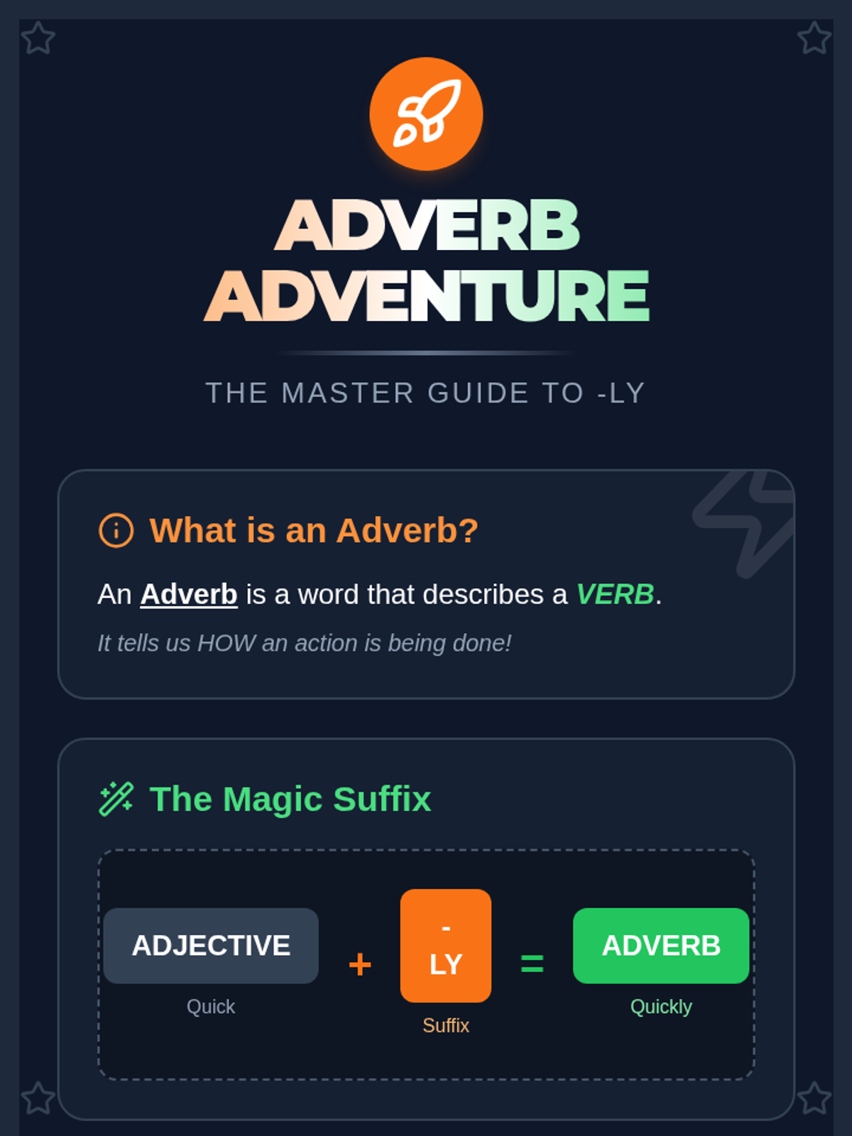 Students learn how adverbs modify verbs, adjectives, and other adverbs to specify how, when, and where actions happen in the 'Adverb Abyss'.