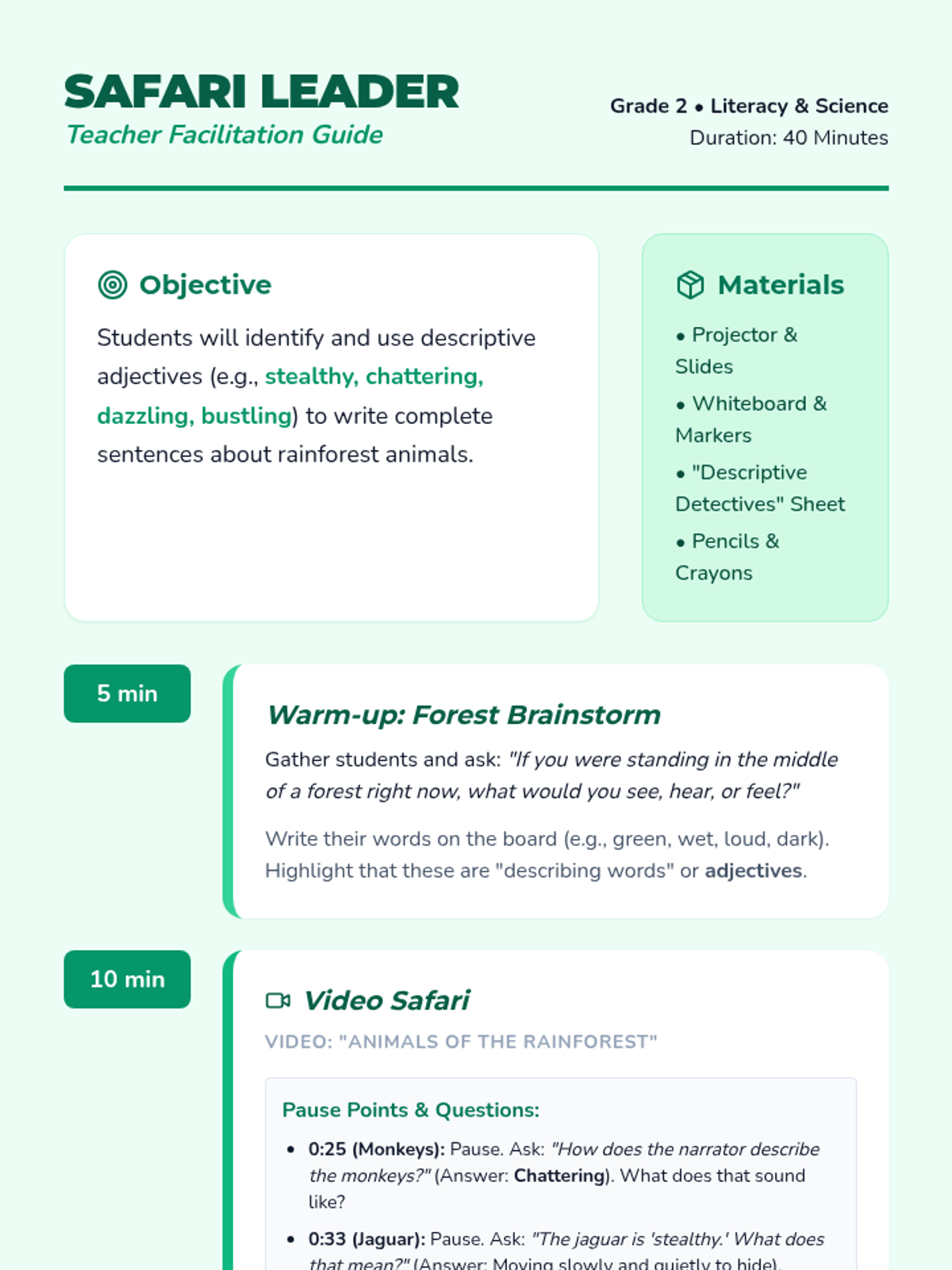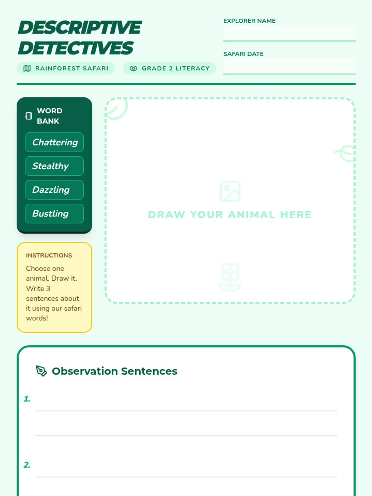 Students will explore the vibrant world of the rainforest through video and discussion, focusing on using descriptive adjectives like 'stealthy' and 'bustling' to write about their favorite animals.