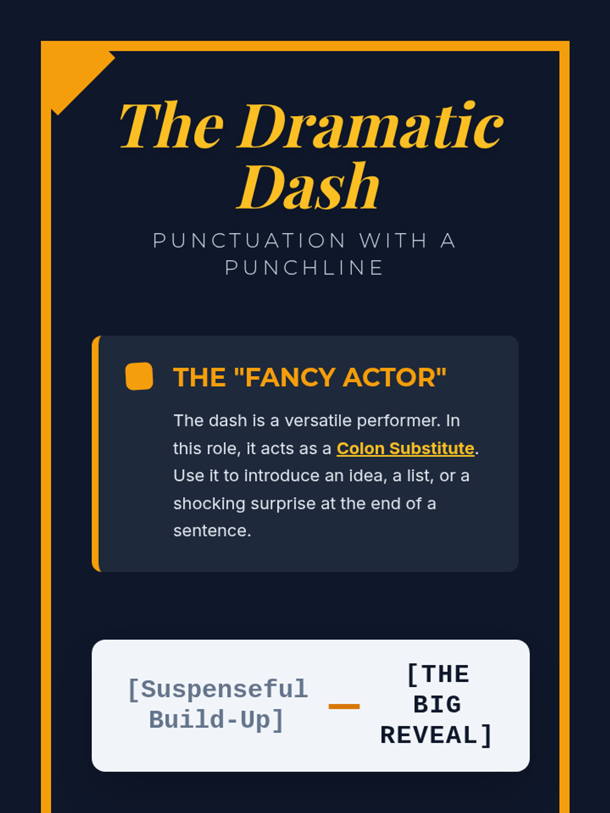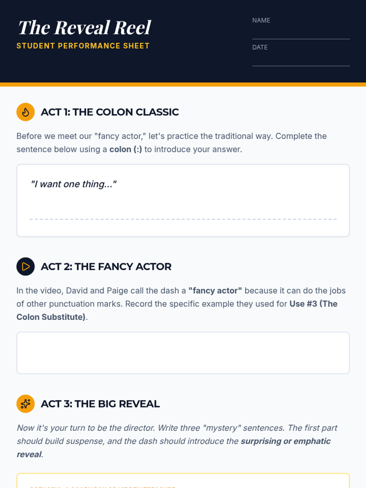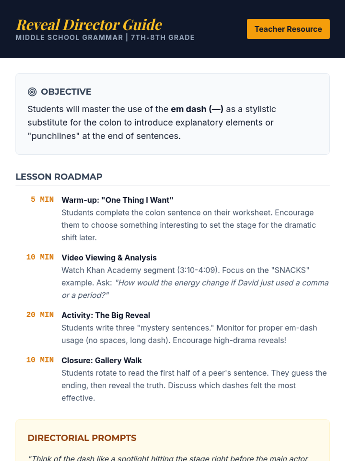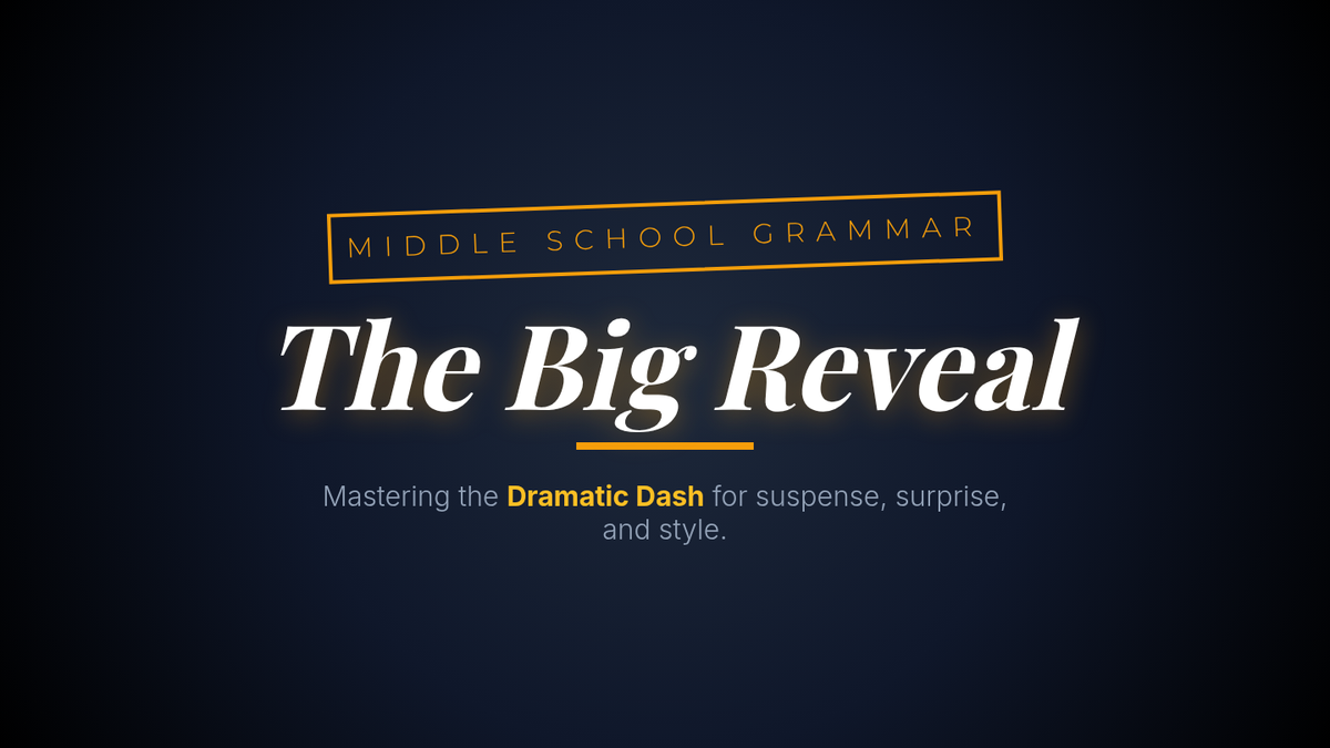 Students learn to use the em dash as a stylistic substitute for a colon to introduce 'punchlines' and dramatic reveals in their writing. The lesson features a Khan Academy video and a creative writing activity called 'The Big Reveal.'