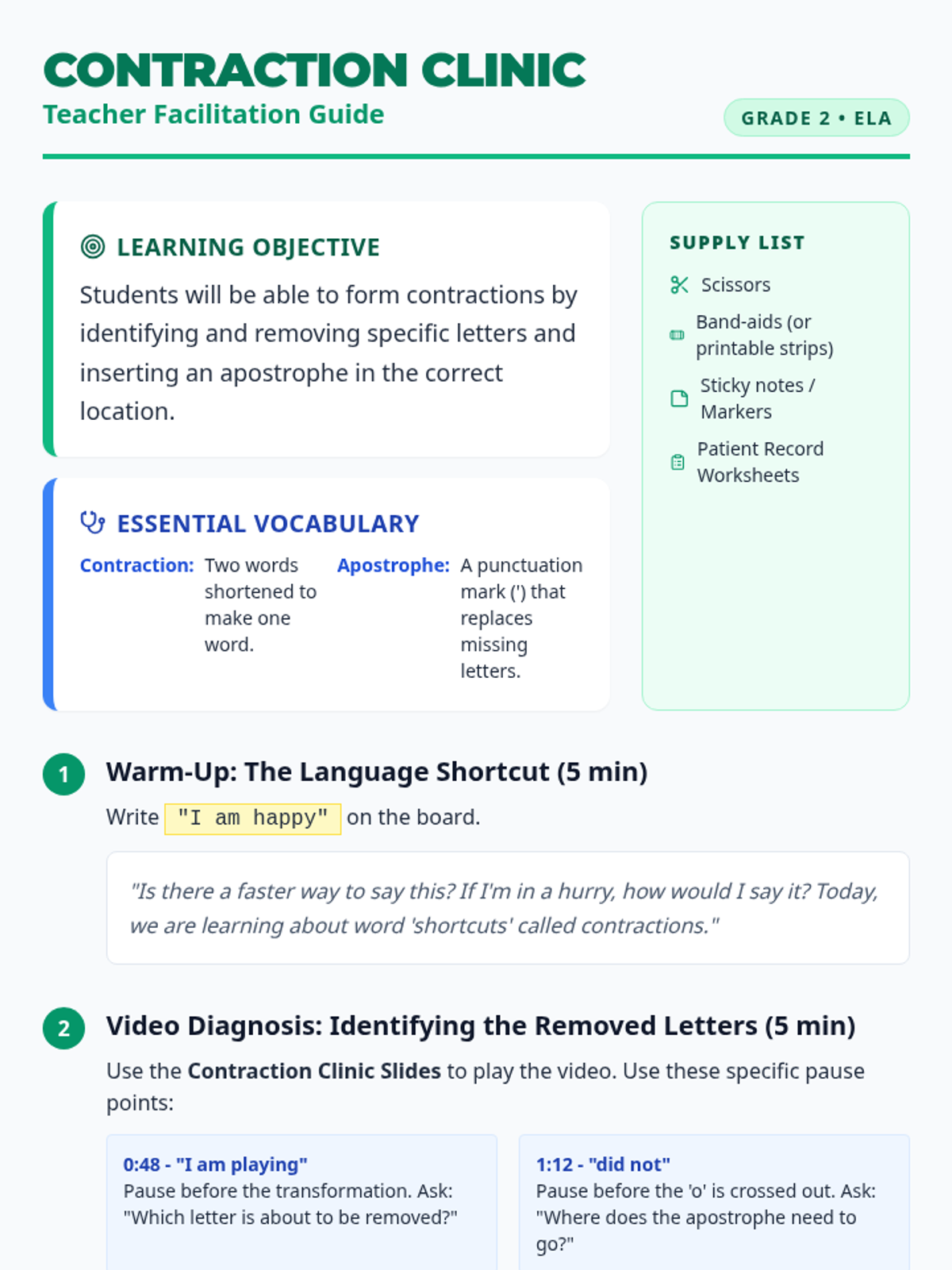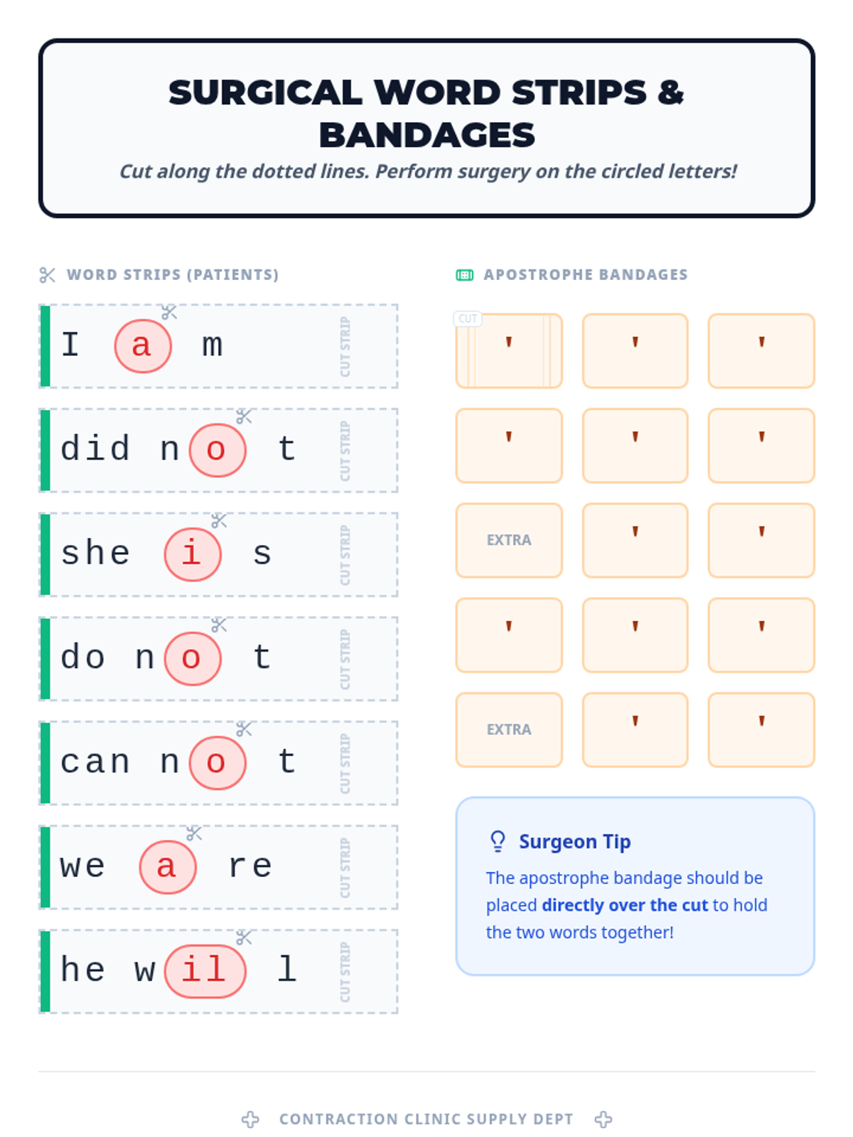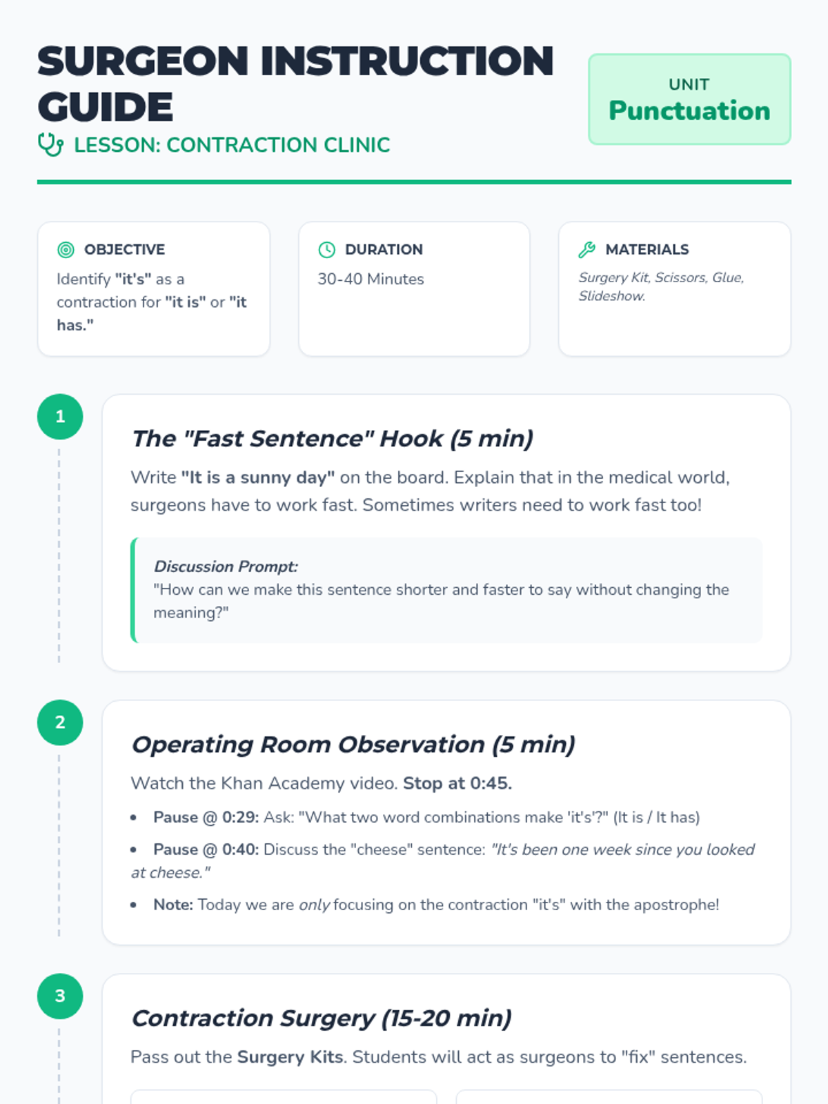 A medical-themed lesson where 2nd-grade students become 'surgeons' to perform 'Contraction Surgery,' removing letters and 'bandaging' words back together with apostrophes. includes a video guide, hands-on activity, and student recording sheets.