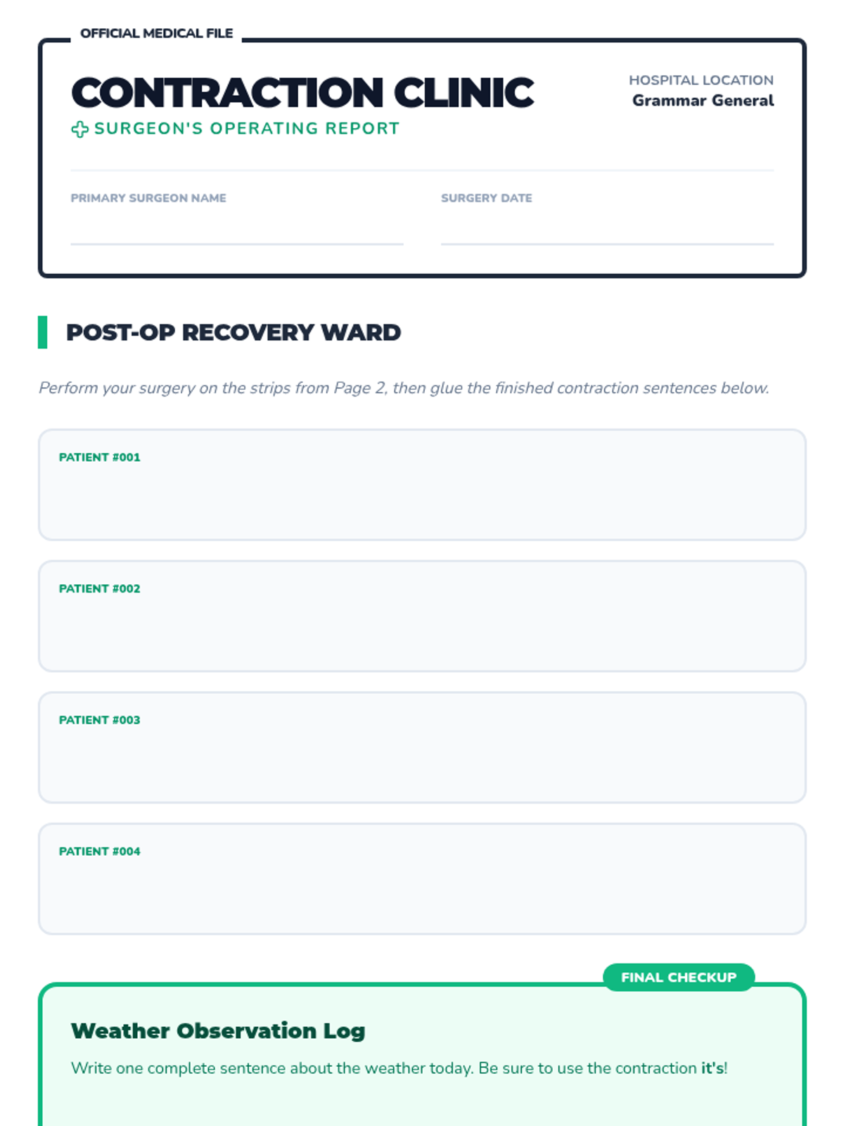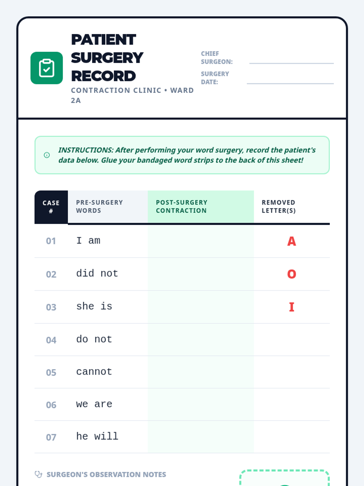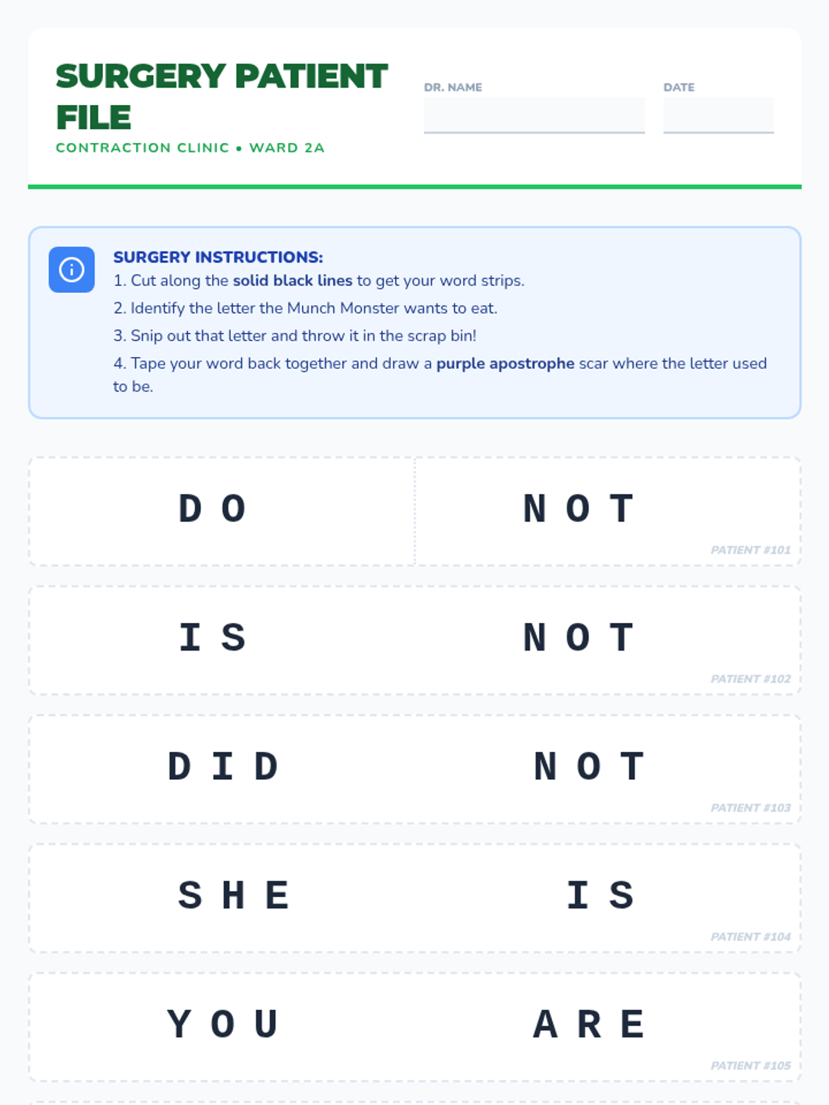 A medical-themed lesson where 2nd-grade students become 'surgeons' to perform 'Contraction Surgery,' removing letters and 'bandaging' words back together with apostrophes. includes a video guide, hands-on activity, and student recording sheets.