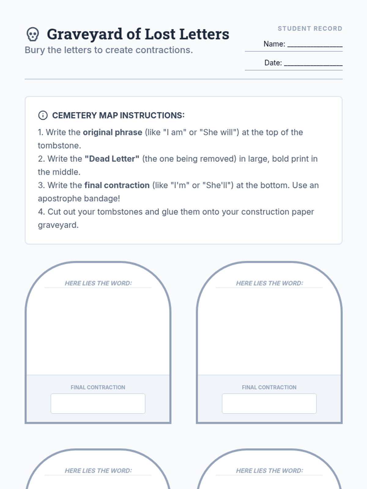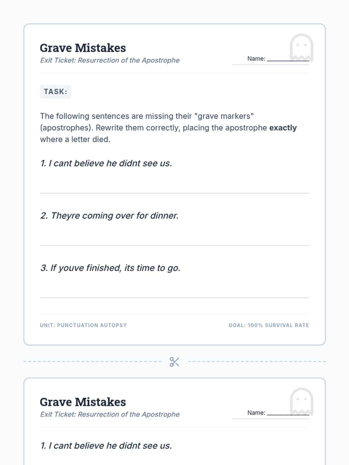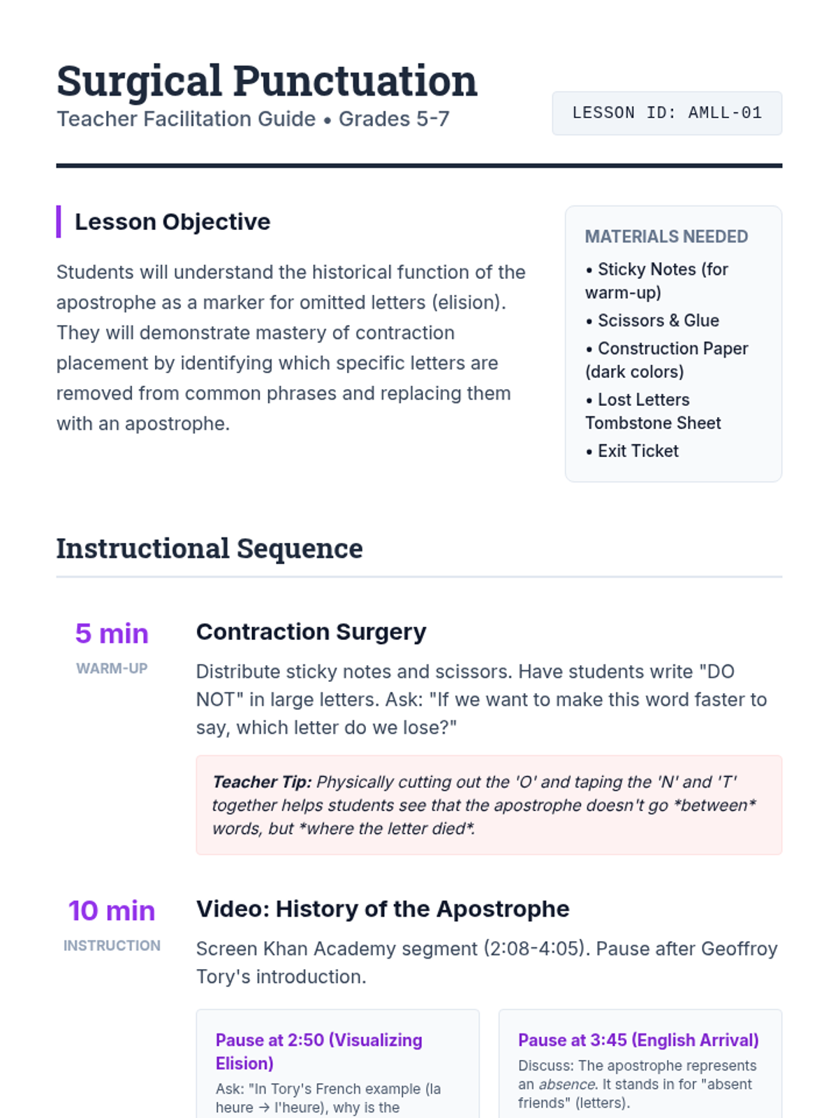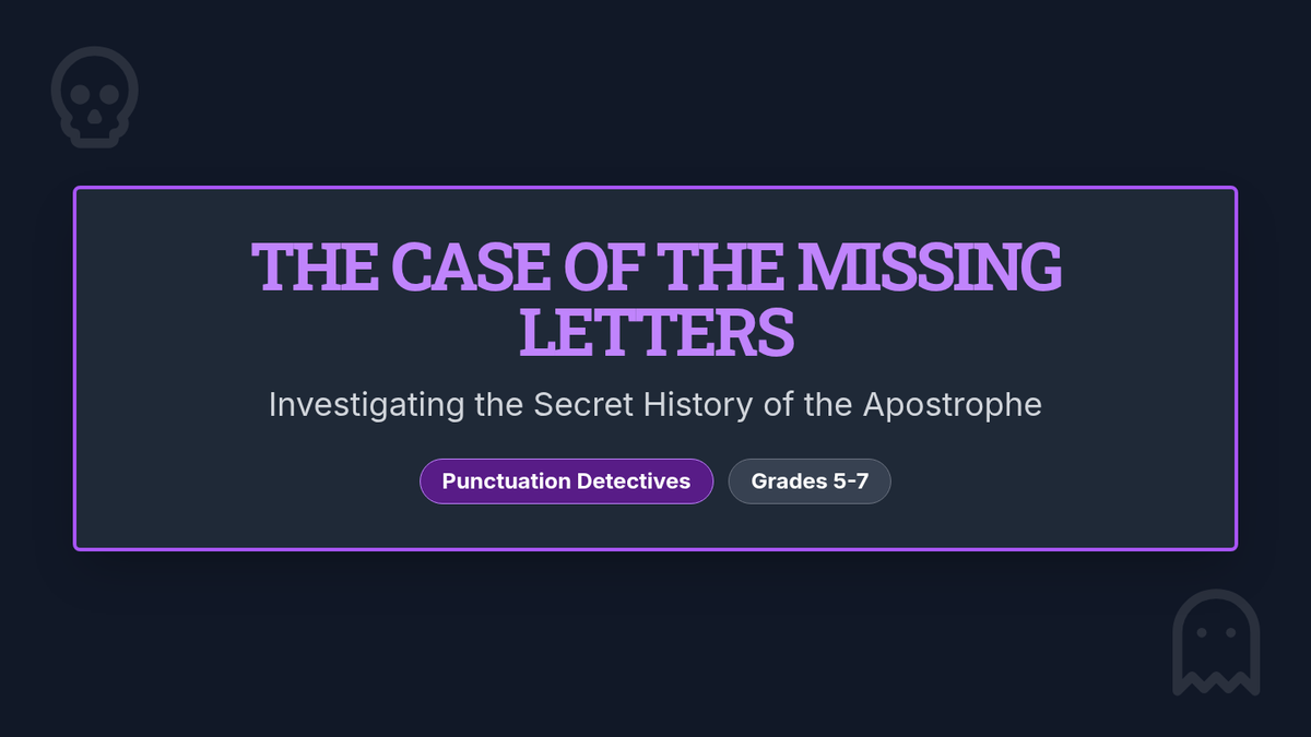 Students will investigate the history of the apostrophe and practice contraction placement by identifying 'missing letters' that 'die' to form new words. The lesson includes a hands-on 'surgery' warm-up, a historical video, and a creative 'Graveyard of Lost Letters' activity.