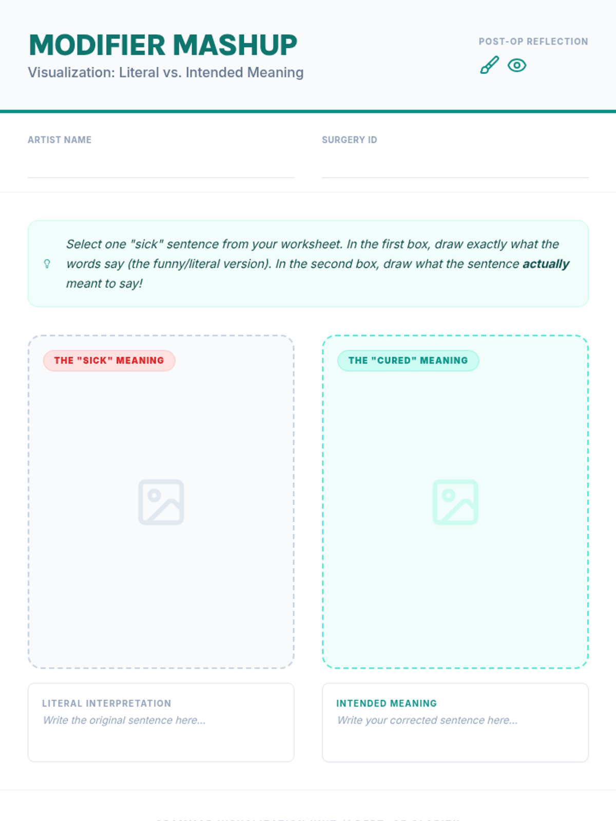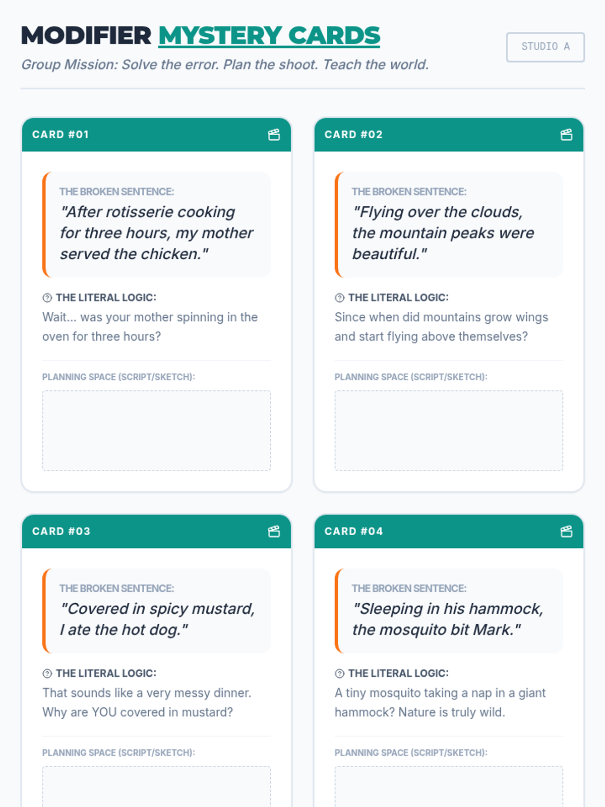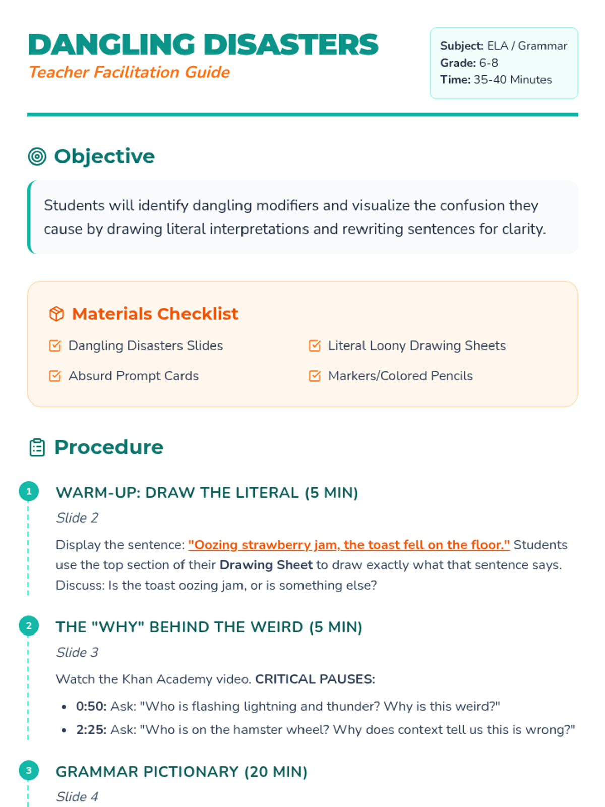 A visualization-heavy lesson where students draw the 'absurd' literal meanings of dangling modifiers to understand syntax errors. Includes a slide deck, teacher guide, activity cards, and drawing worksheets.