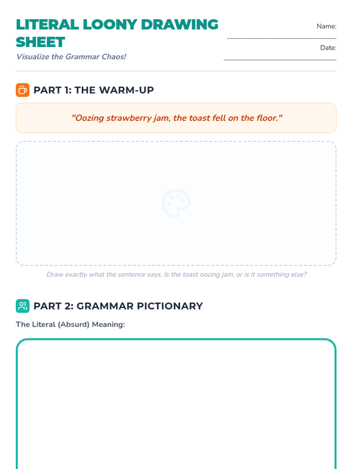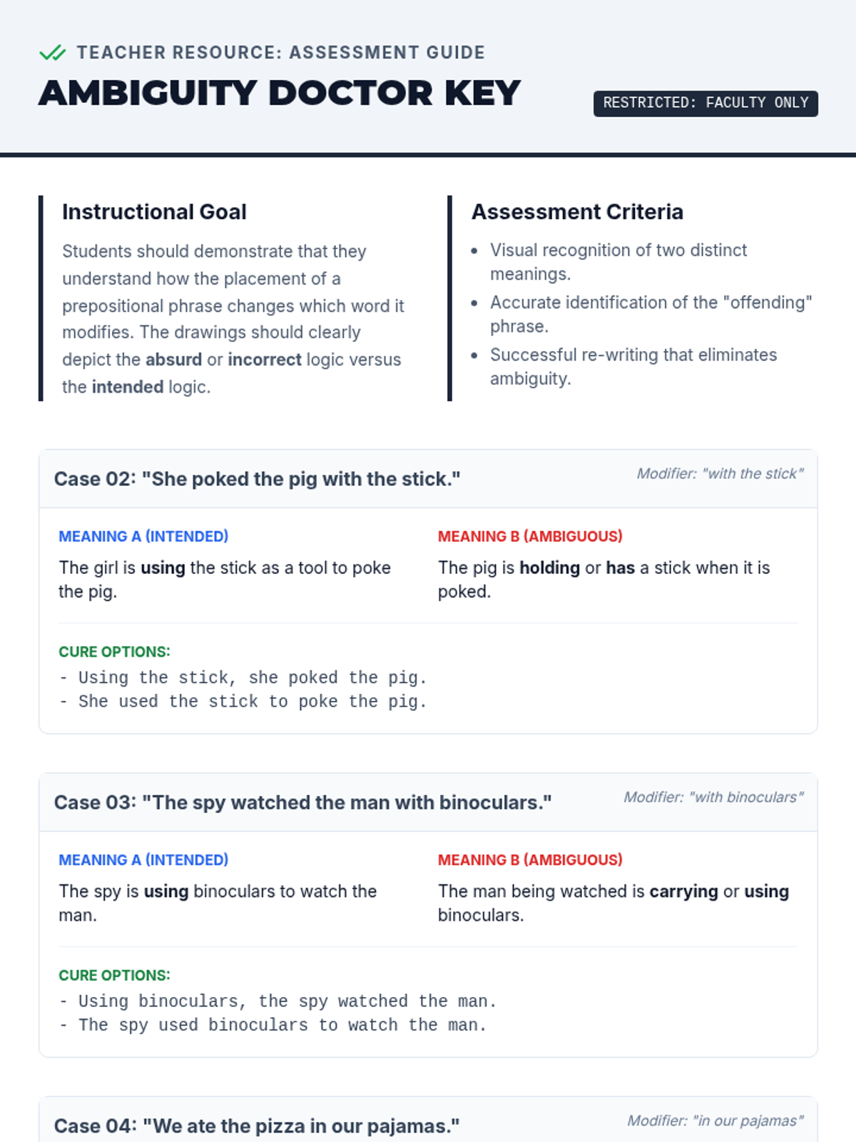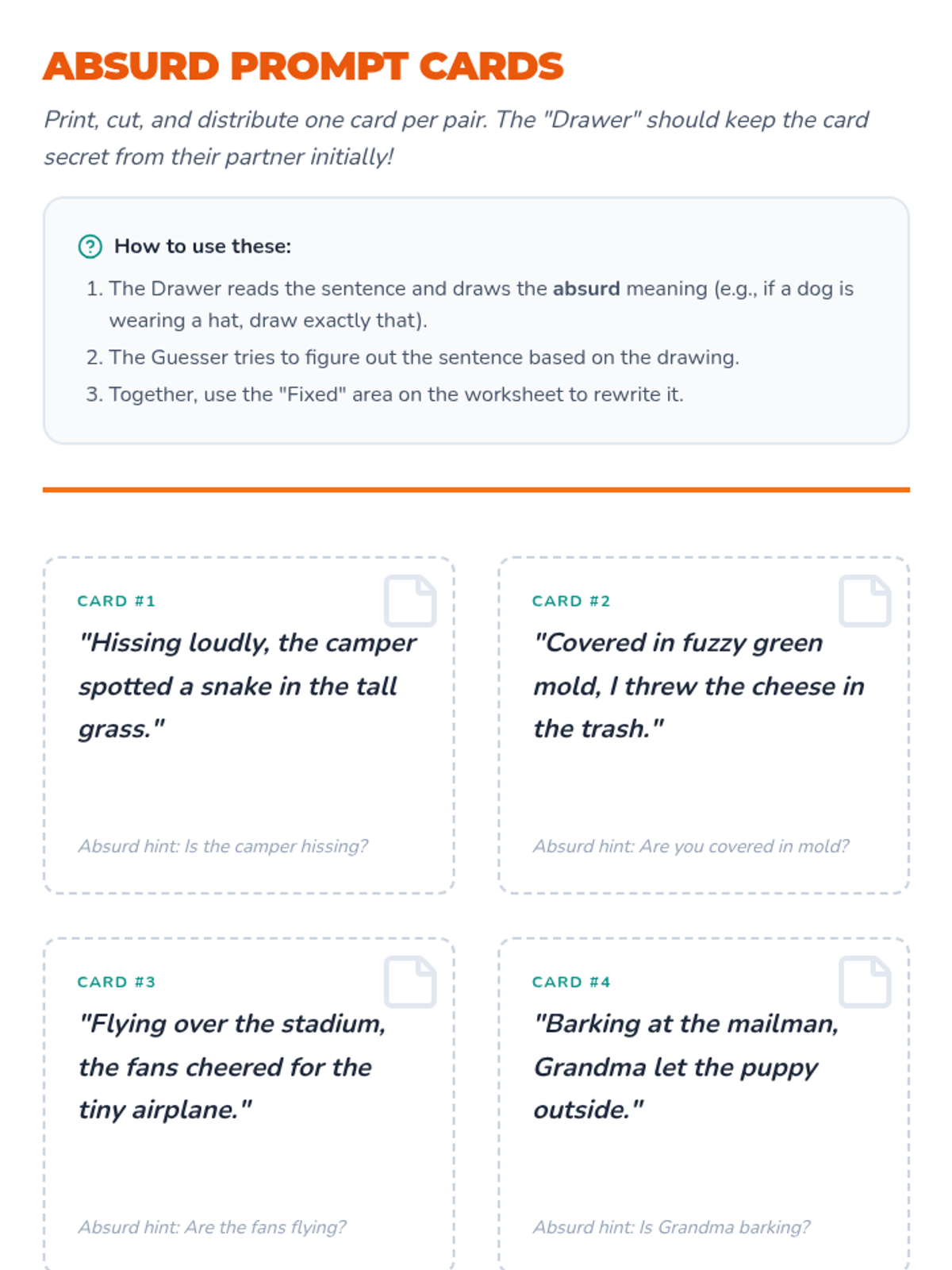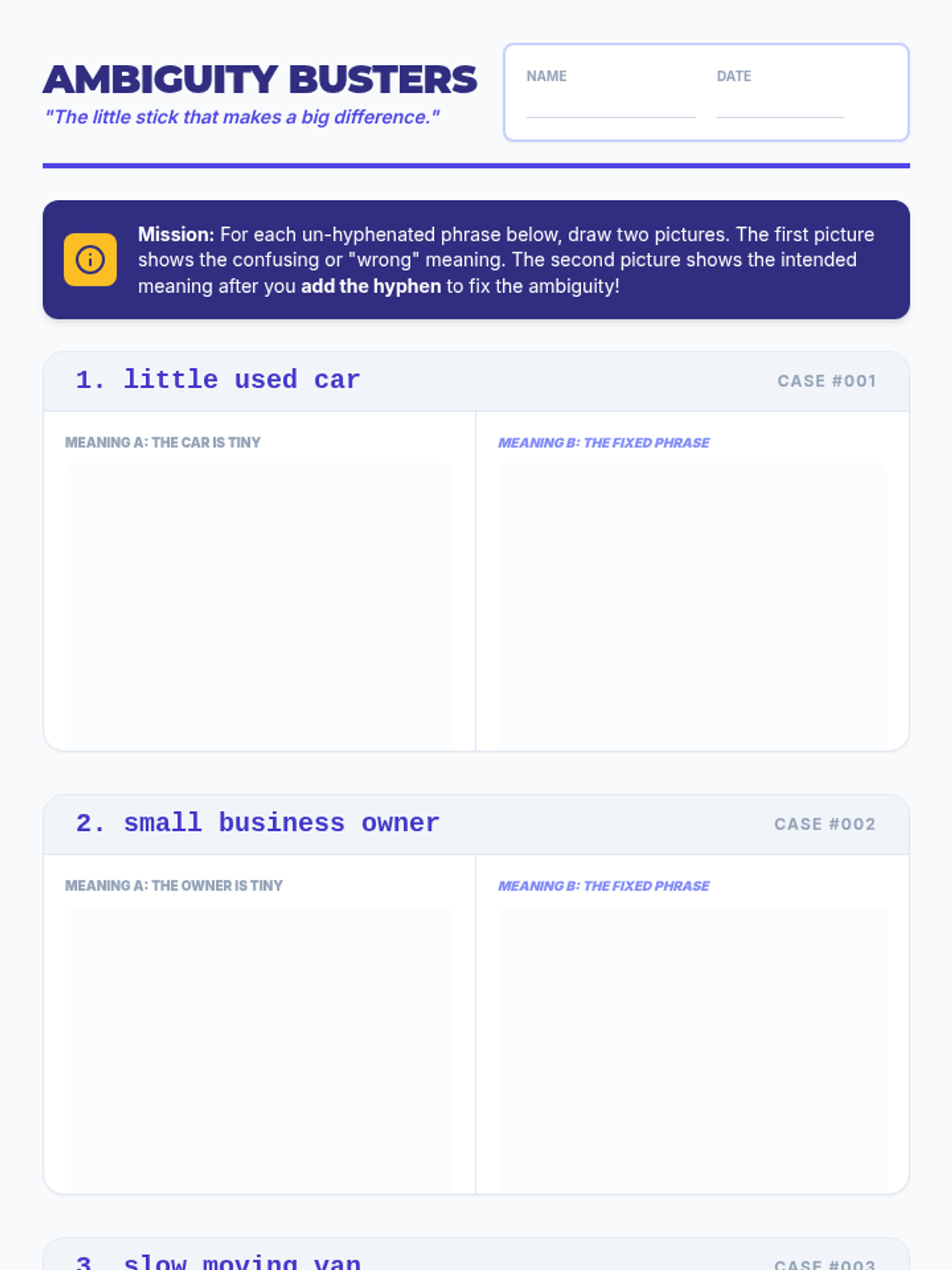 A visualization-heavy lesson where students draw the 'absurd' literal meanings of dangling modifiers to understand syntax errors. Includes a slide deck, teacher guide, activity cards, and drawing worksheets.
