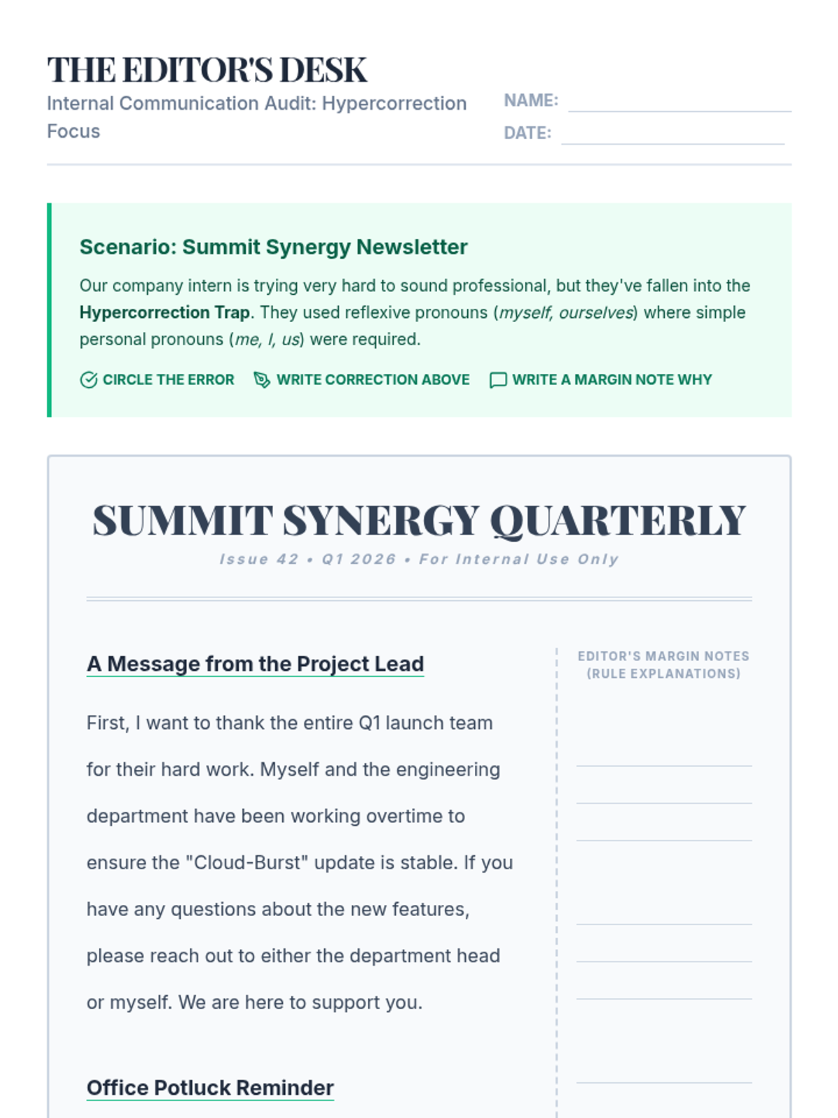 A grammar lesson for 8th graders focusing on the common 'hypercorrection' of using reflexive pronouns like 'myself' to sound more formal, featuring a business newsletter editing activity.