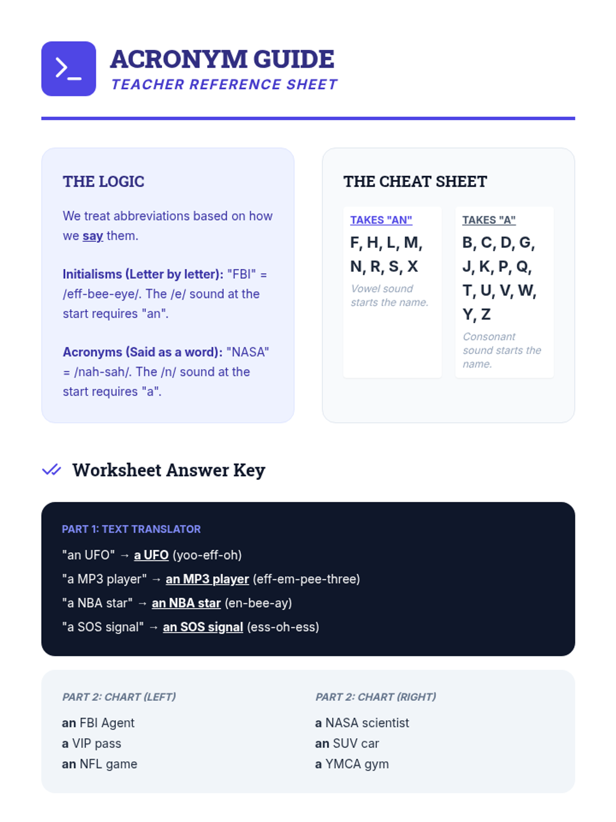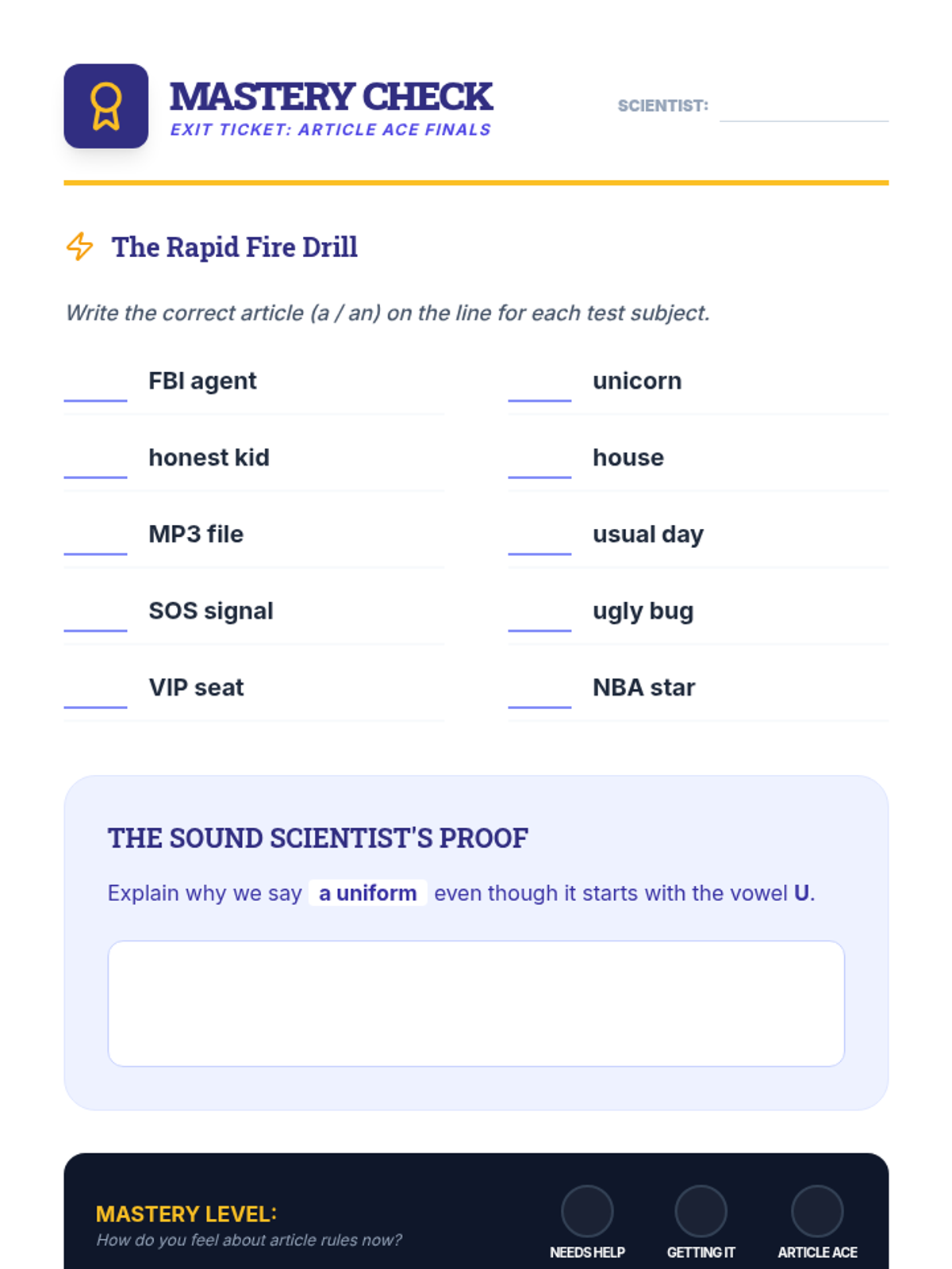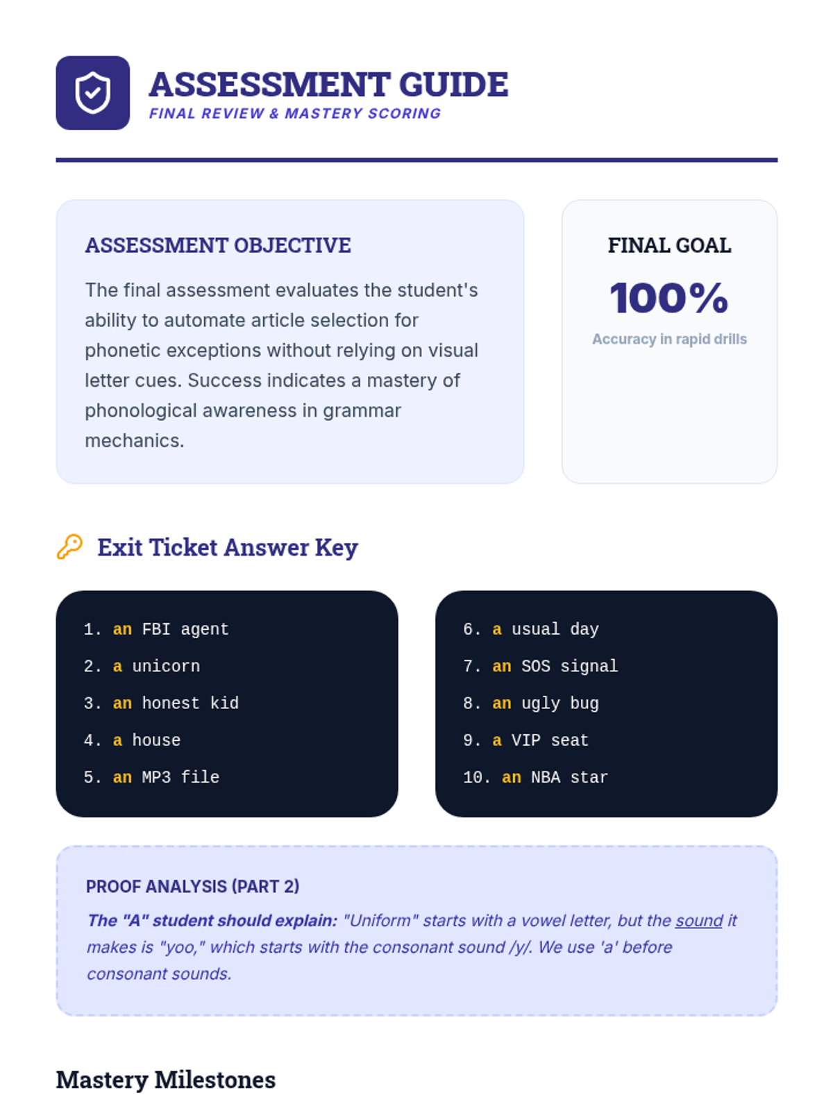 A 3rd-grade grammar lesson focusing on the use of indefinite articles 'a' and 'an' based on phonetic vowel sounds rather than just spelling. Includes a warm-up, video discussion, phonetic sorting activity, and an exit ticket.