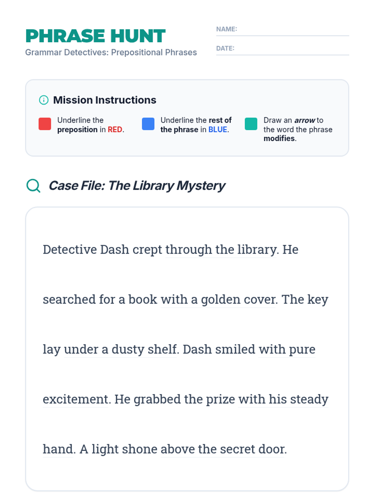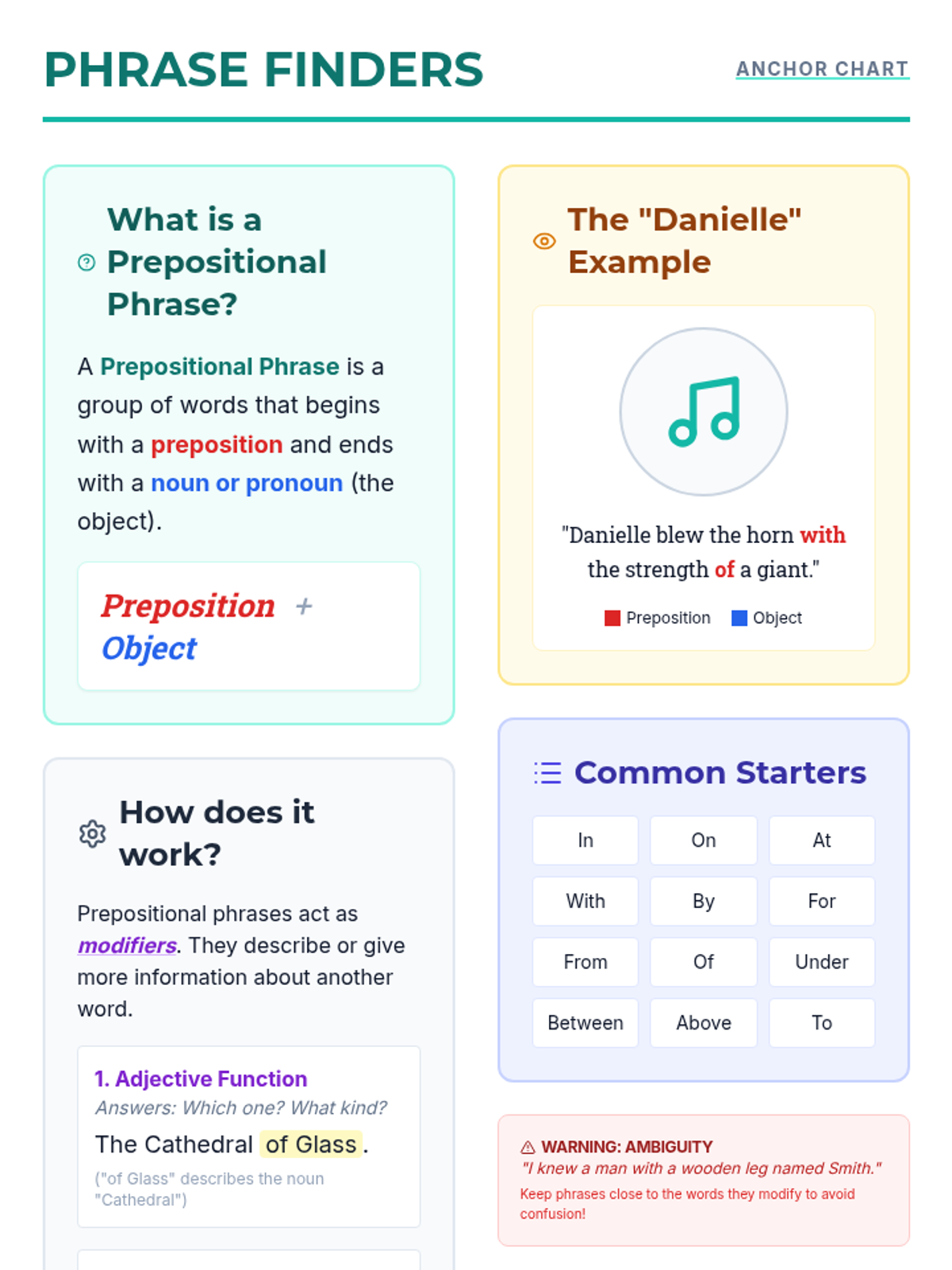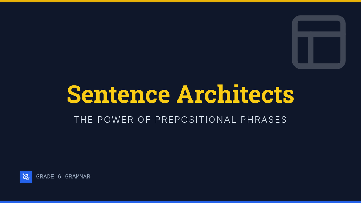 A visual-first lesson on sentence structure focusing on prepositional phrases. Students use 'Grammar Graffiti'—a combination of diagramming and doodling—to visualize how phrases modify nouns and verbs, inspired by Khan Academy's instructional style.