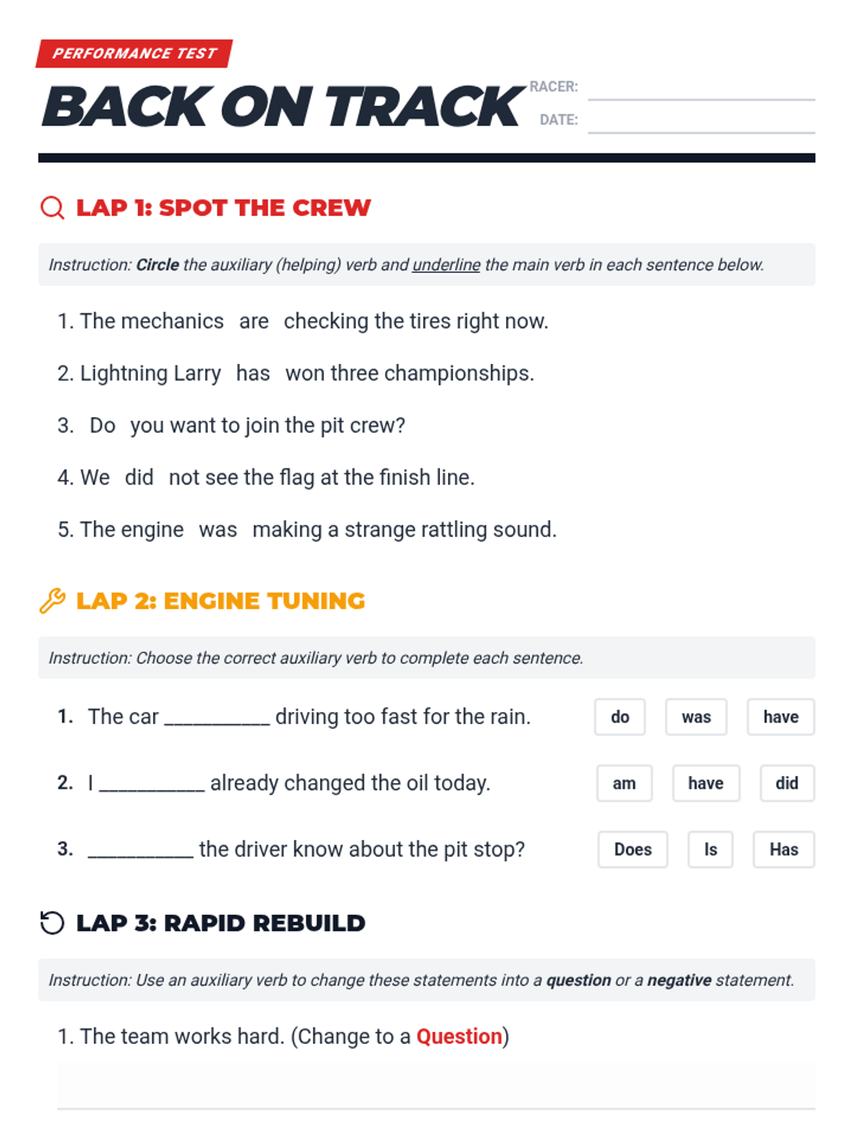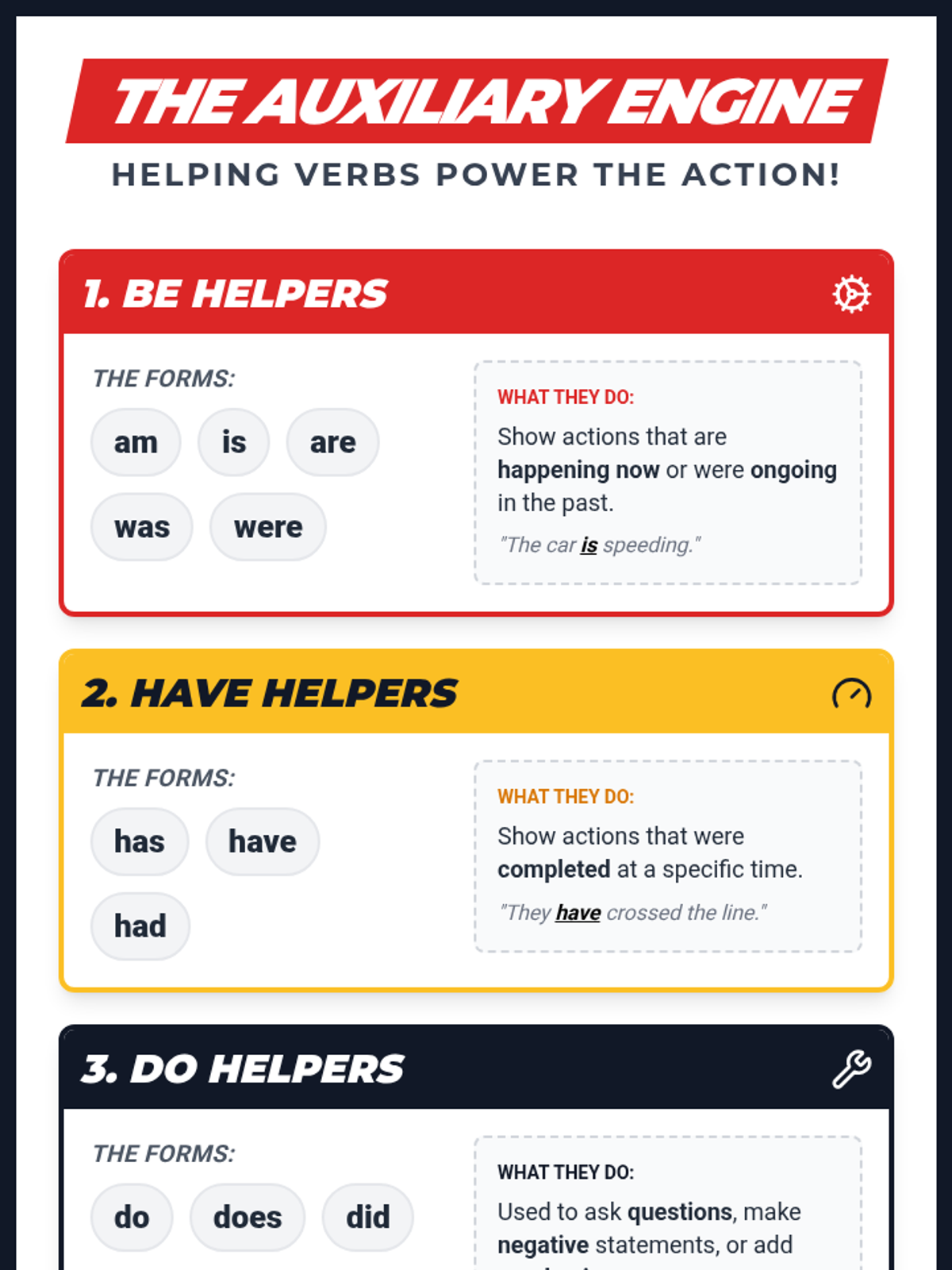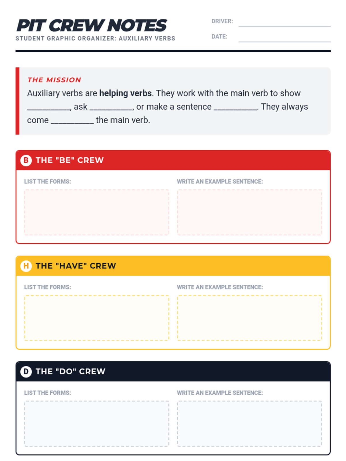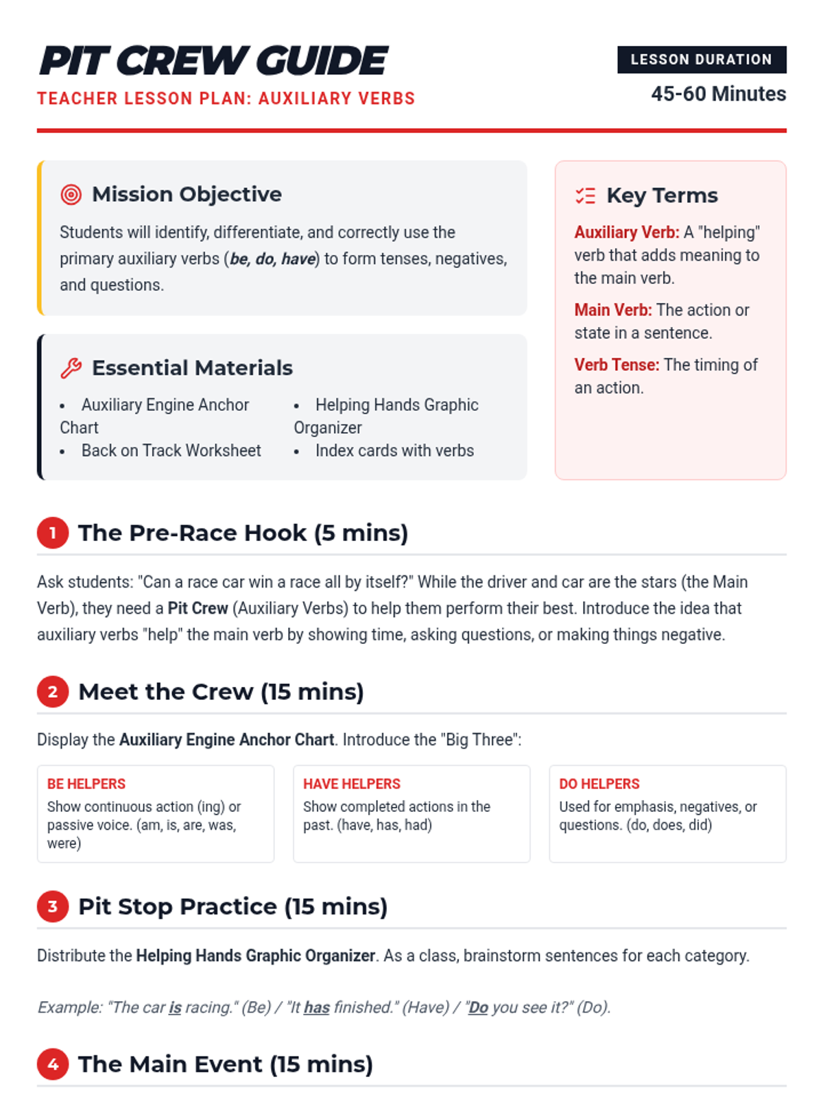 A comprehensive lesson on auxiliary verbs (be, do, have) using a 'Verb Pit Crew' theme to explain how helping verbs support main verbs in sentences. Includes a detailed lesson plan, anchor chart, graphic organizer, and practice worksheet.