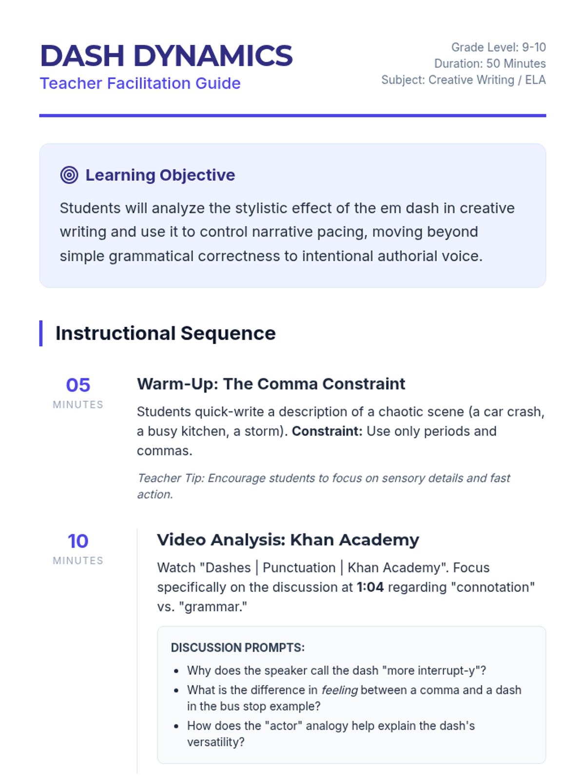 A creative writing lesson for 9th-10th graders focusing on the stylistic use of the em dash to control narrative pacing and create emotional impact. Students transition from traditional punctuation to using dashes to mimic chaotic scenes.