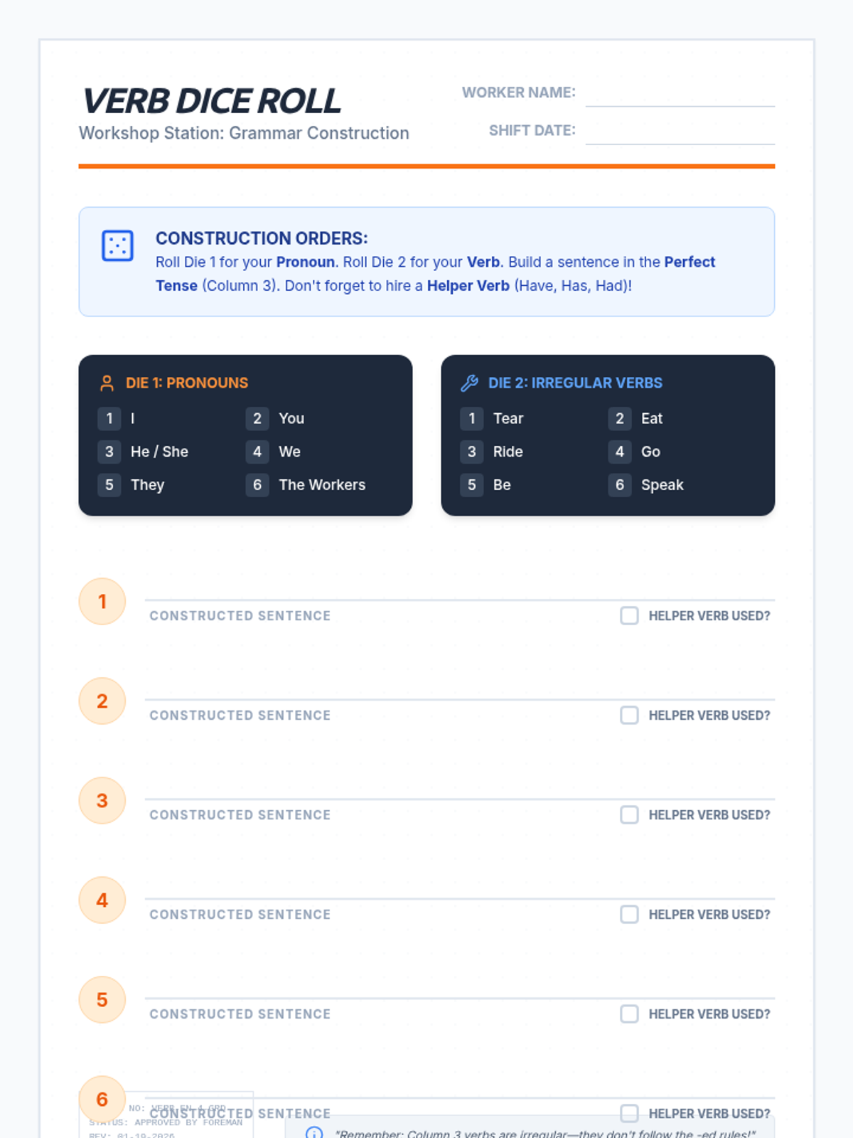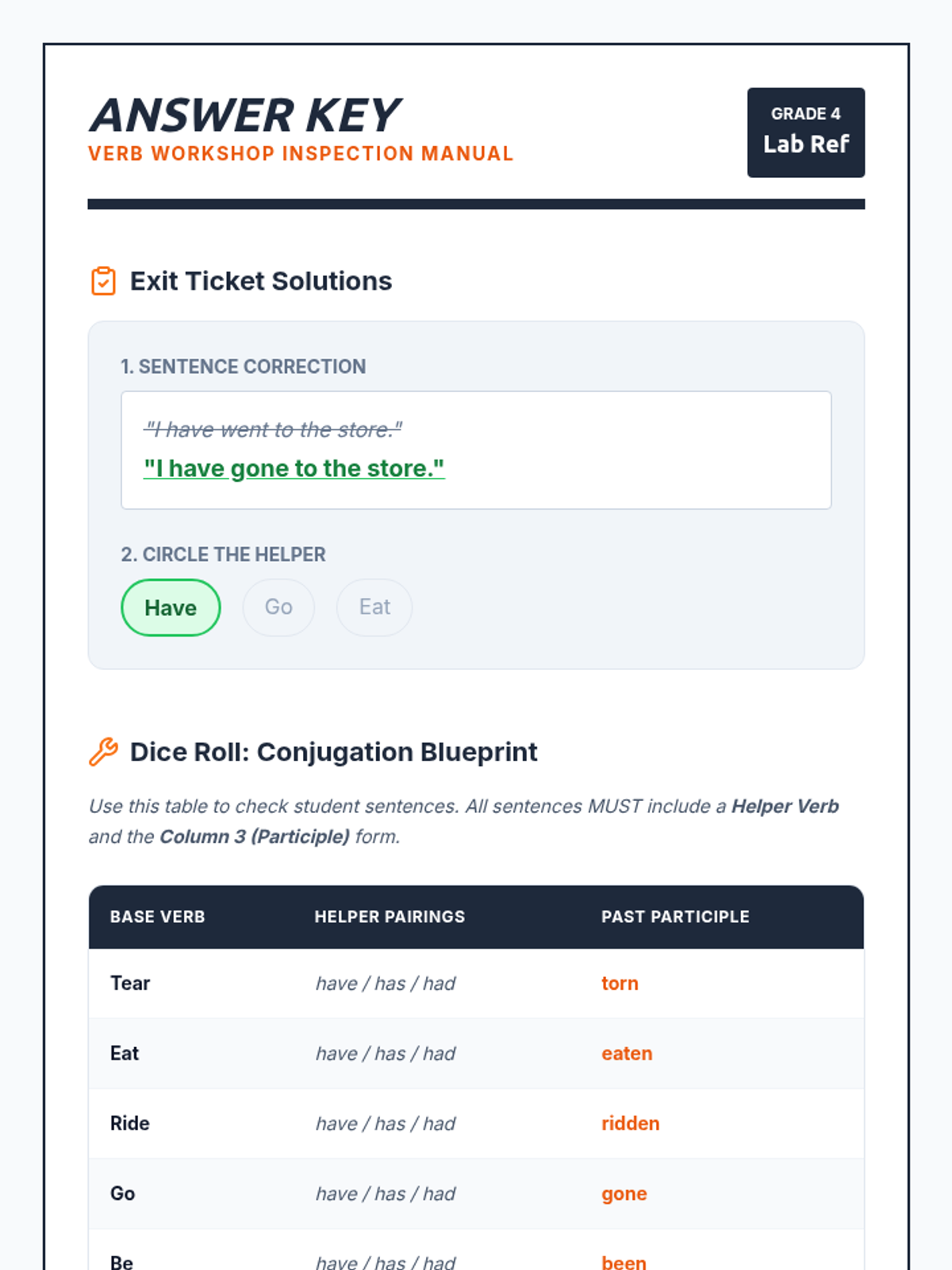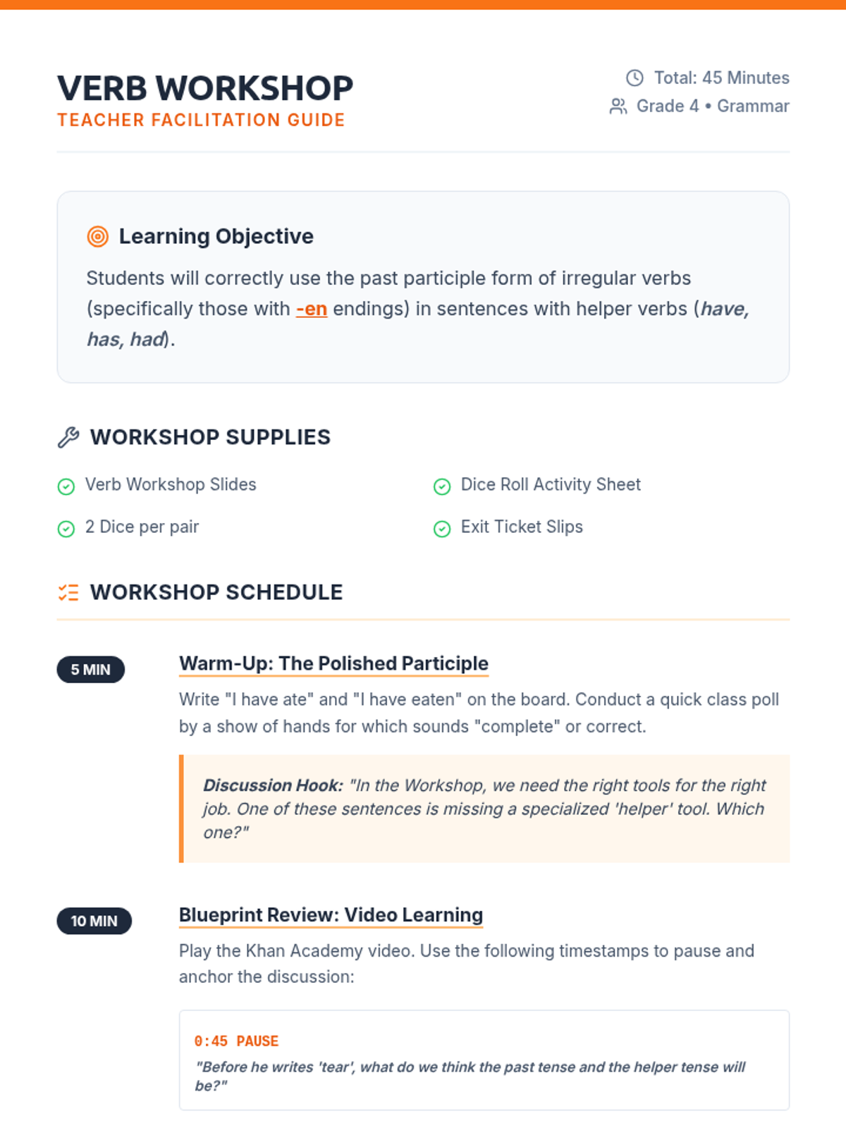 Students will learn to identify and use the past participle form of irregular verbs (specifically those ending in -en) using helper verbs (have, has, had) through a video-led discussion and a hands-on dice rolling activity.