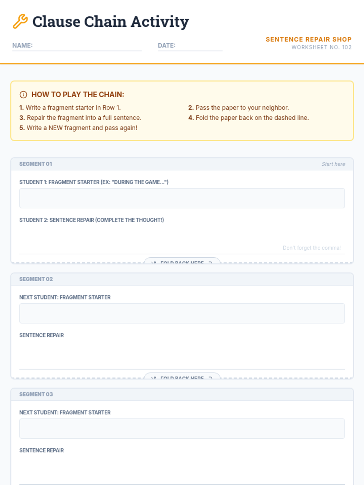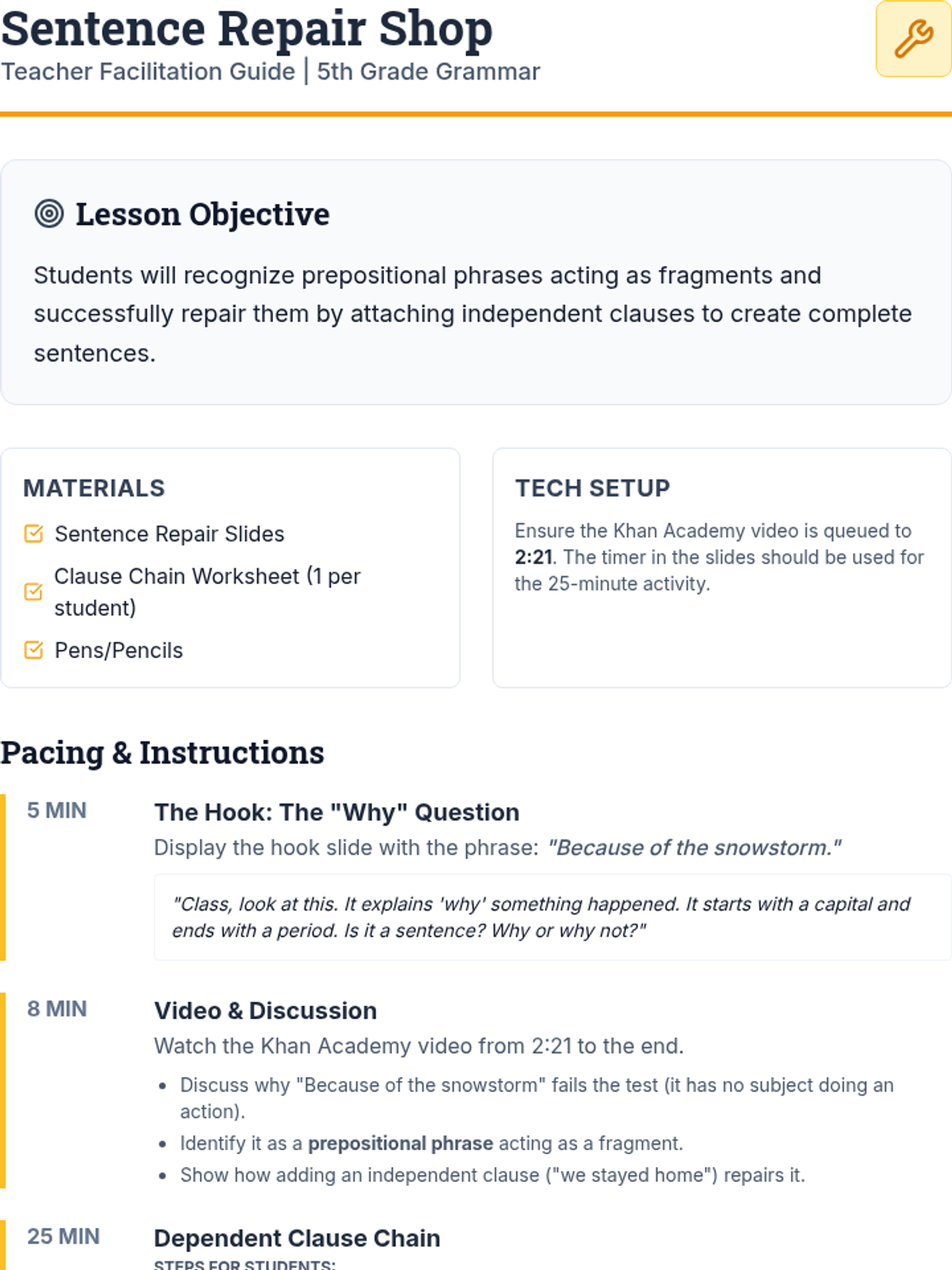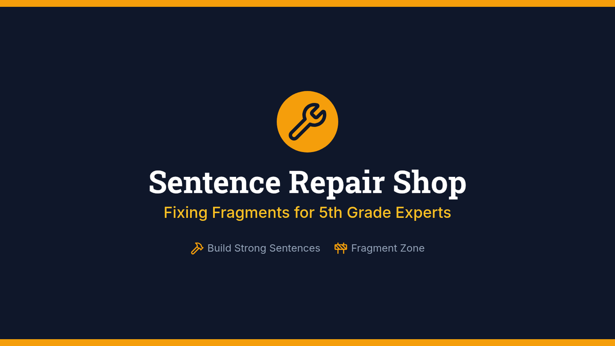 A 5th-grade grammar lesson focused on identifying sentence fragments (specifically prepositional phrases) and repairing them by attaching independent clauses. Through a collaborative folding-paper activity, students practice turning fragments into complete sentences.