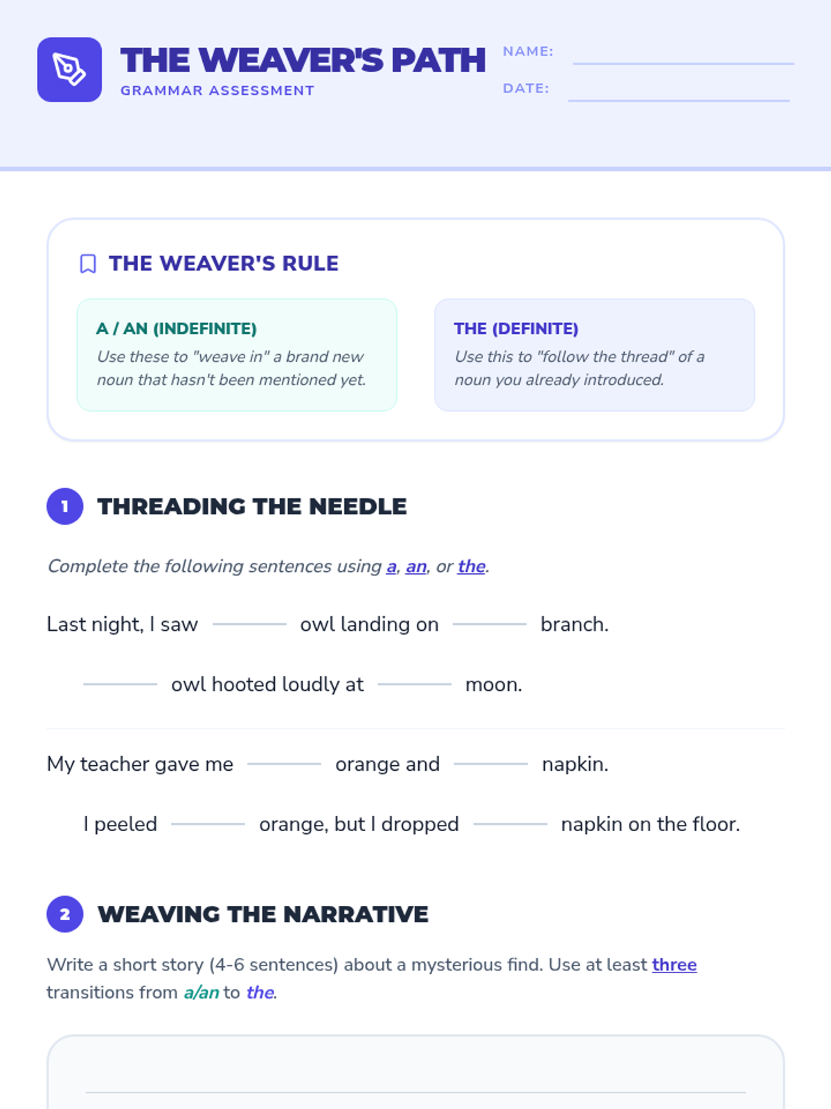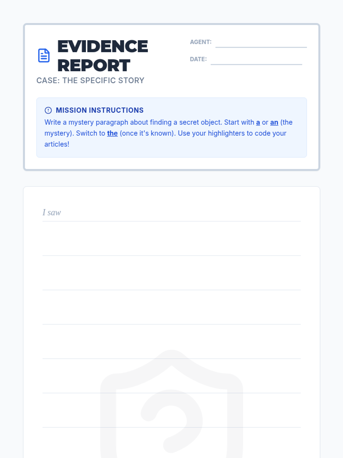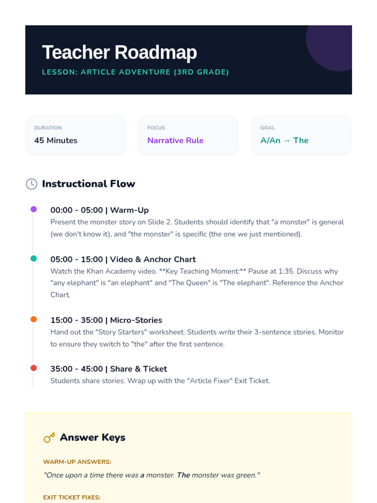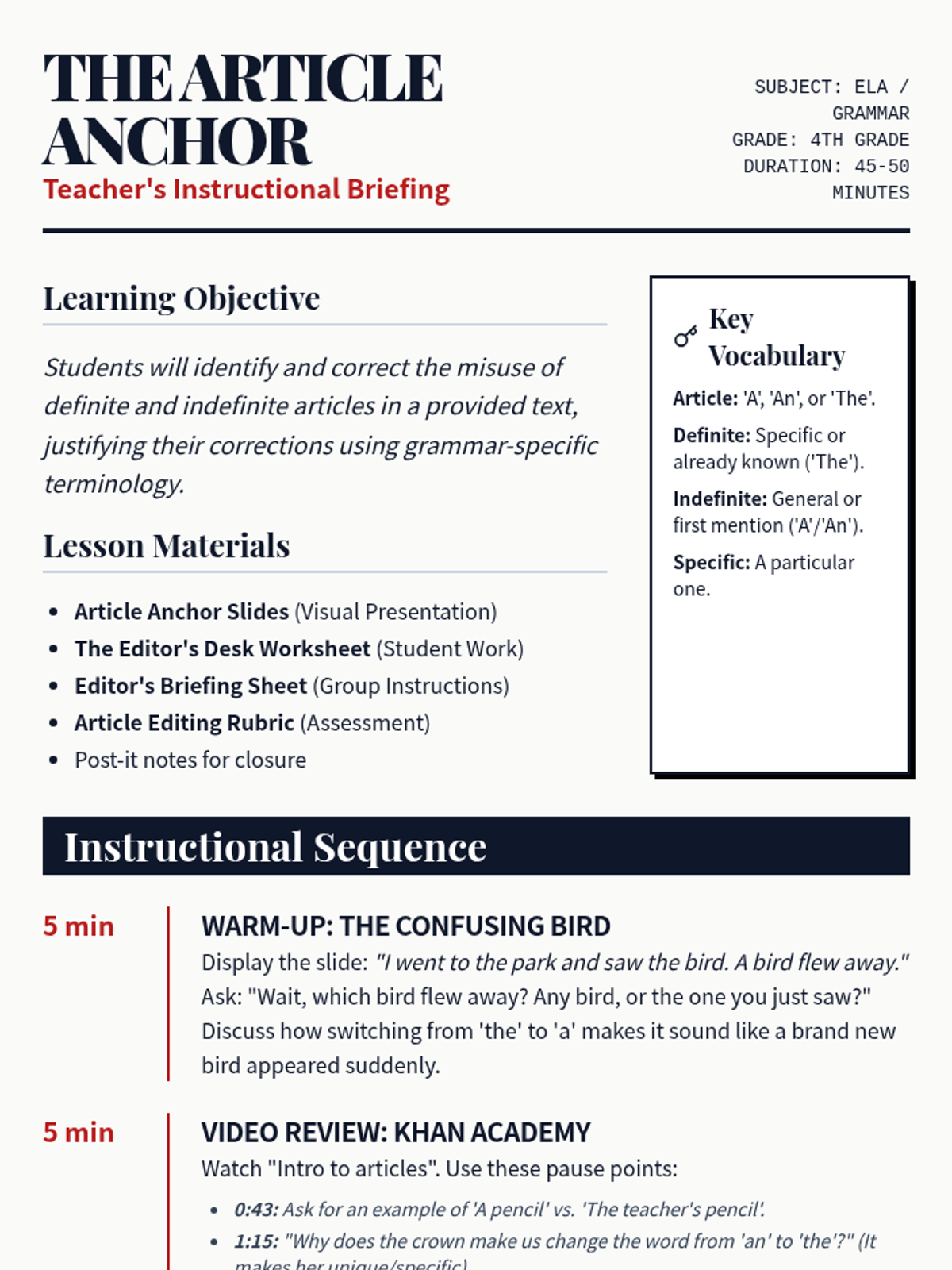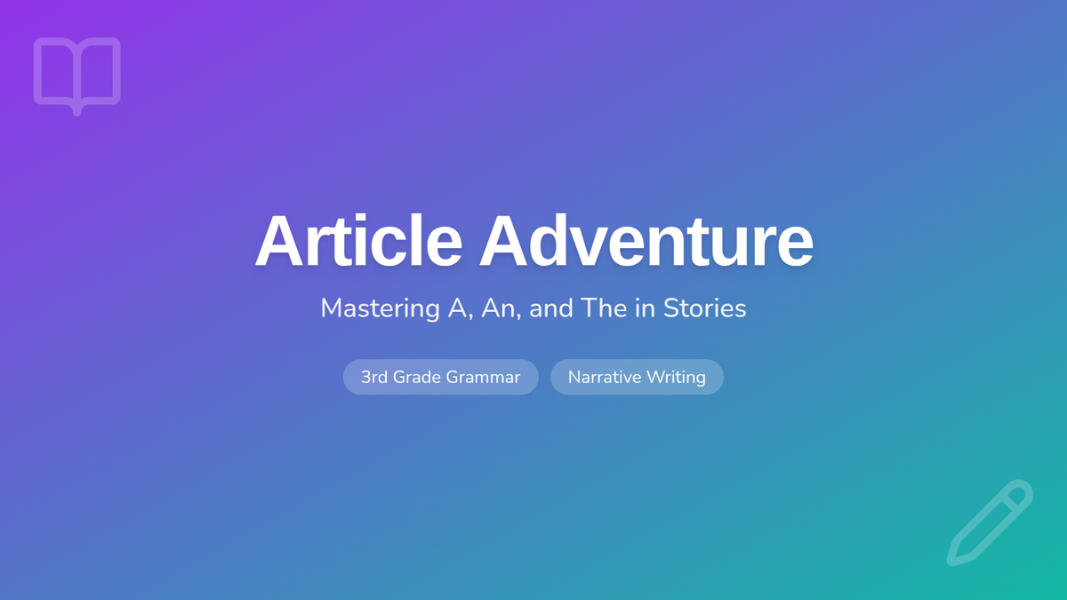 A 3rd-grade lesson focusing on the use of indefinite (a, an) and definite (the) articles to create clarity and suspense in creative writing. Students watch an instructional video, analyze specific examples, and write a mystery paragraph using the 'Article Switch' technique.