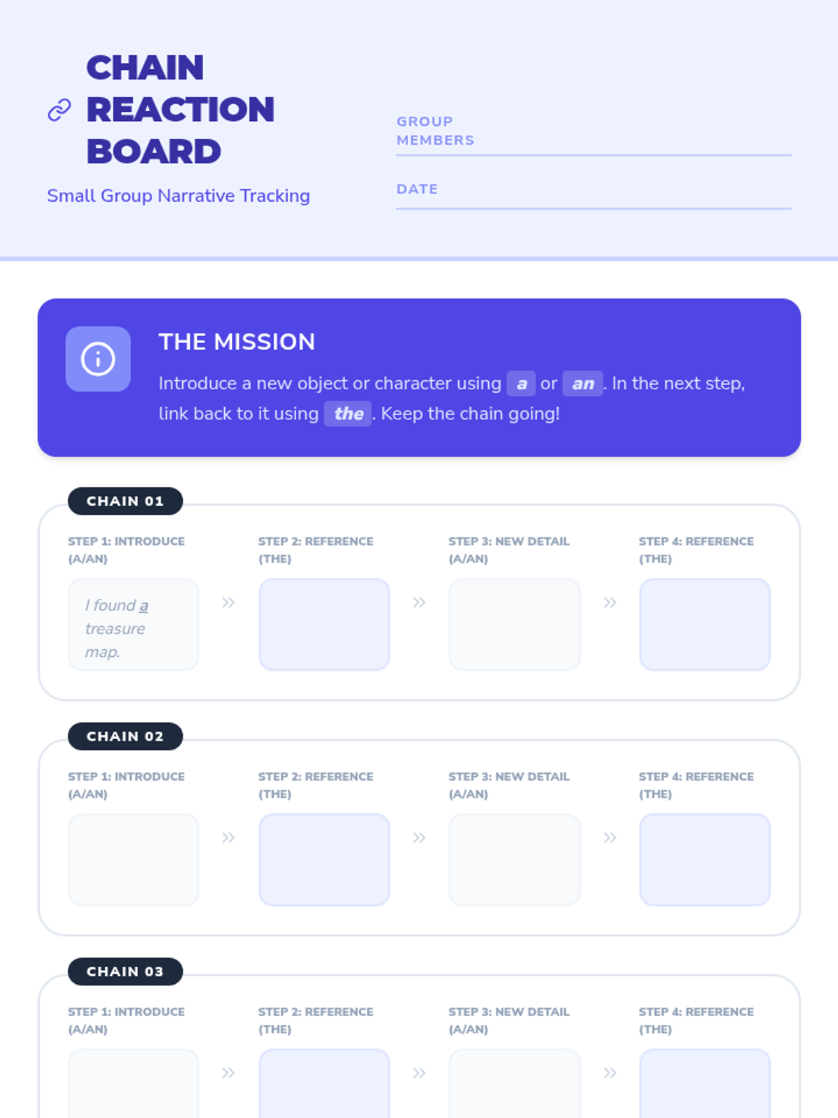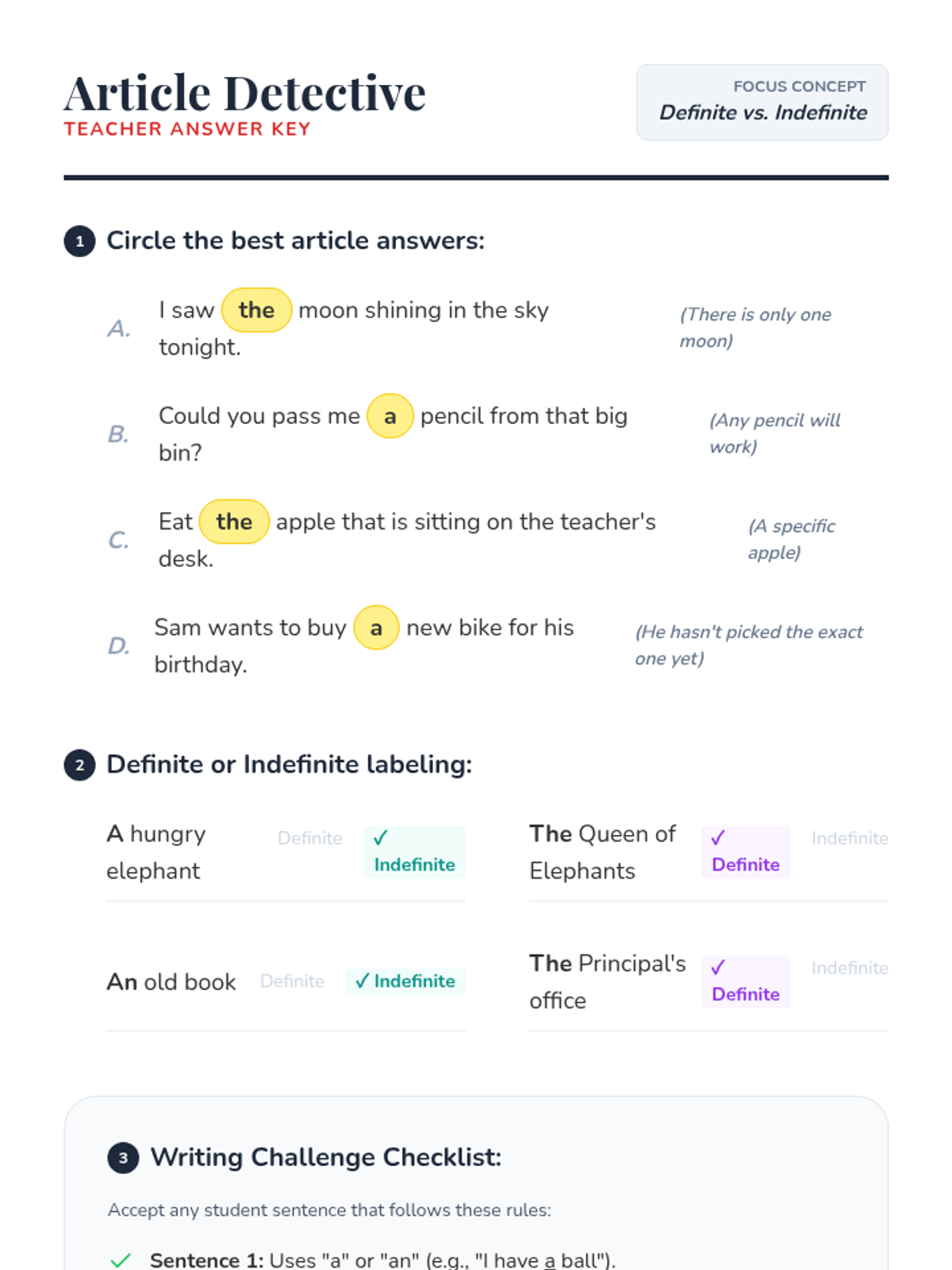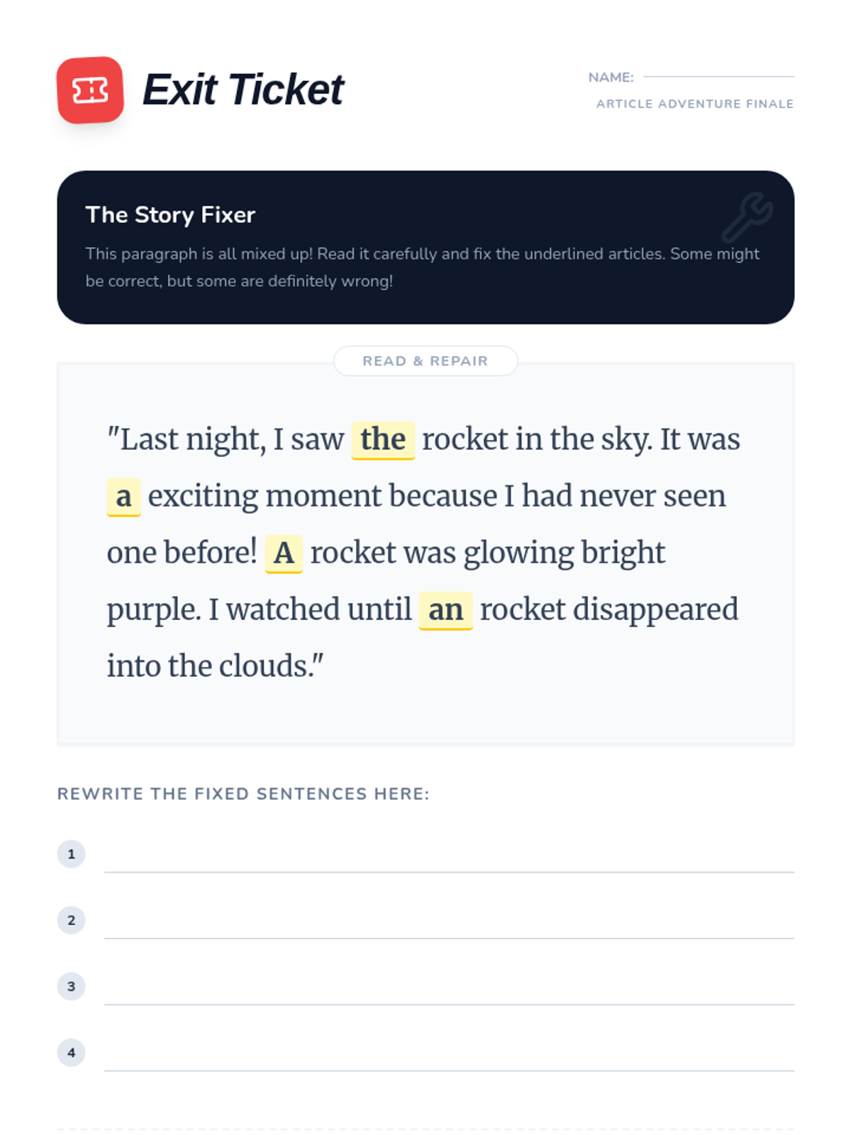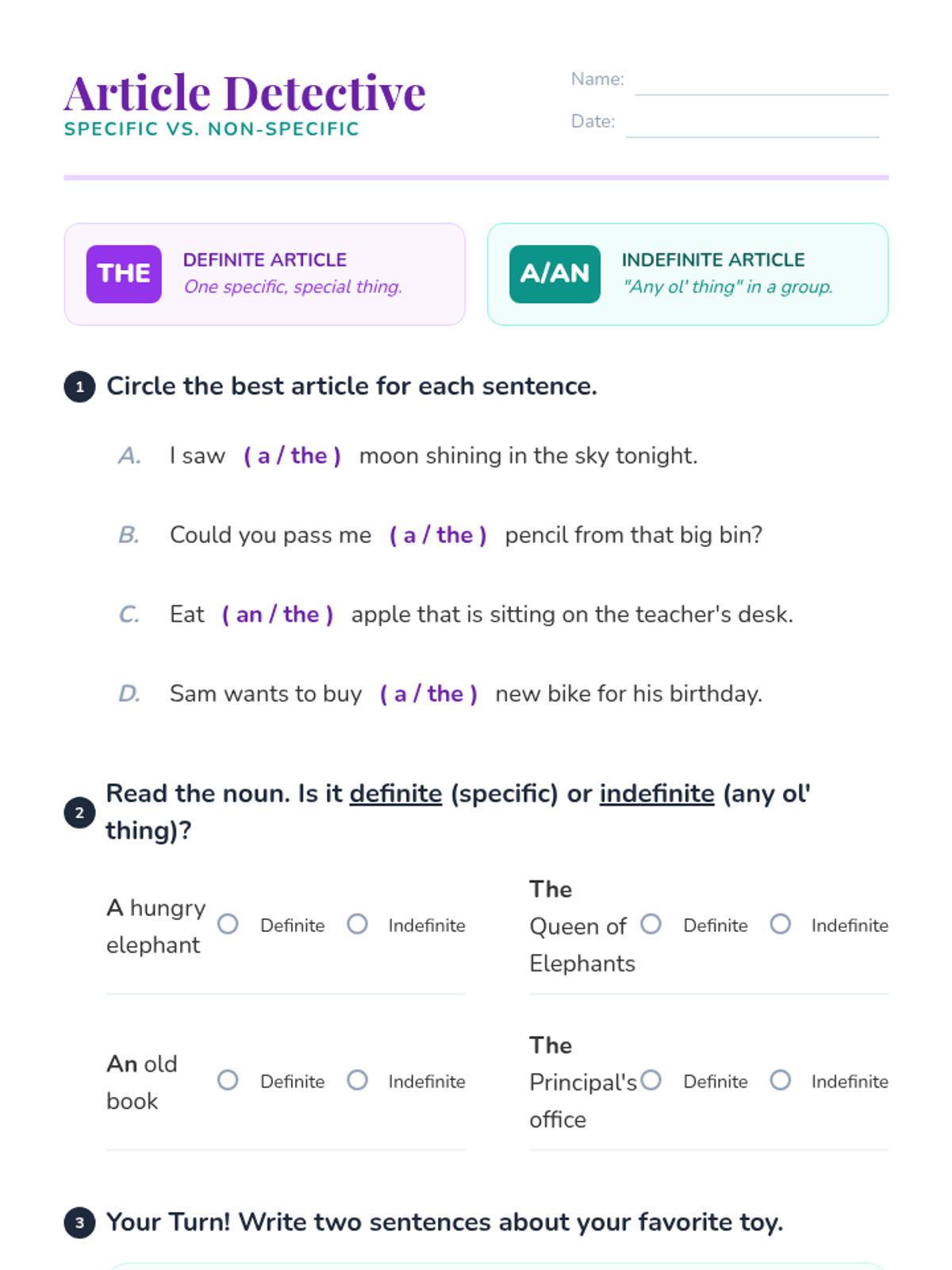 A 3rd-grade lesson focusing on the use of indefinite (a, an) and definite (the) articles to create clarity and suspense in creative writing. Students watch an instructional video, analyze specific examples, and write a mystery paragraph using the 'Article Switch' technique.