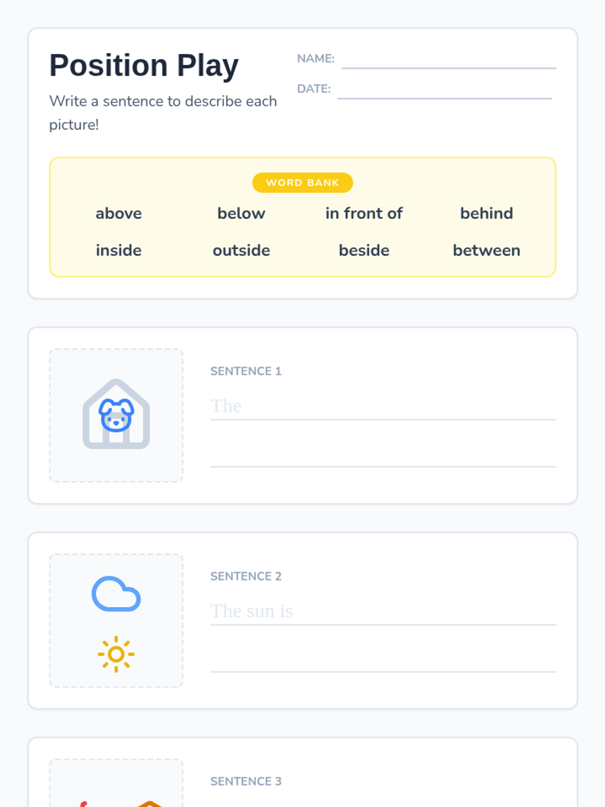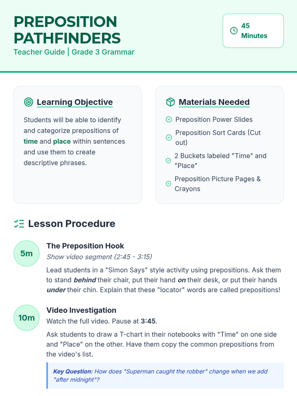 A hands-on lesson for 3rd graders to master prepositions of time and place using physical movement, video analysis, and a sorting activity. Students will explore how these phrases add specific detail to simple sentences.