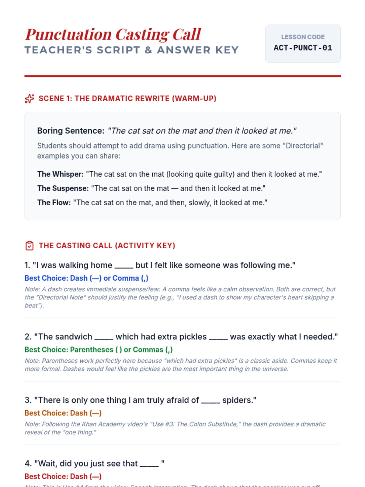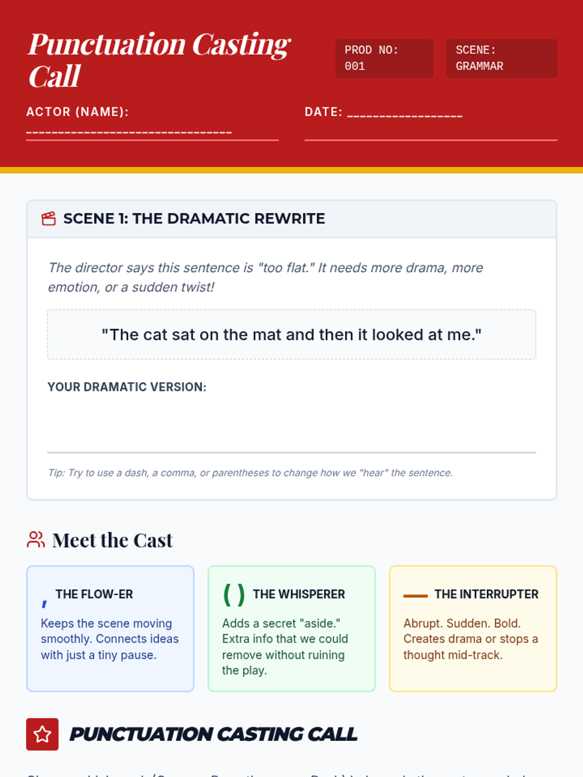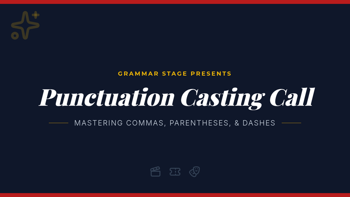 A middle school lesson exploring the stylistic and functional differences between commas, parentheses, and dashes using a theatrical 'Casting Call' metaphor. Students analyze how punctuation choices act like actors on a stage to change the tone and flow of sentences.