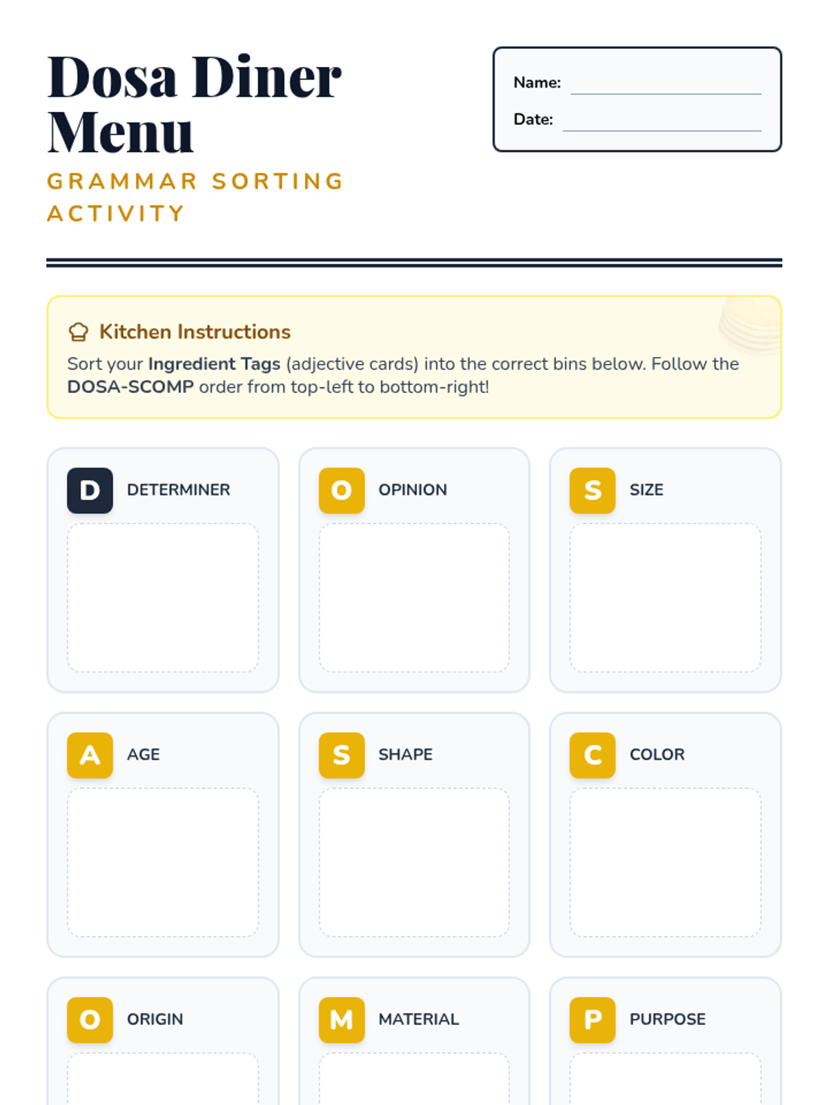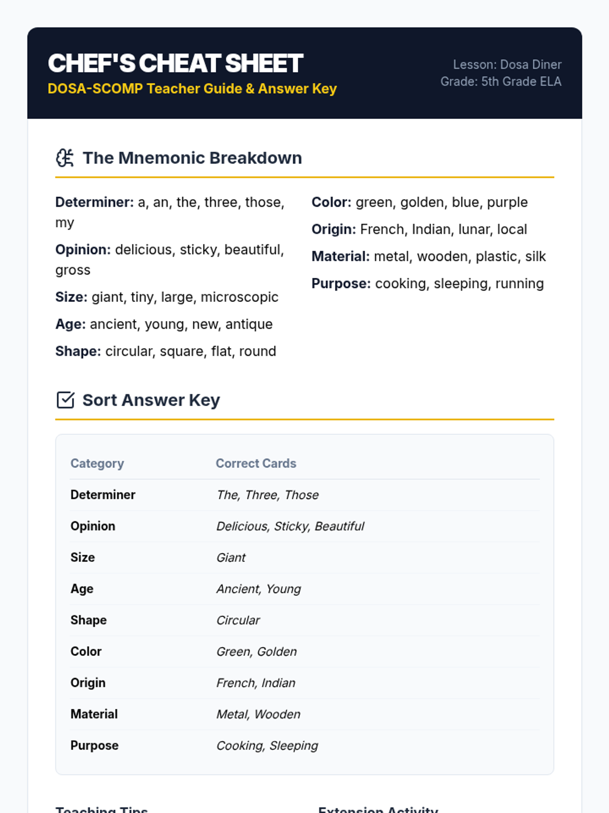 Students learn the DOSA-SCOMP mnemonic to master adjective order and understand when to use commas with coordinate adjectives. The lesson includes a warm-up, video analysis, sorting activity, and creative closure.