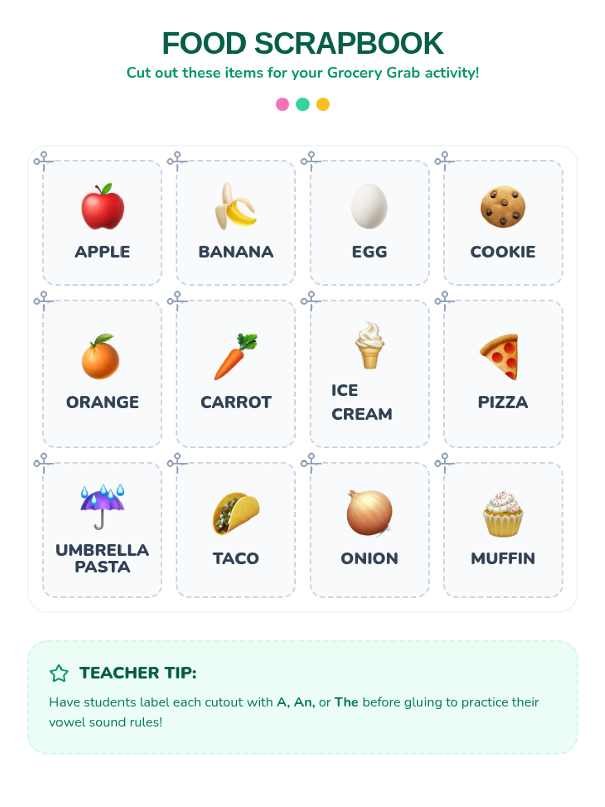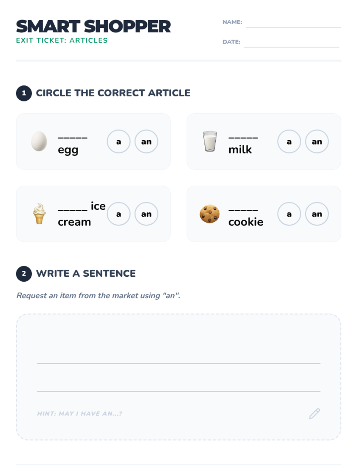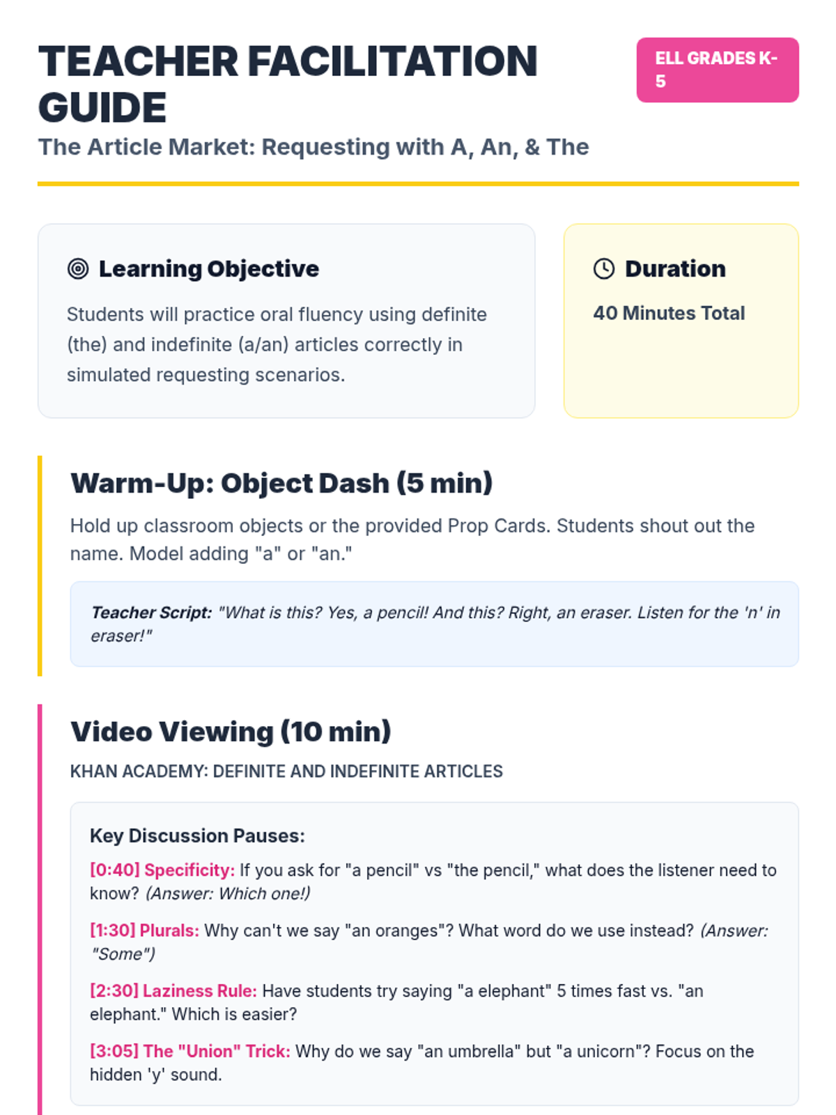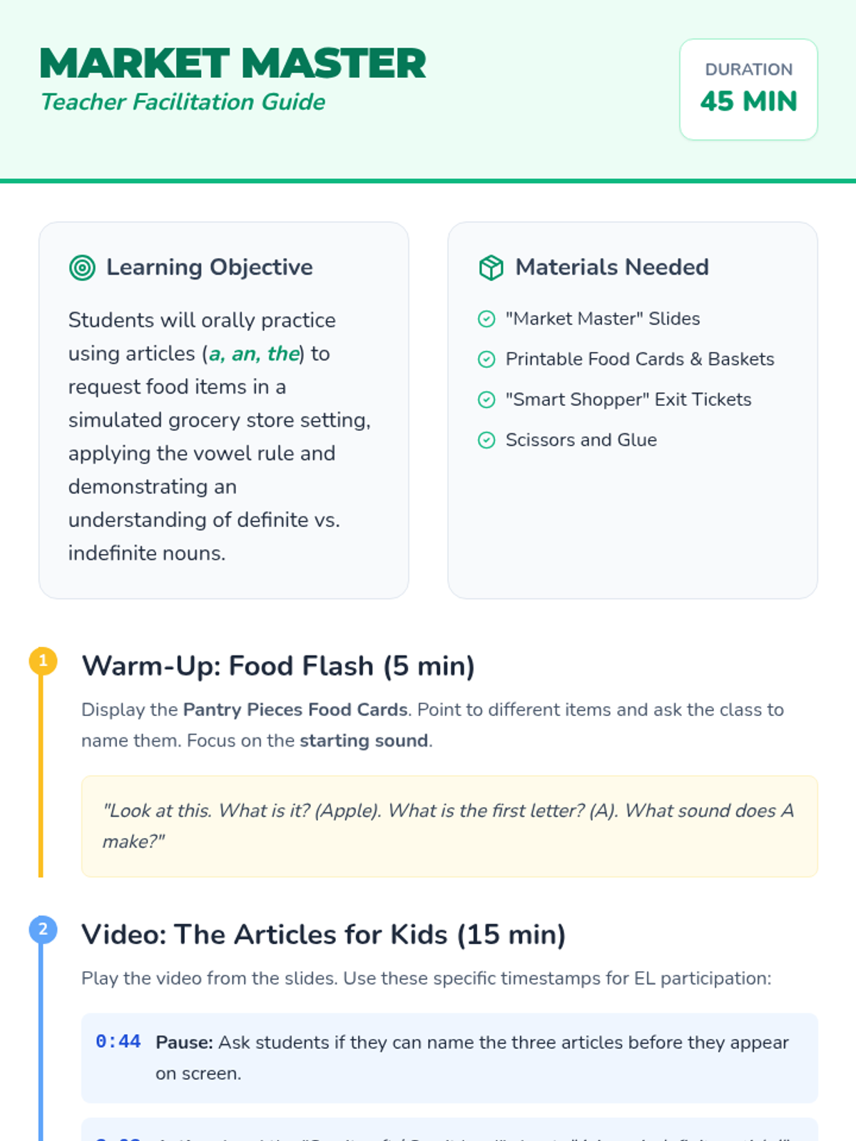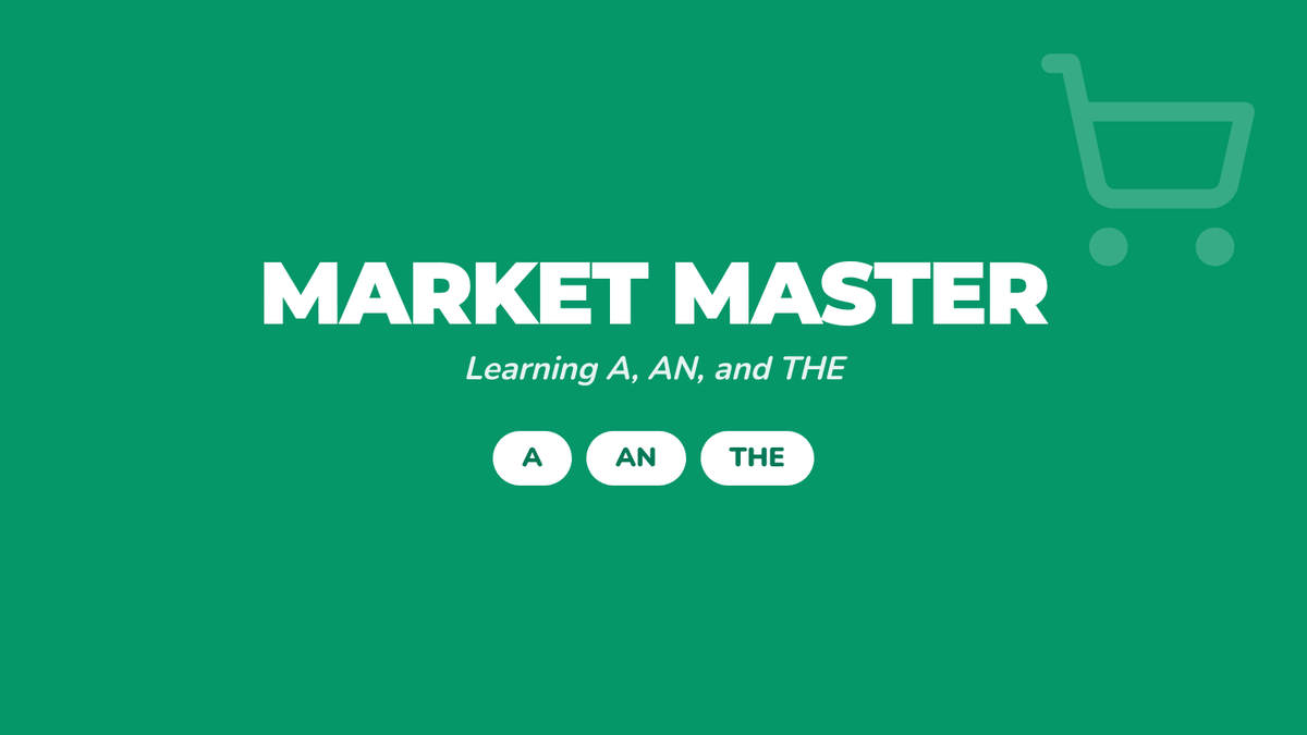 An interactive ESL/ELL lesson for elementary students focusing on the correct oral and written use of articles (a, an, the) within a grocery store roleplay context. Students learn the vowel rule for 'an' and the specificity of 'the' through a guided video and hands-on market activity.