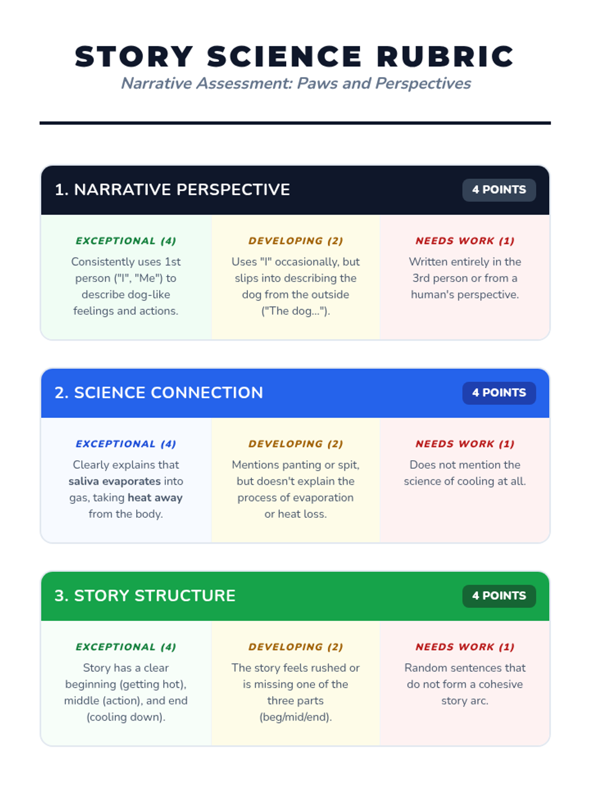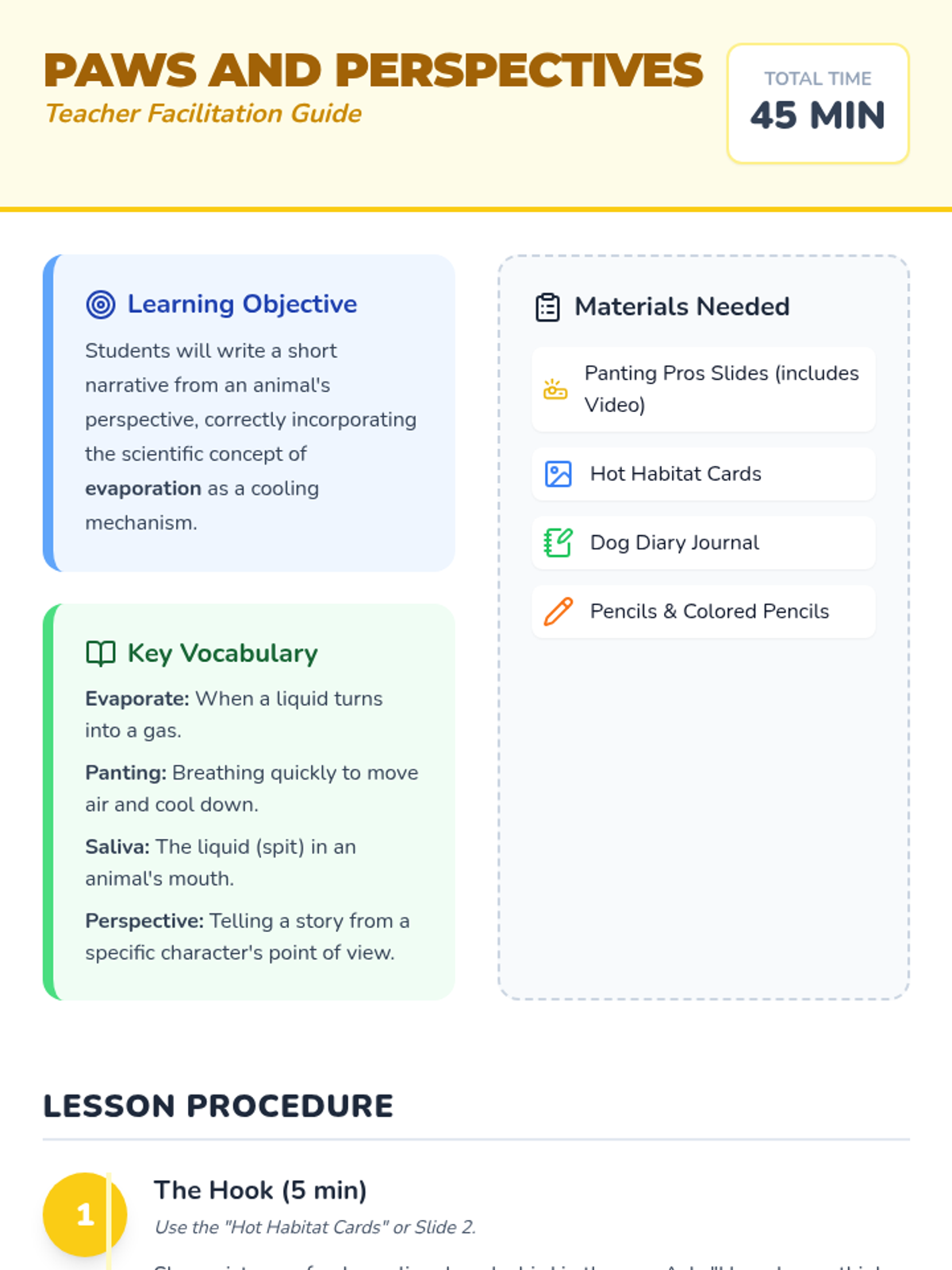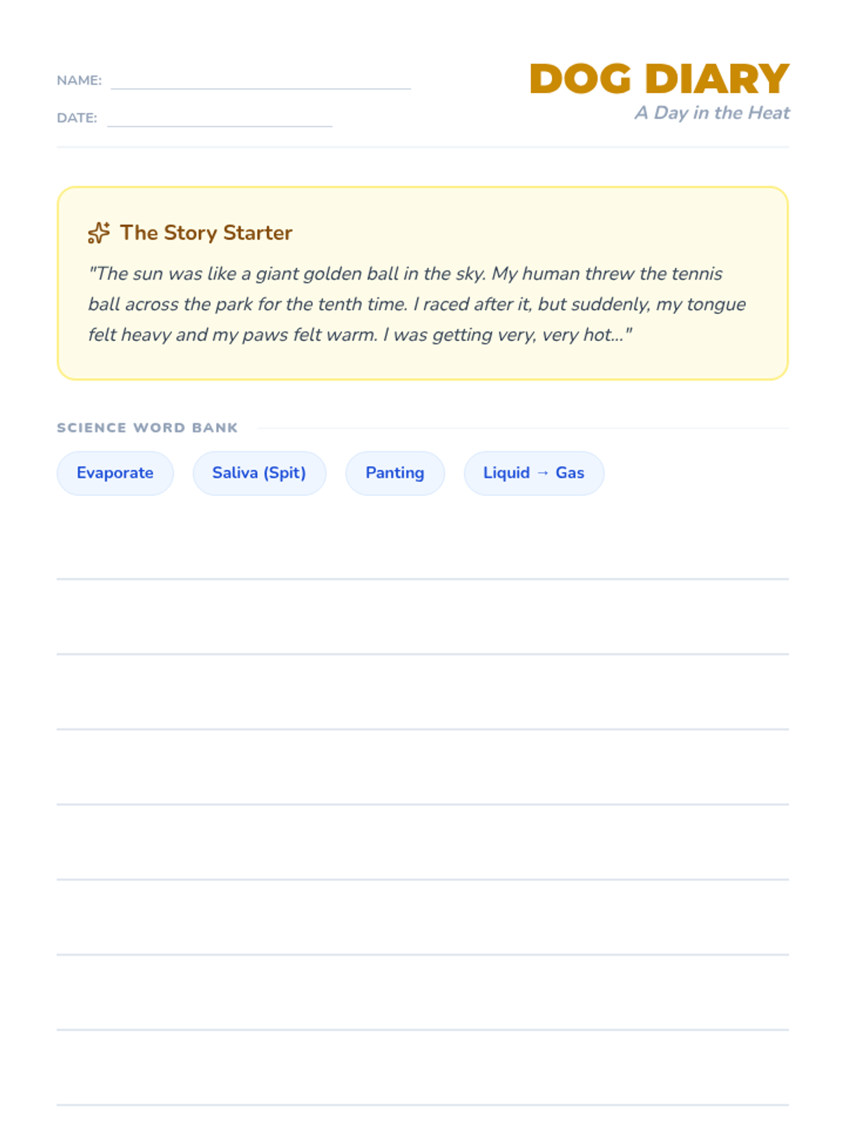 Students explore how animals cool down in the heat, specifically focusing on how dogs use panting and evaporation. They then apply this scientific knowledge by writing a creative narrative from a dog's perspective.