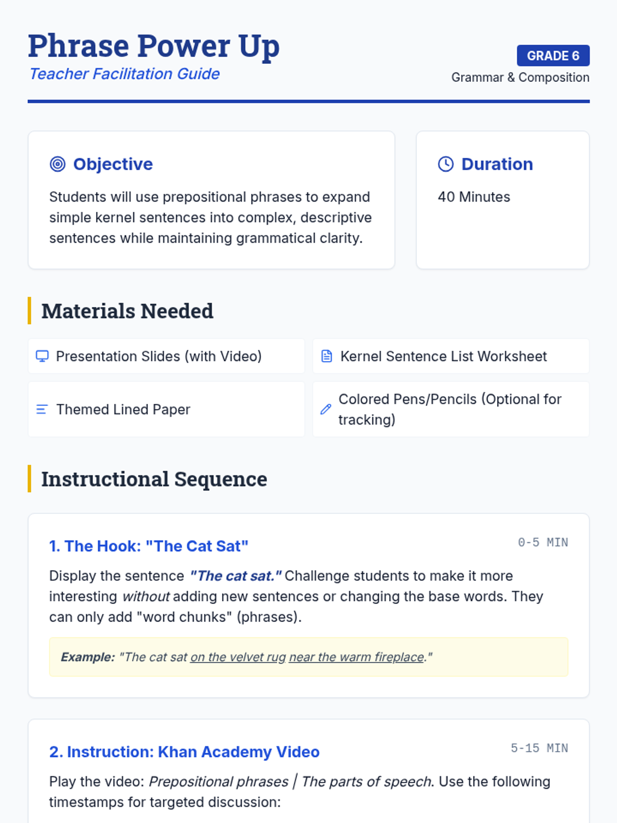 Students will learn how to use prepositional phrases to transform simple 'kernel' sentences into descriptive, complex thoughts. The lesson includes a presentation with an embedded Khan Academy video and a collaborative 'sentence passing' activity.