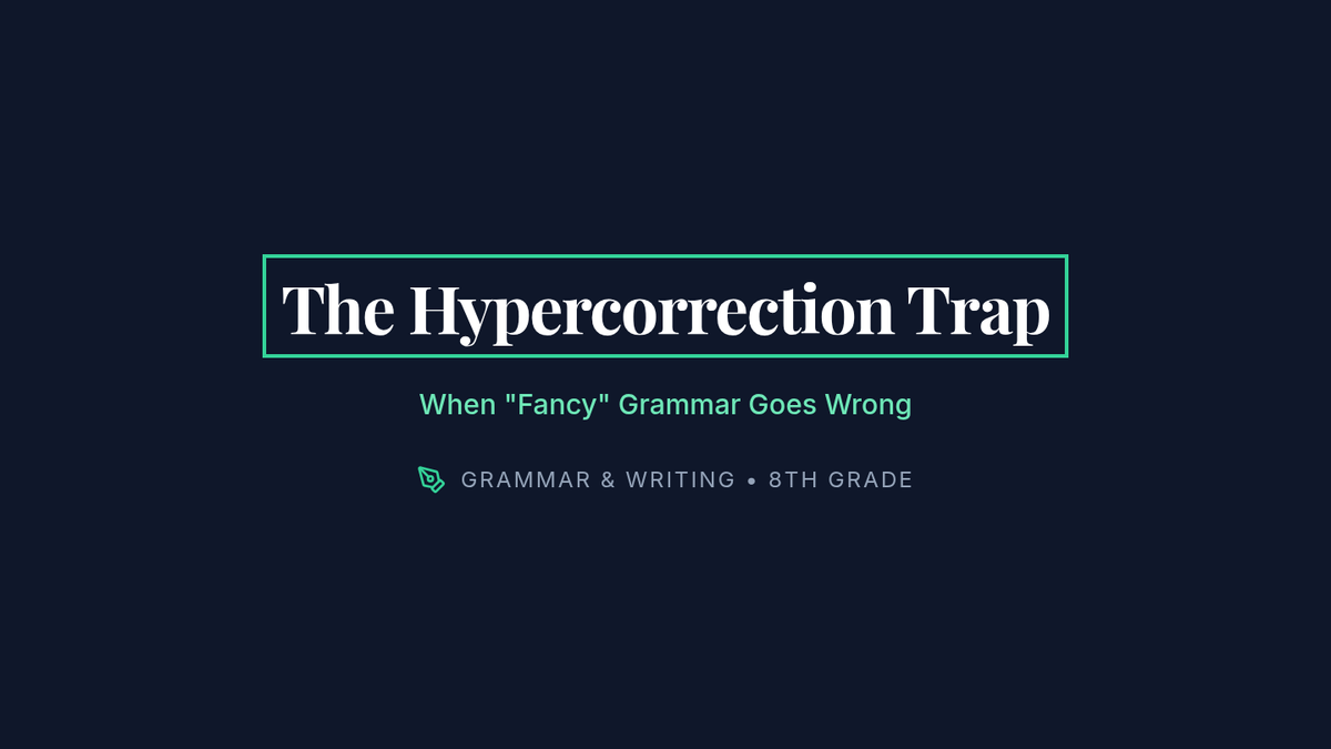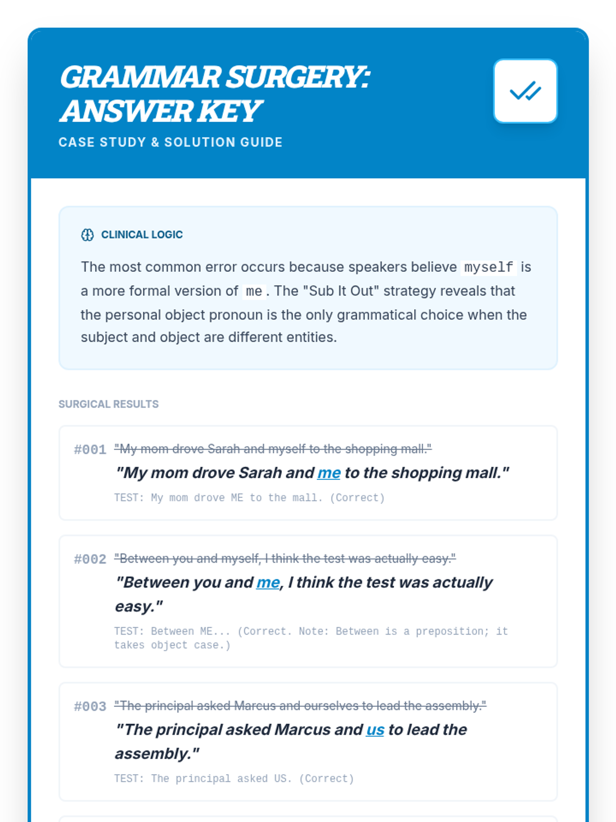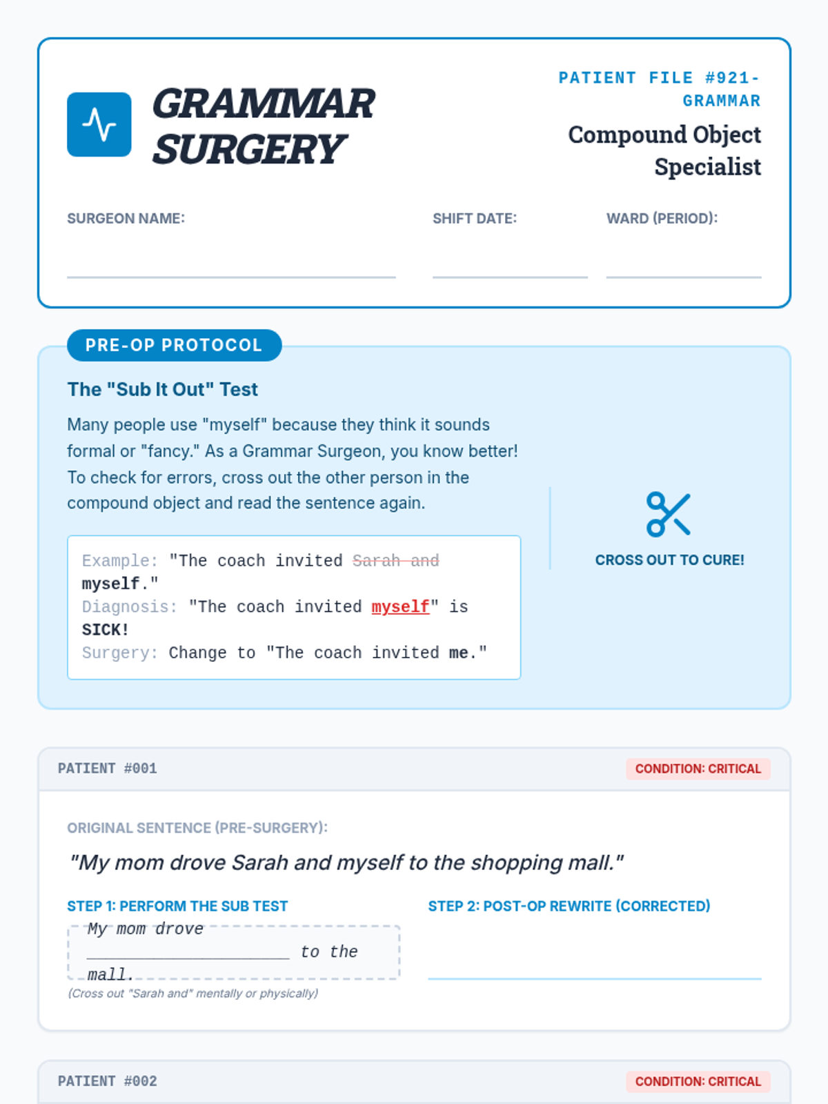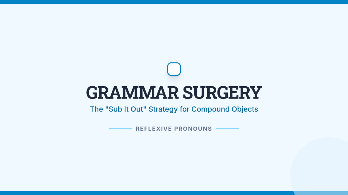 A grammar lesson for 7th graders focused on correcting the 'hyper-formal' misuse of reflexive pronouns (myself) in compound objects using the 'Sub it out' substitution strategy. Students act as 'grammar surgeons' to diagnose and fix errors in seemingly formal sentences.