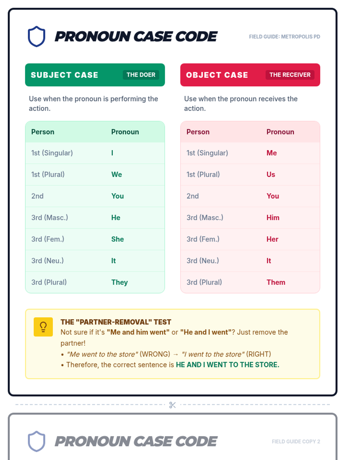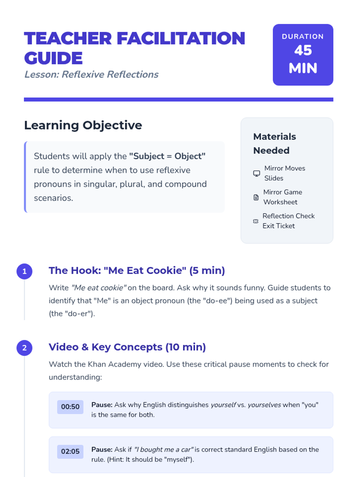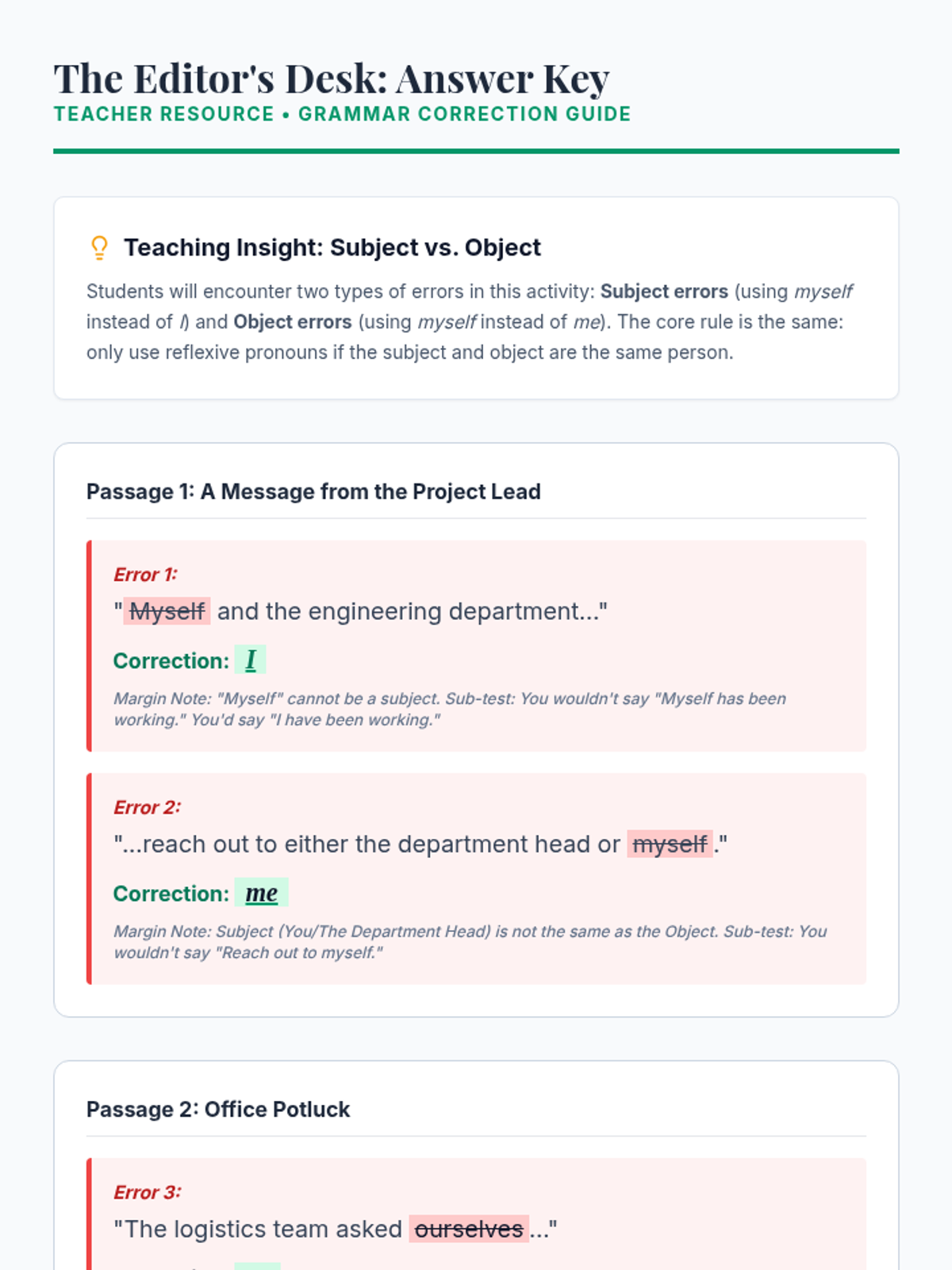 A grammar lesson for 7th graders focused on correcting the 'hyper-formal' misuse of reflexive pronouns (myself) in compound objects using the 'Sub it out' substitution strategy. Students act as 'grammar surgeons' to diagnose and fix errors in seemingly formal sentences.